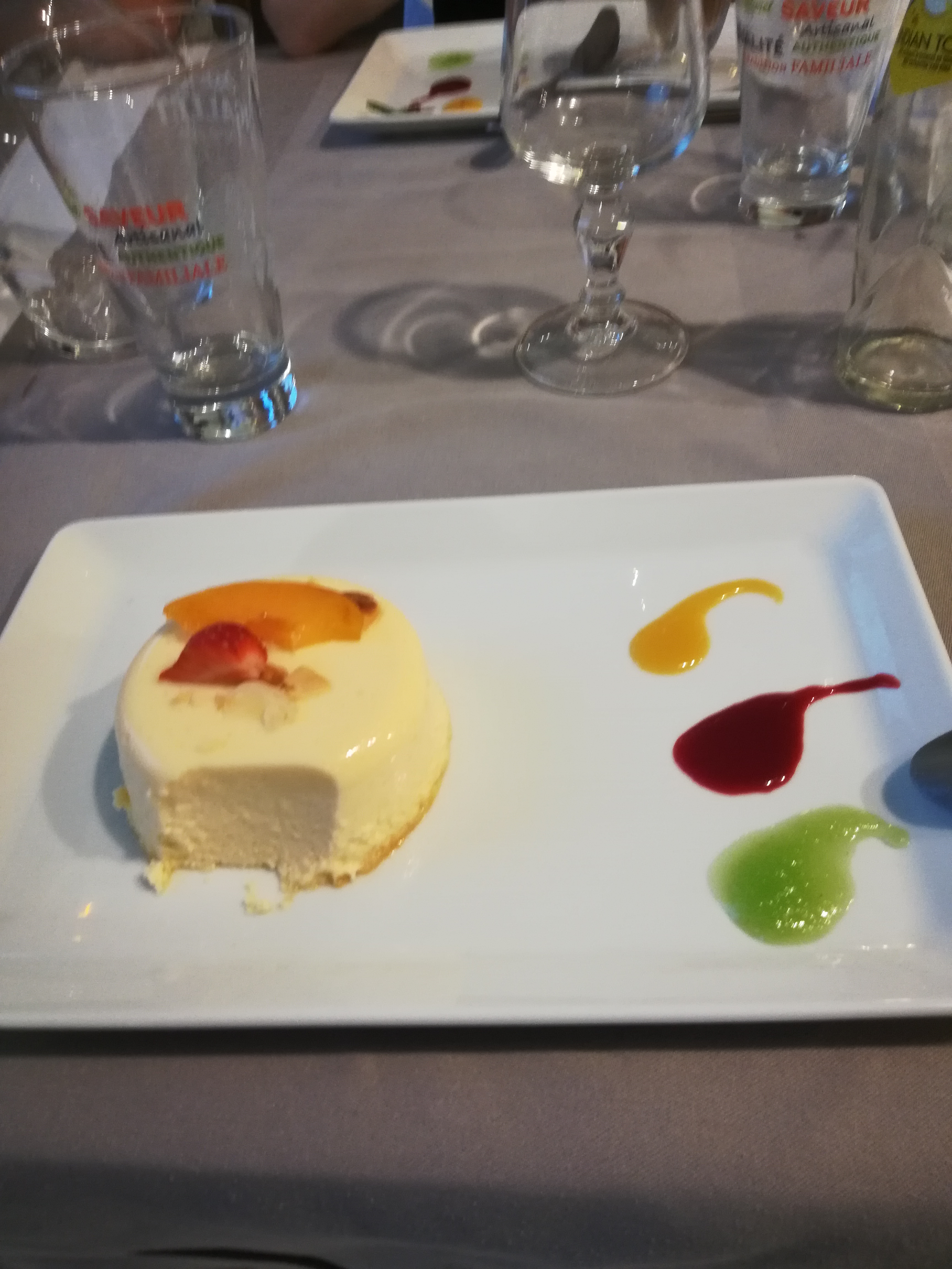 Déjeuner à midi, simple, sans extravagance, service un peu long. Dessert salade fruit servis dans une coupe avec un fond de jus d'orange, un vraie jus de fruits avec ceux servis aurait été préférable.