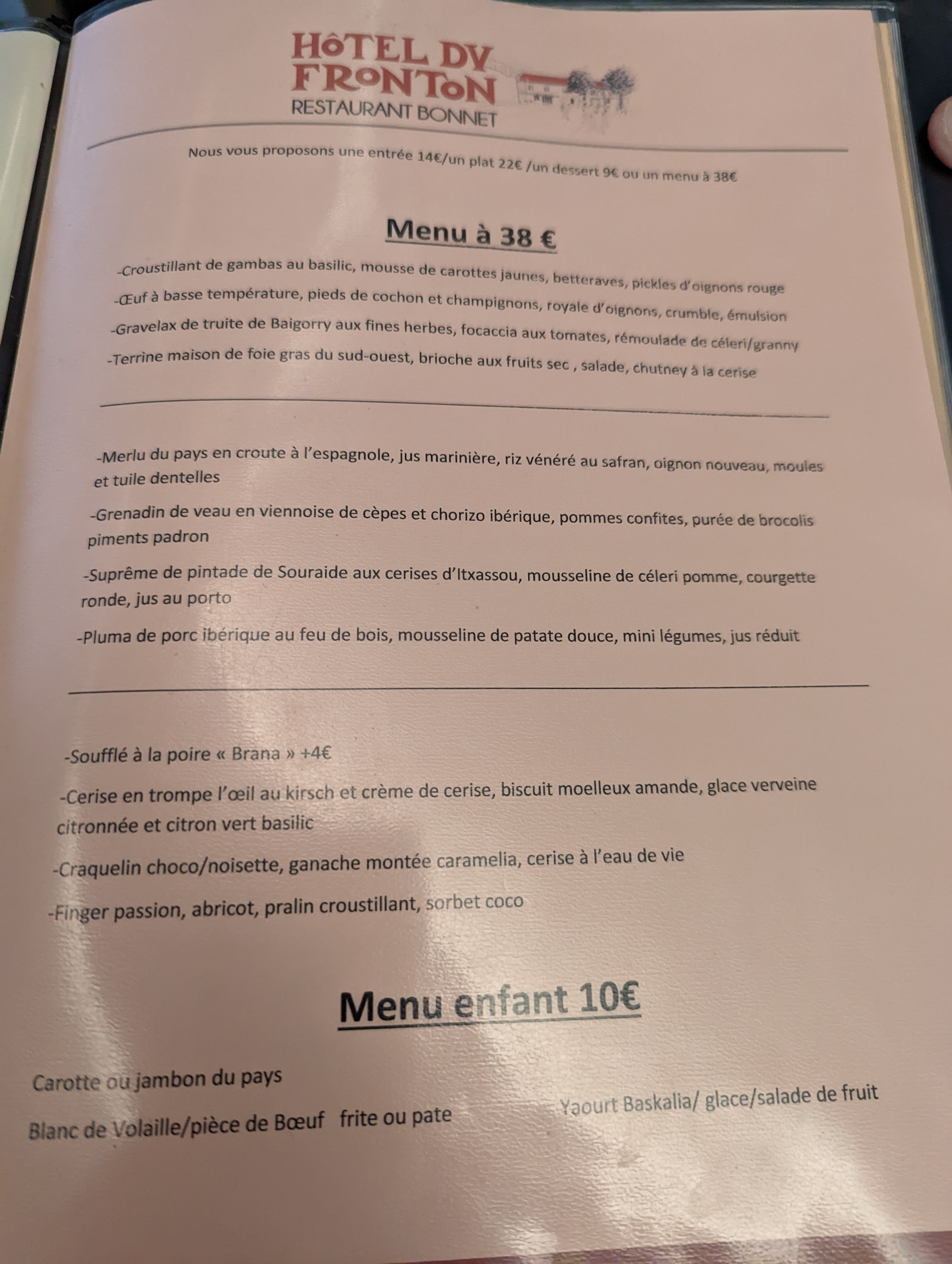 Nous sommes venus à 8 fêter les 50 ans de mariage de mes beaux parents. Nous avons été bien accueillis dans un cadre splendide avec vue sur les Pyrénées. Mise en bouche : velouté de poireaux et toasts grillés aux chichons de canard. Très bon départ ! Ma fille a pris le menu enfant à 12€ : carottes râpées, pièce de bœuf/frites et deux boules de glaces au chocolat. Elle s'est régalée et c'est assez copieux. Mon fils a pris le menu à 28€ avec la piperade basquaise/crumble chorizo, jaune d'oeuf confis, médaillon de boeuf braisé/pommes confites et pour finir mousse tiède au chocolat. Repas savoureux et copieux. Les 6 adultes ont pris le menu à 38€. Entrées Croustillant de gambas/légumes marinés/sorbet piquillos. Ma femme a beaucoup apprécié. Oeuf basse cuisson/cromesquis de pieds de porc, cèpes/émulsion d'ail. Cuisson parfaite et explosion de saveurs. Plats Merlu de St Pée/bihia de petits légumes/duo de courgettes et voile de crustacés. Excellent plat avec une cuisson incroyable du poisson. Pluma de cochon ibérique cuite au feu de bois/mousseline de patates douces/pleurotes et pommes macaires. Un mélange parfaitement équilibré avec de nombreuses saveurs. Les champignons étaient excellents. Desserts Soufflé à la poire Brana. Dessert fort en goût et très léger accompagné par sa madeleine. Biscuit imbibé/fraises/sorbet fraises/crémeux citron et ganache montée mascarpone. Un dessert peu sucré pour beaucoup de fraîcheur. Finger caramelia/pralin croustillant noisette/ganache guanaja et sorbet abricot. Un bel équilibre de saveur entre le praliné et le fruit. Fromage de brebis et confiture de cerises. Un excellent repas sans aucun bémol !