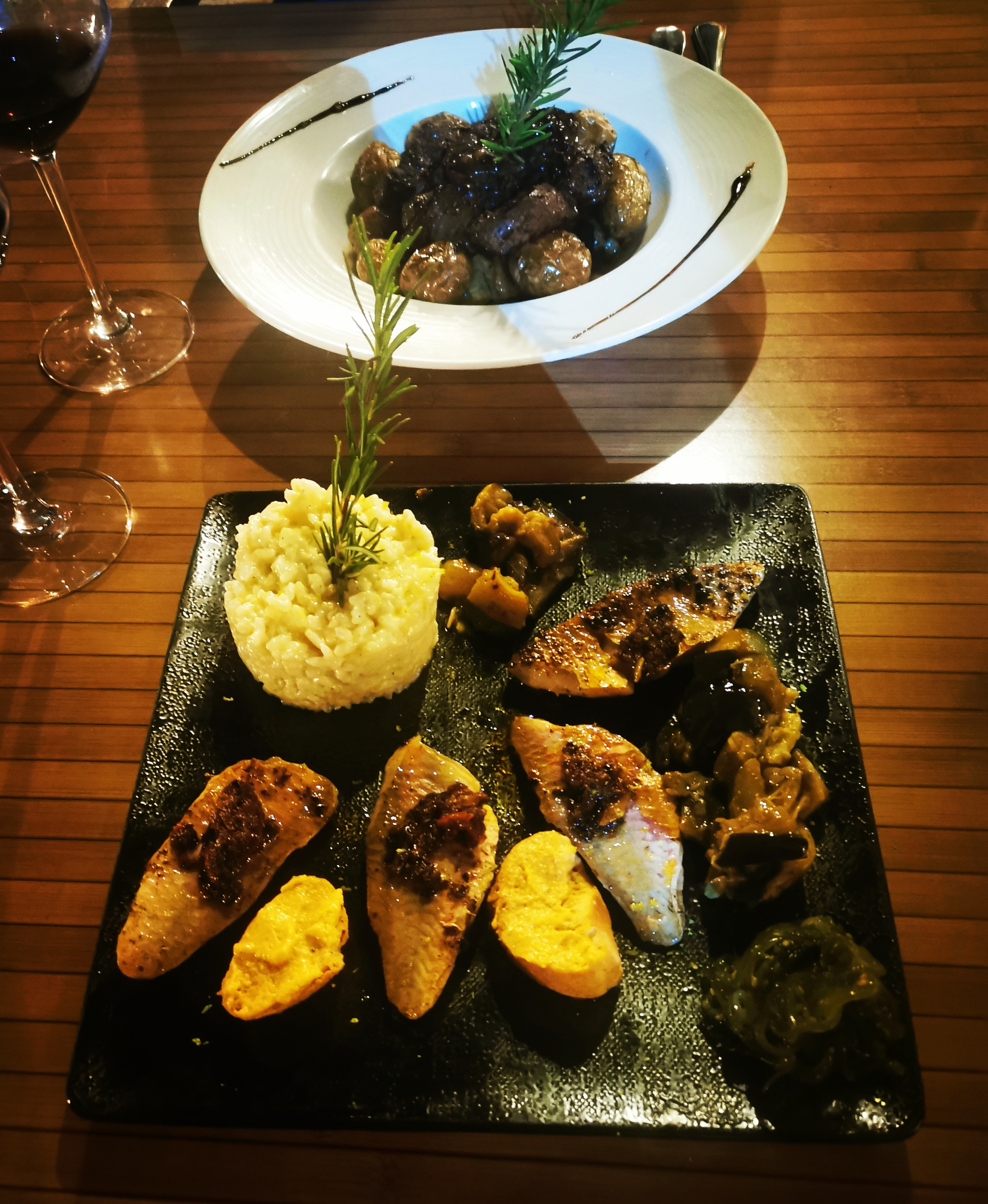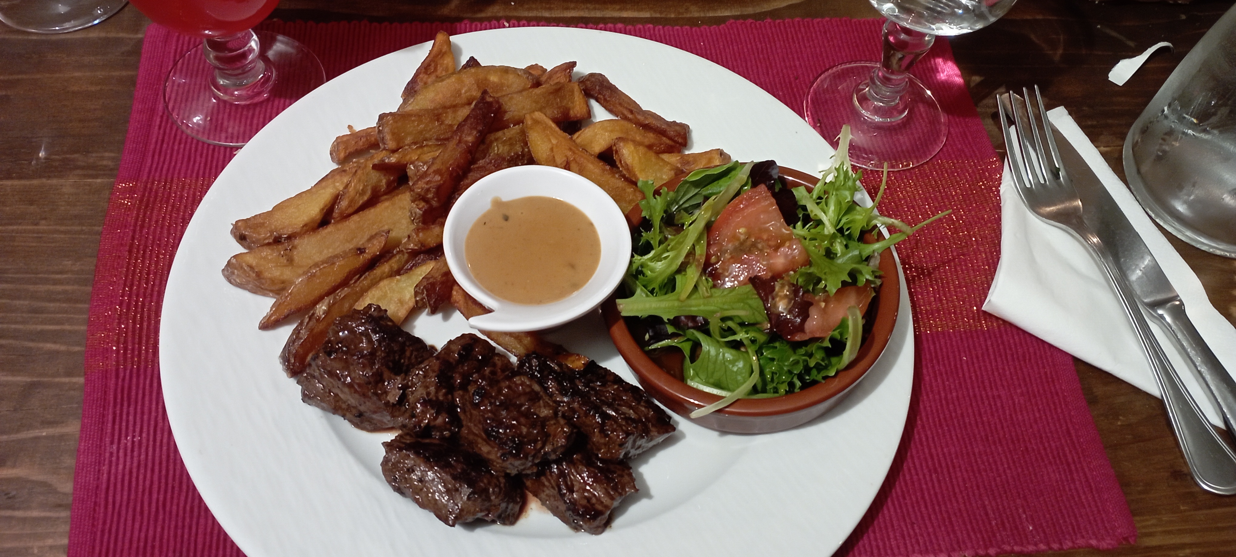 La meilleure nourriture que nous avons mangé dans le sud-est. Côte de porc avec ratatouille et sauce chorizo et brochettes d'agneau(Sans oublier les frites maison).