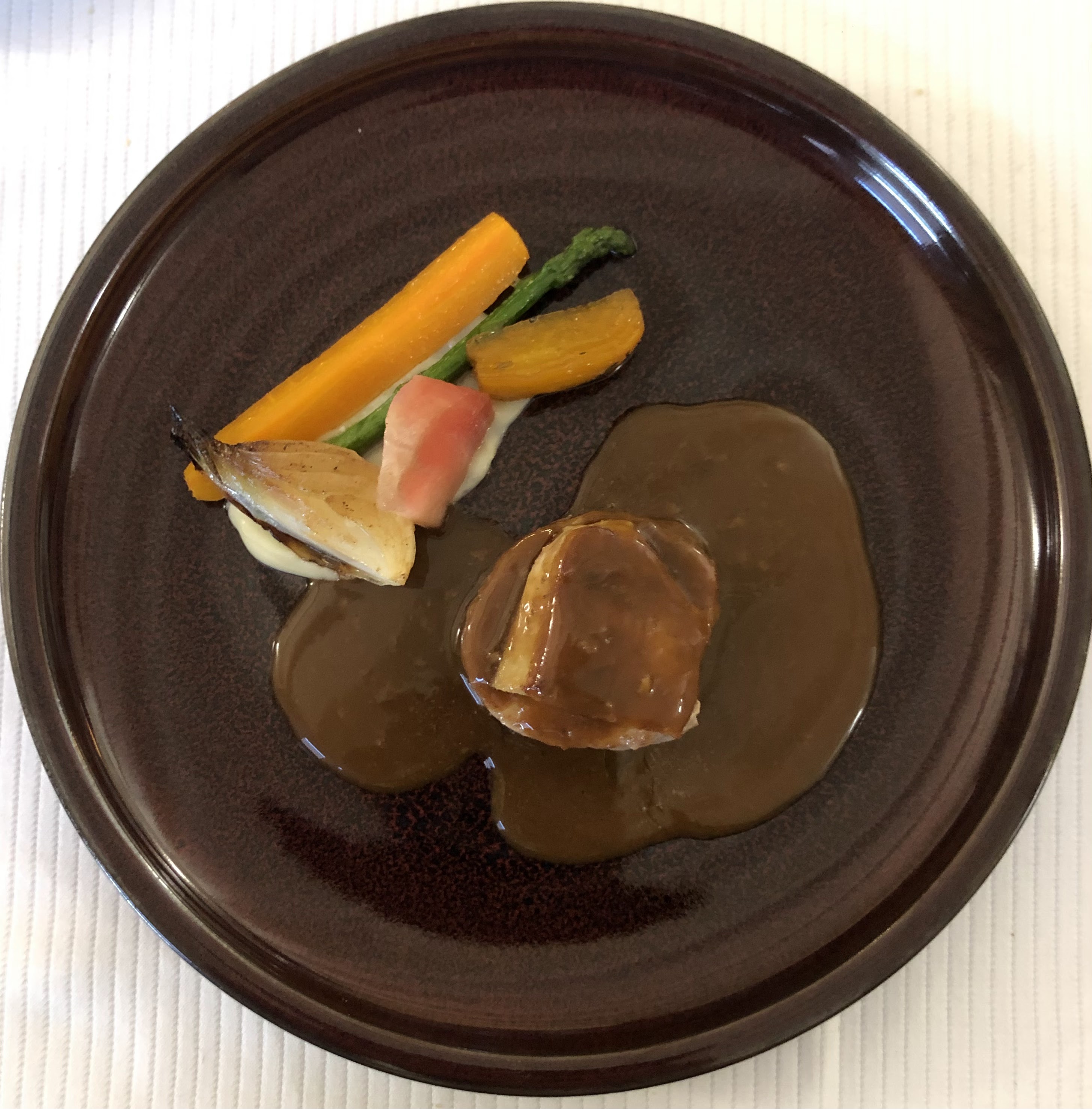 Dîner très agréable dans la véranda, vu sur l'étang, au soleil couchant, magnifique ! Des saveurs excellentes, des sauces succulentes qui se marient à la perfection avec des plats soignés. Assiettes élégantes et raffinées. Le service souriant parfait ce très bon moment passé.
