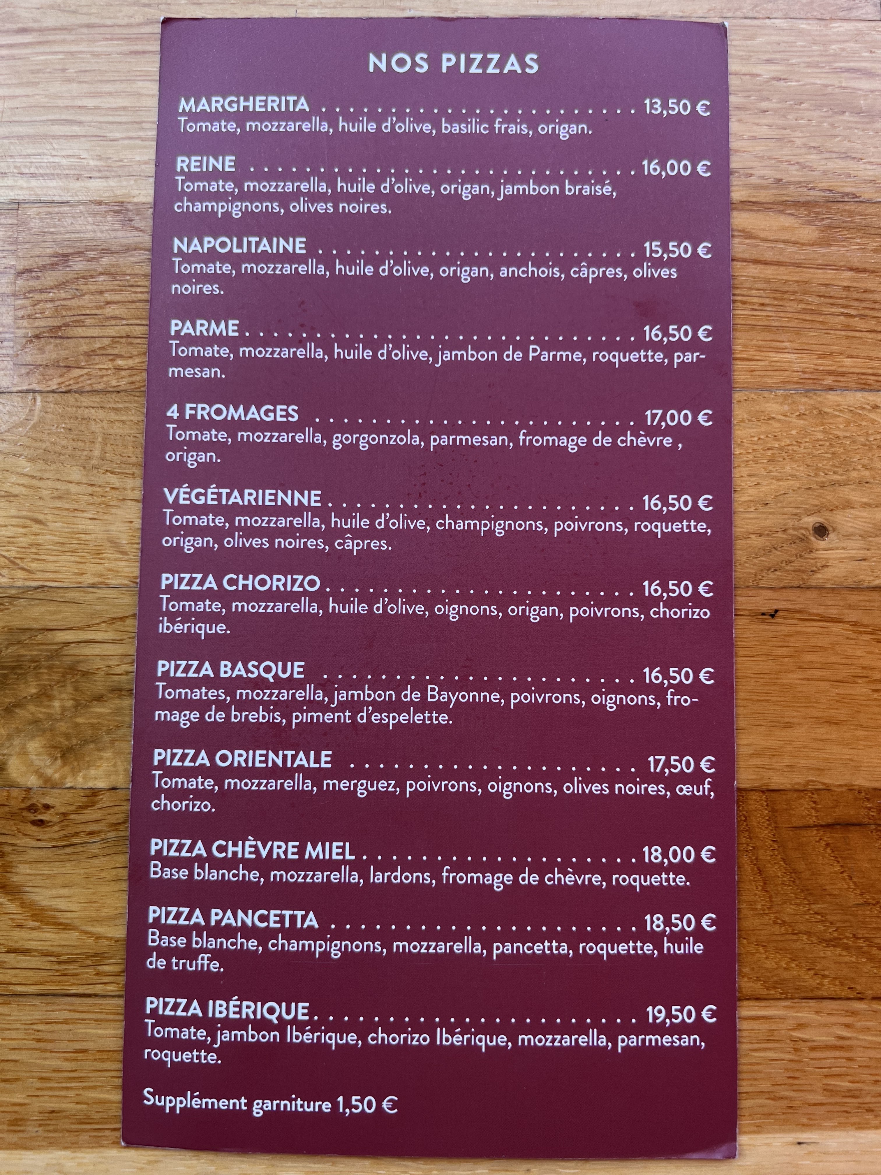 achat d’une pizza « basque » à 17€ : à moitié cramé, pas coupé, l’épaisseur de la pizza vraiment ridicule la pâte du carton, le seul + les produits ayant l’impression d’être frais......pour un repas sur le pouce parfait...pour un repas devant le couché de soleil à éviter