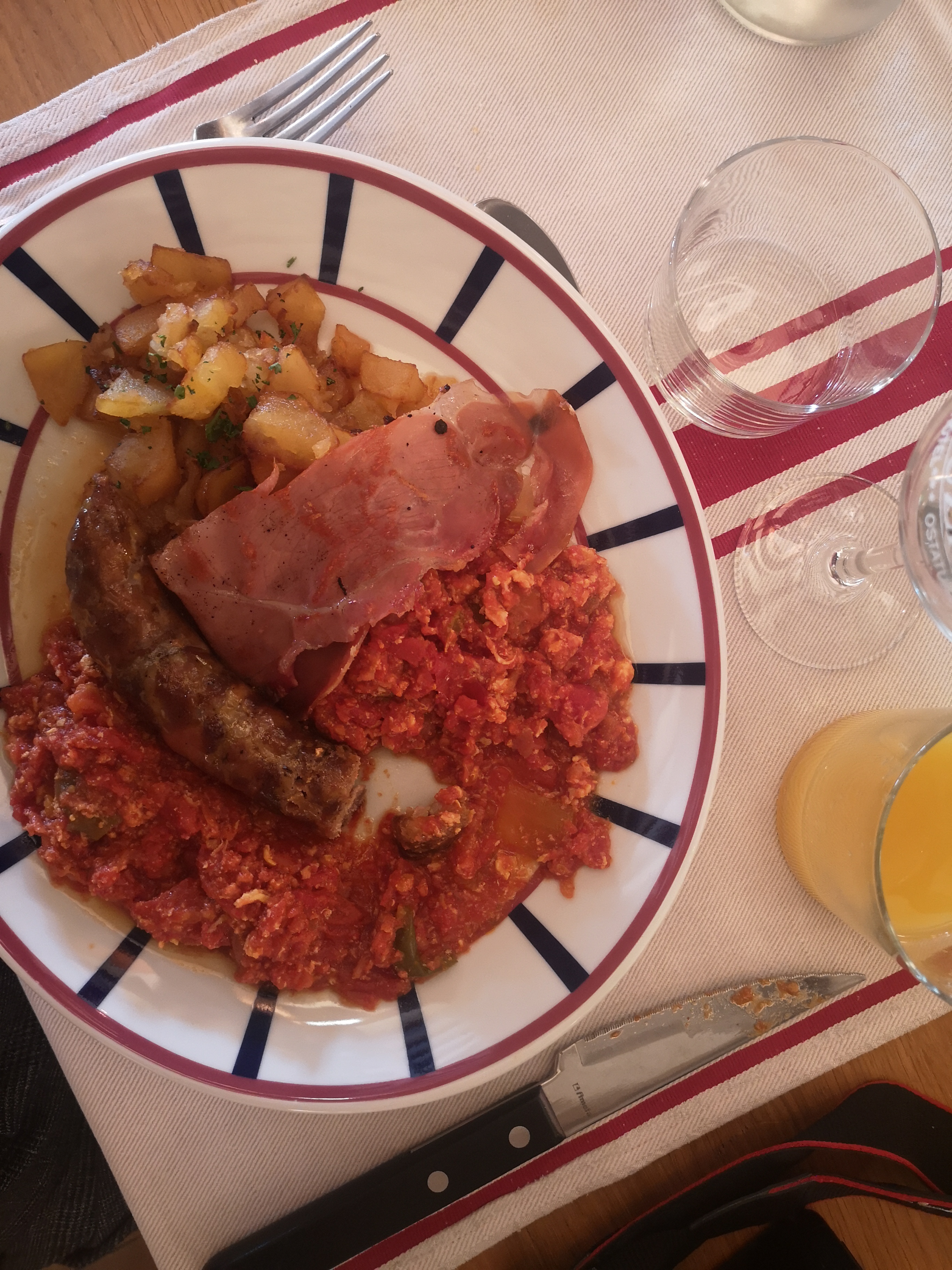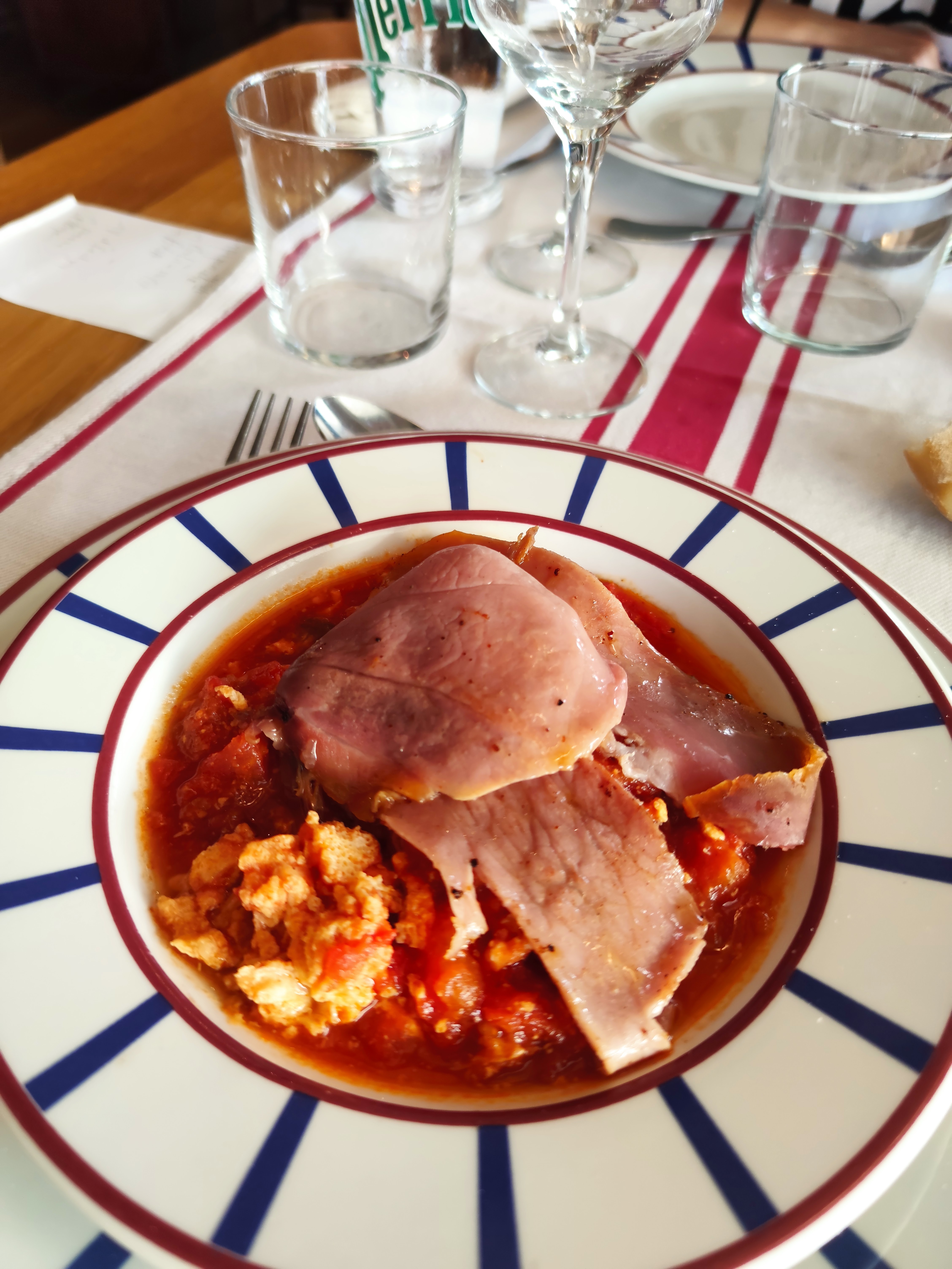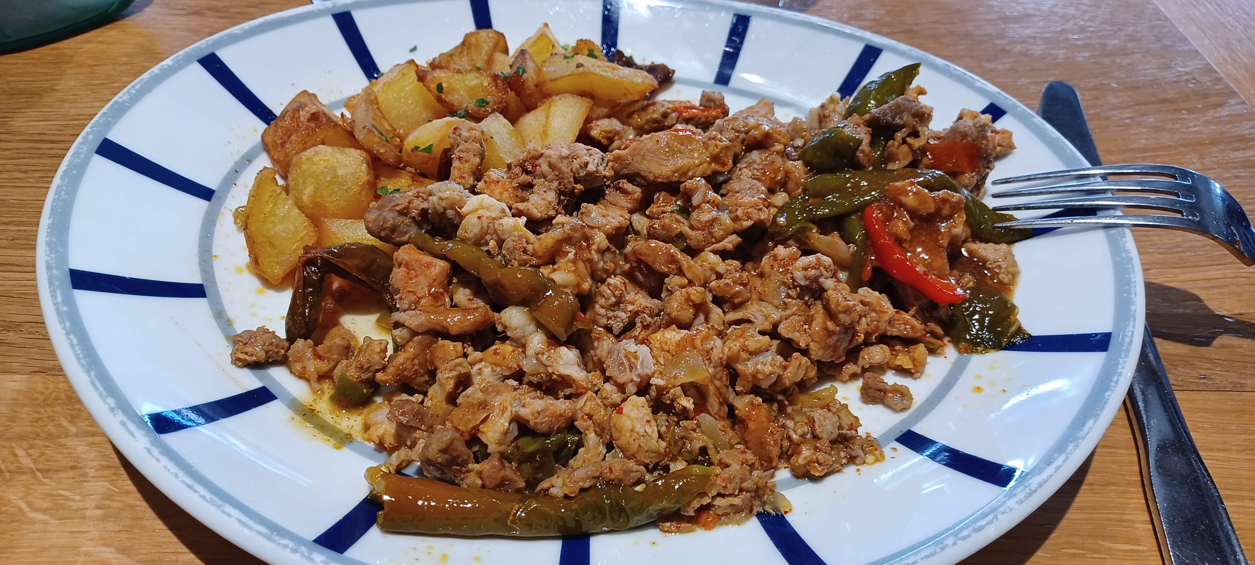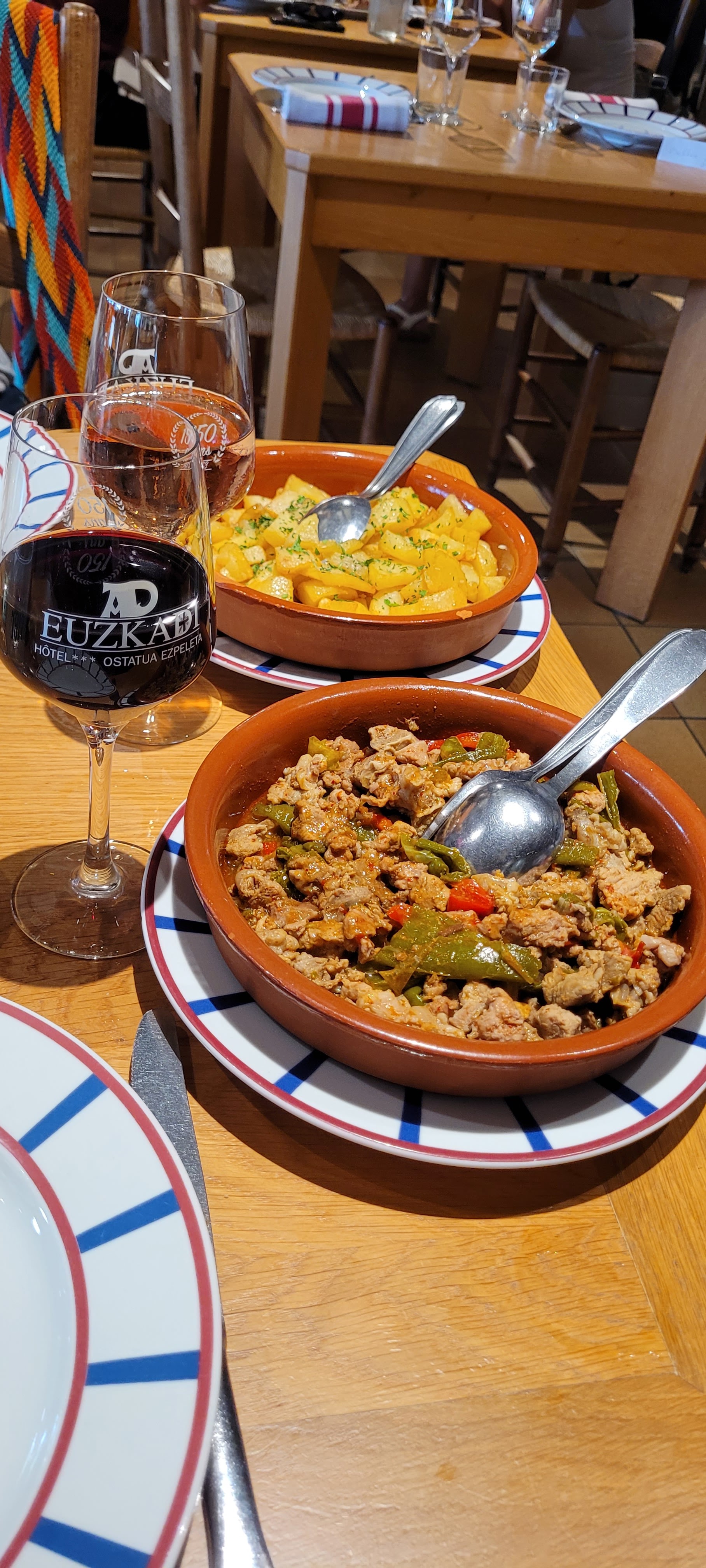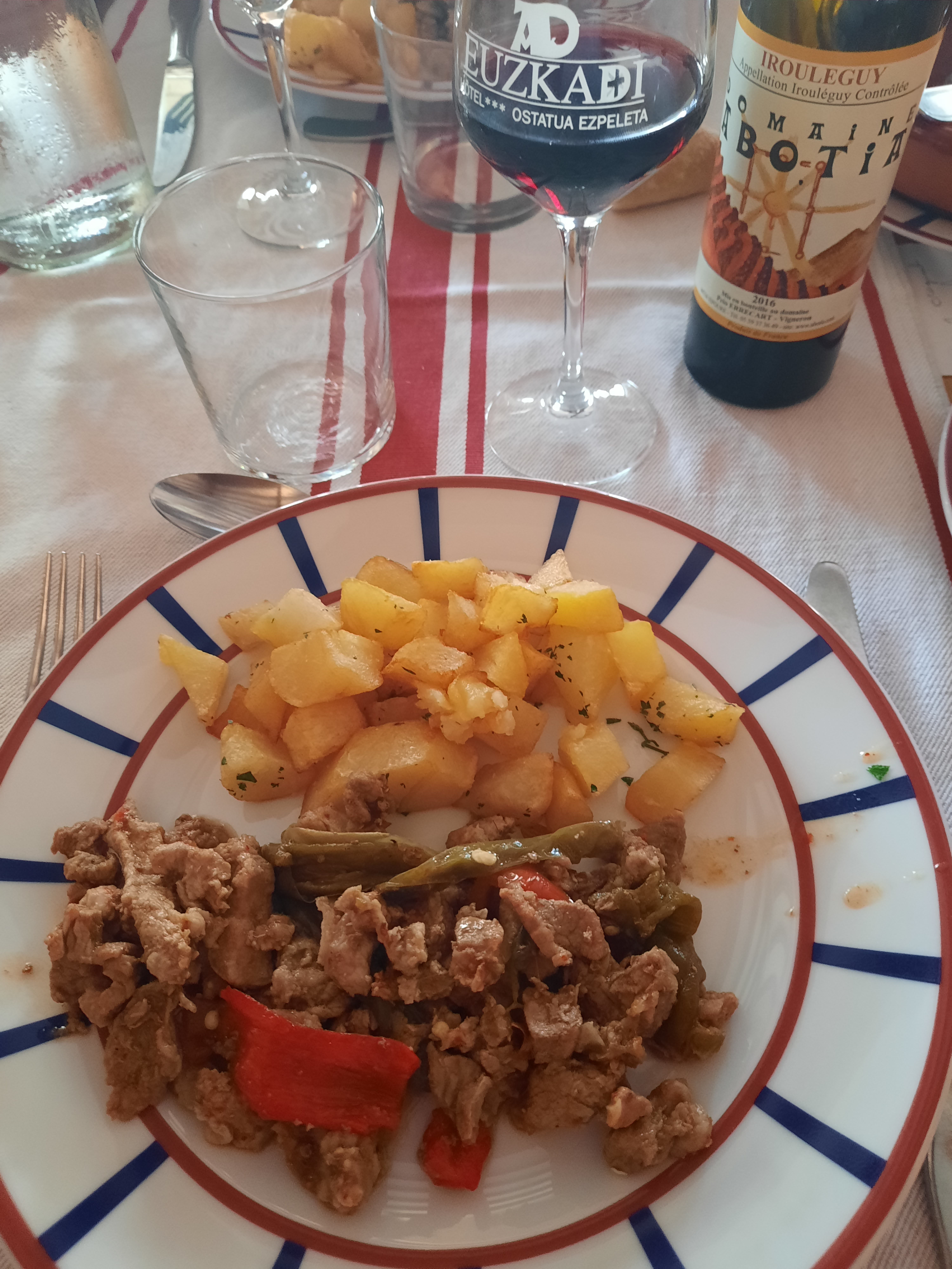 Repas complet typique locale ! Une entré, un plat, un dessert basque vraiment bon. Le serveur nous a expliqué chaque plat avec sa signification et a répondu à chaque de nos questions avec le sourire 😊 Nous qui decouvrons le pays basque, c'etais enrichissant autant pour la culture que pour le ventre 🤤 un régale et franchement, les pimants pas fort.