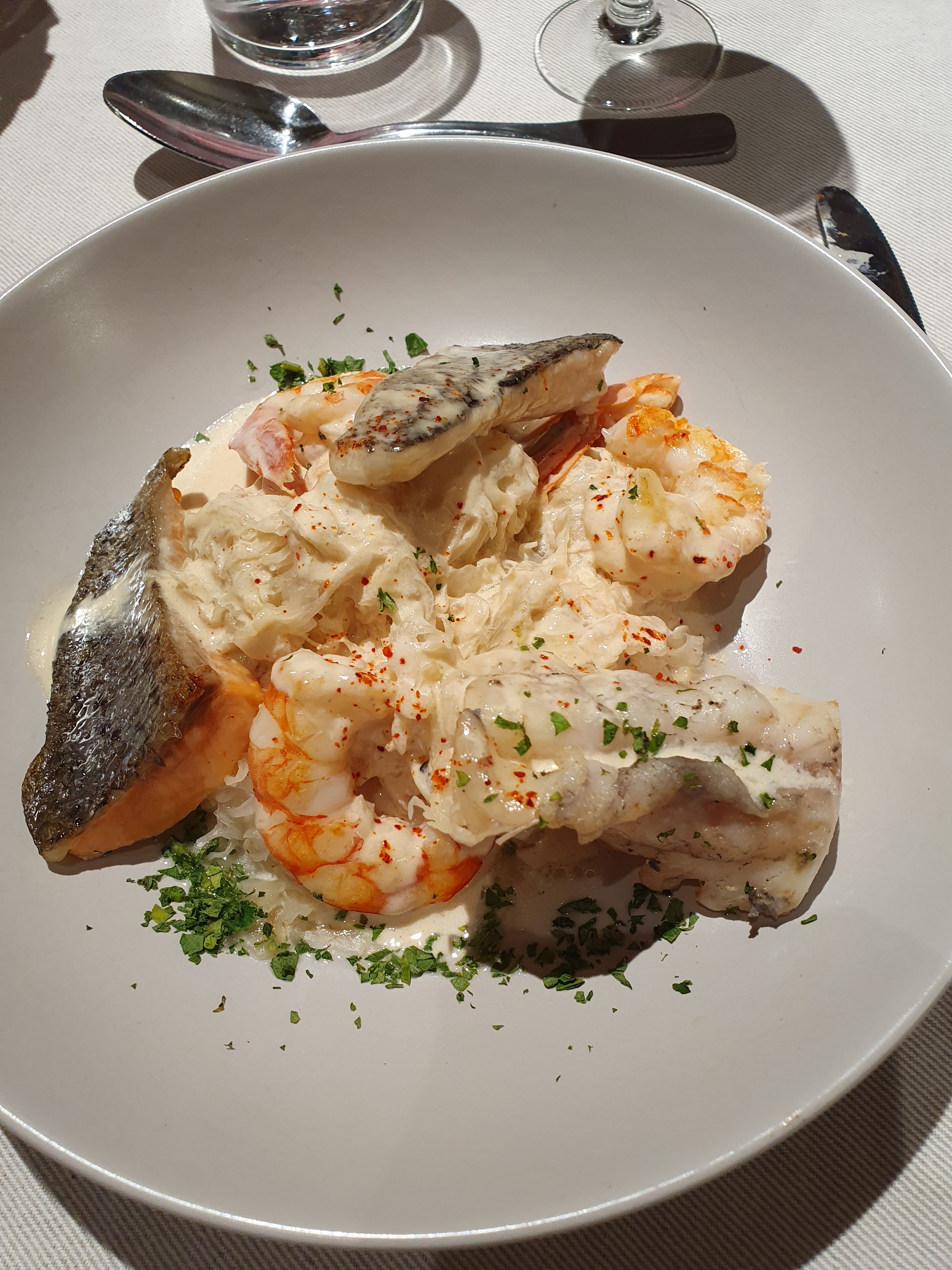 Bonne adresse et on y mange très bien et le dressage des assiettes est soigné, le service est efficace et l accueil est irréprochable. Cependant je mettrai un petit bémol la salle très grande est trop bruillante. Ce fut un excellent moment.