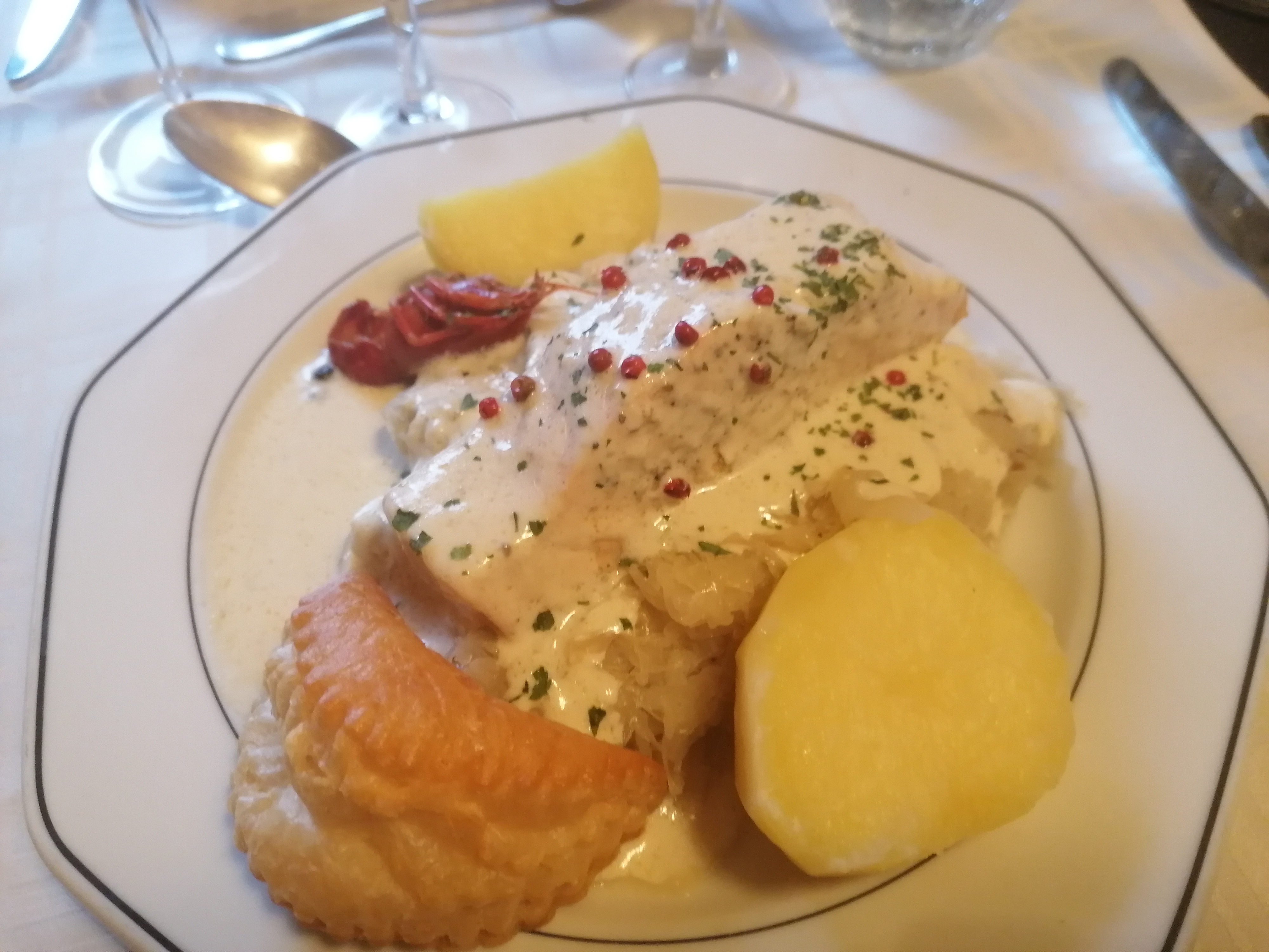 Repas acceptable suivant les plats proposés. Terrine du patron très tres sec.le lièvre sec .et la salade de fruits à peine mangable. Ma cassolette d'escargots bonne mais trop poivré. Les beignets de carpes et l'accompagnement bon.le cougellopf glacé bon.par contre mon mari à été malade après !!!!.