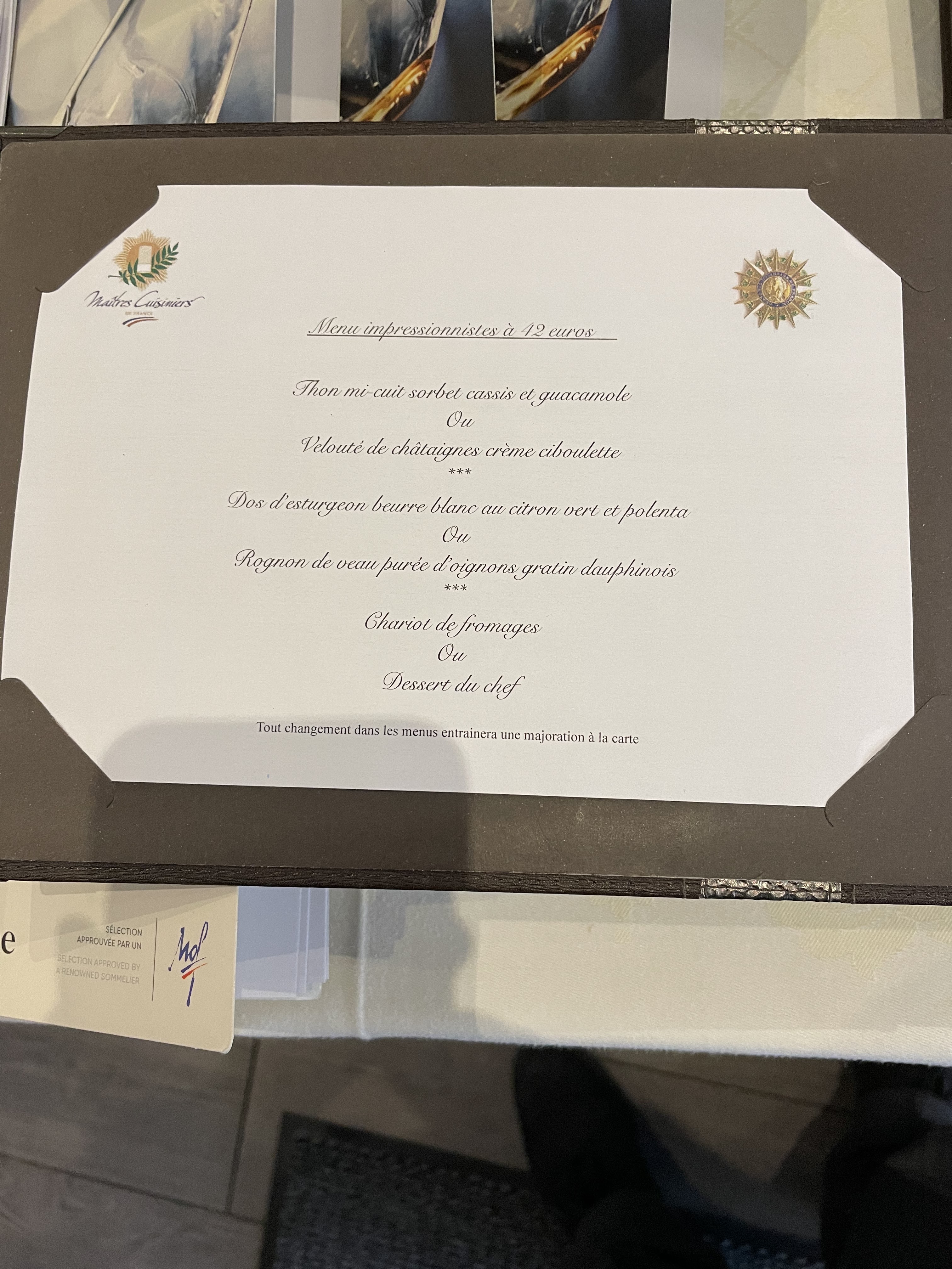 Très belle soirée. Menu à 55€. Service agréable que ce soit par la serveuse ou la patronne. Pas de prise de vin pour nous. Cocktail adapté ainsi que le dessert. Vue sur la Seine, le vieux pont (historique) et les îles. Merci.