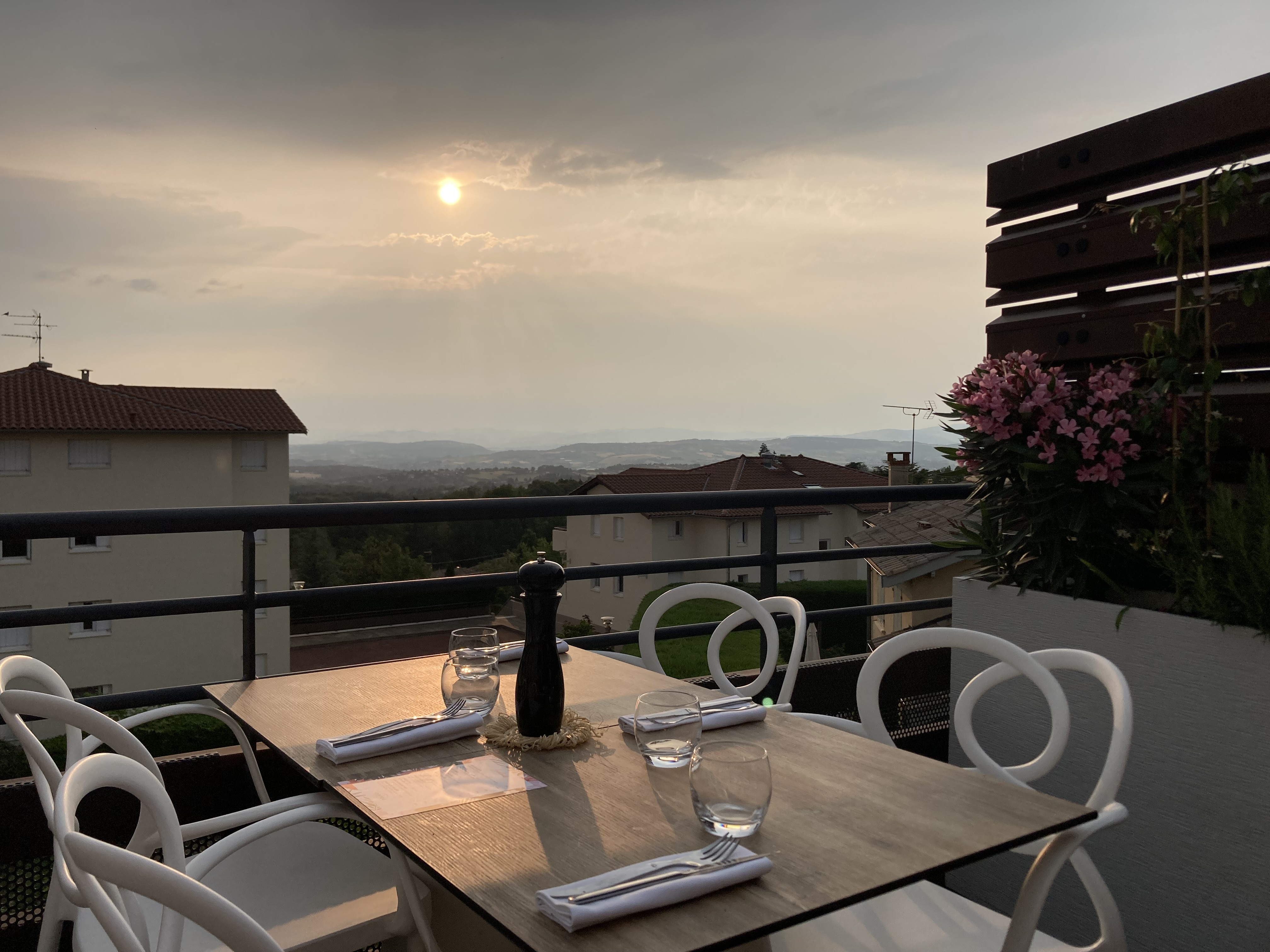 Excellent dîner sur la terrasse. Magnifique vue sur le lyonnais et coucher de soleil. Le personnel est aux petits soins, j’y retournerai avec plaisir!!