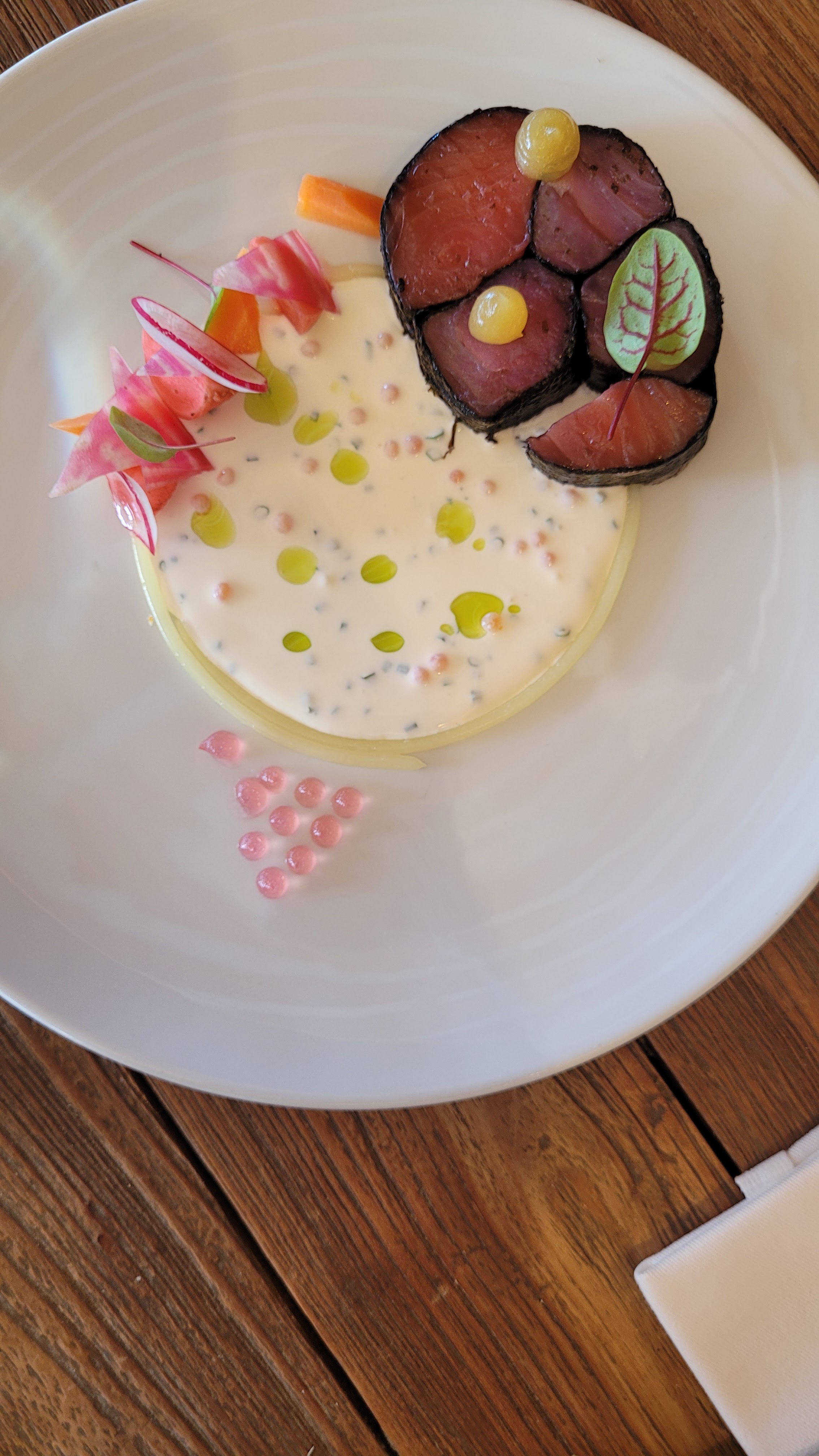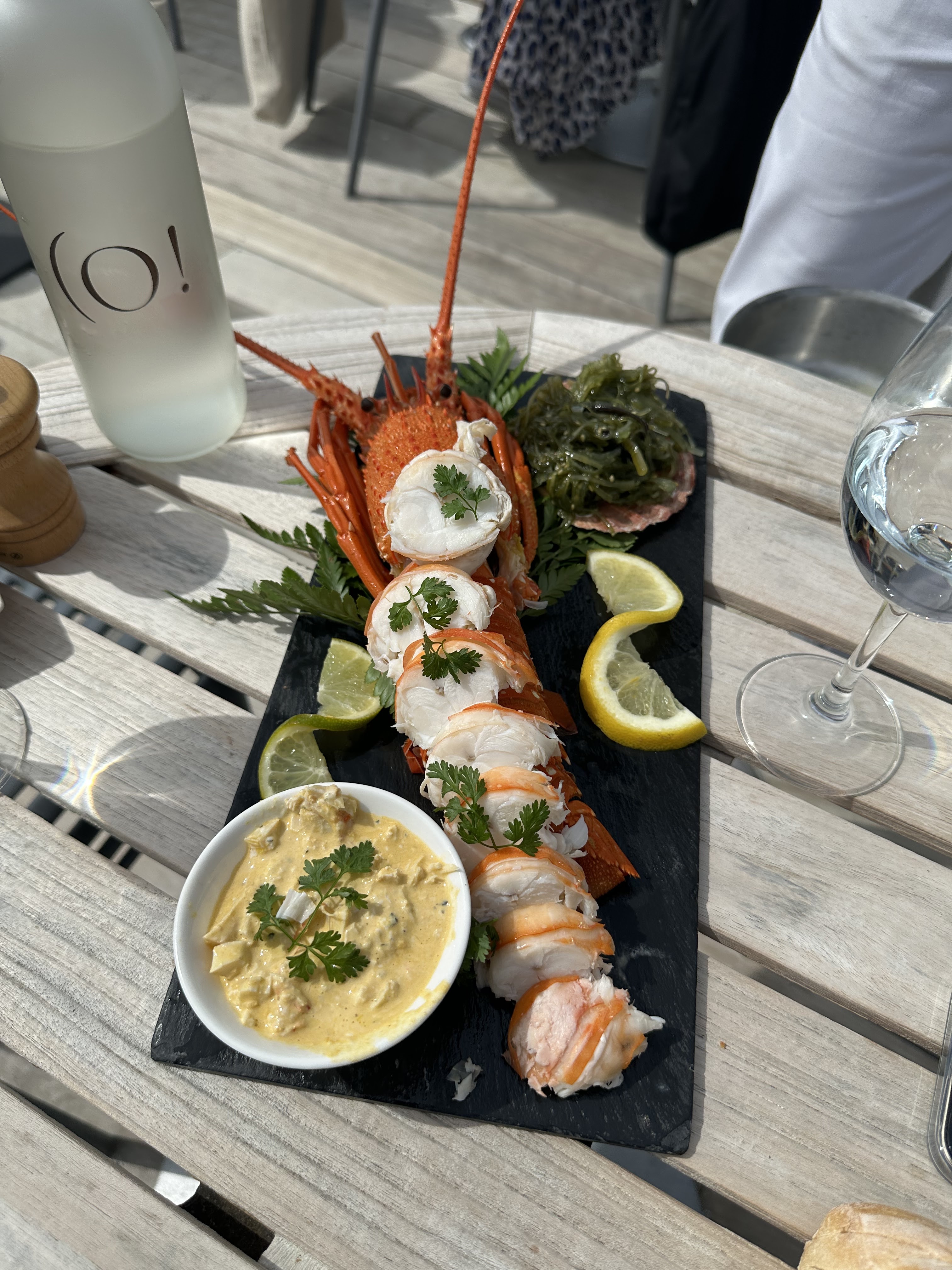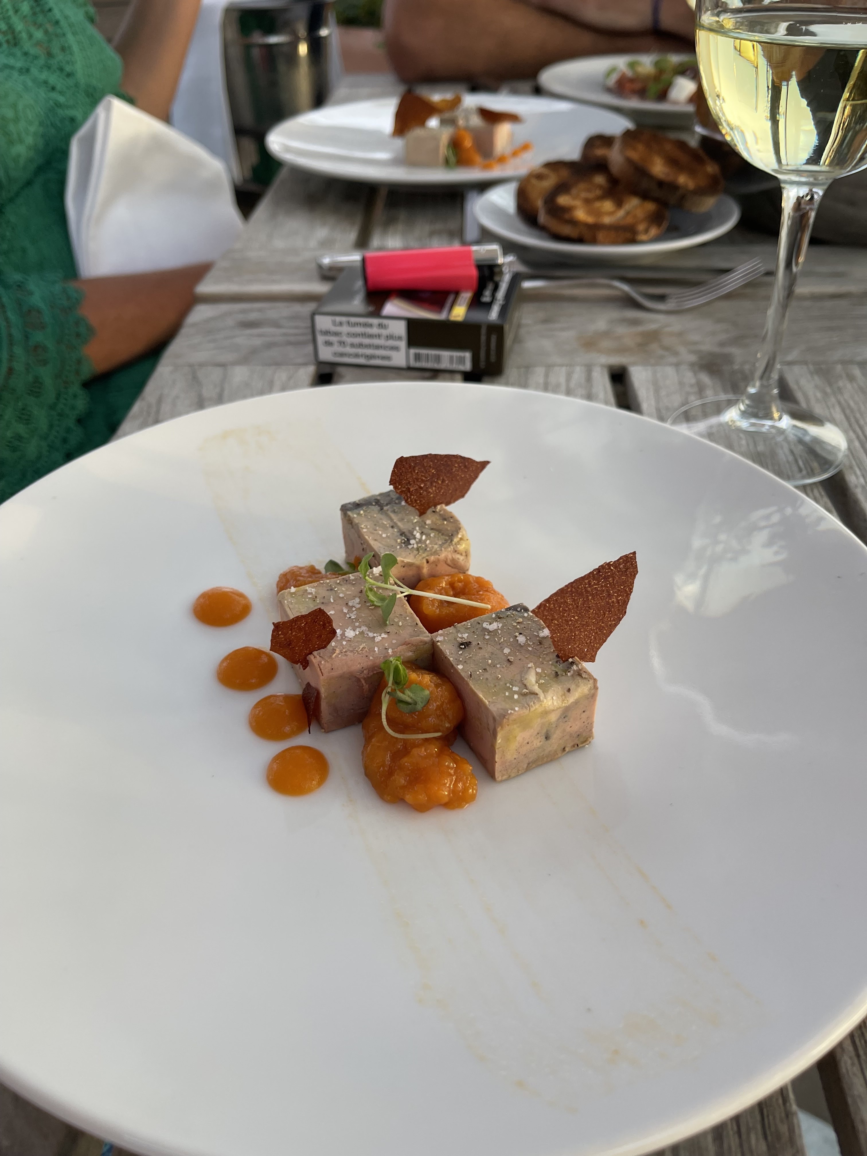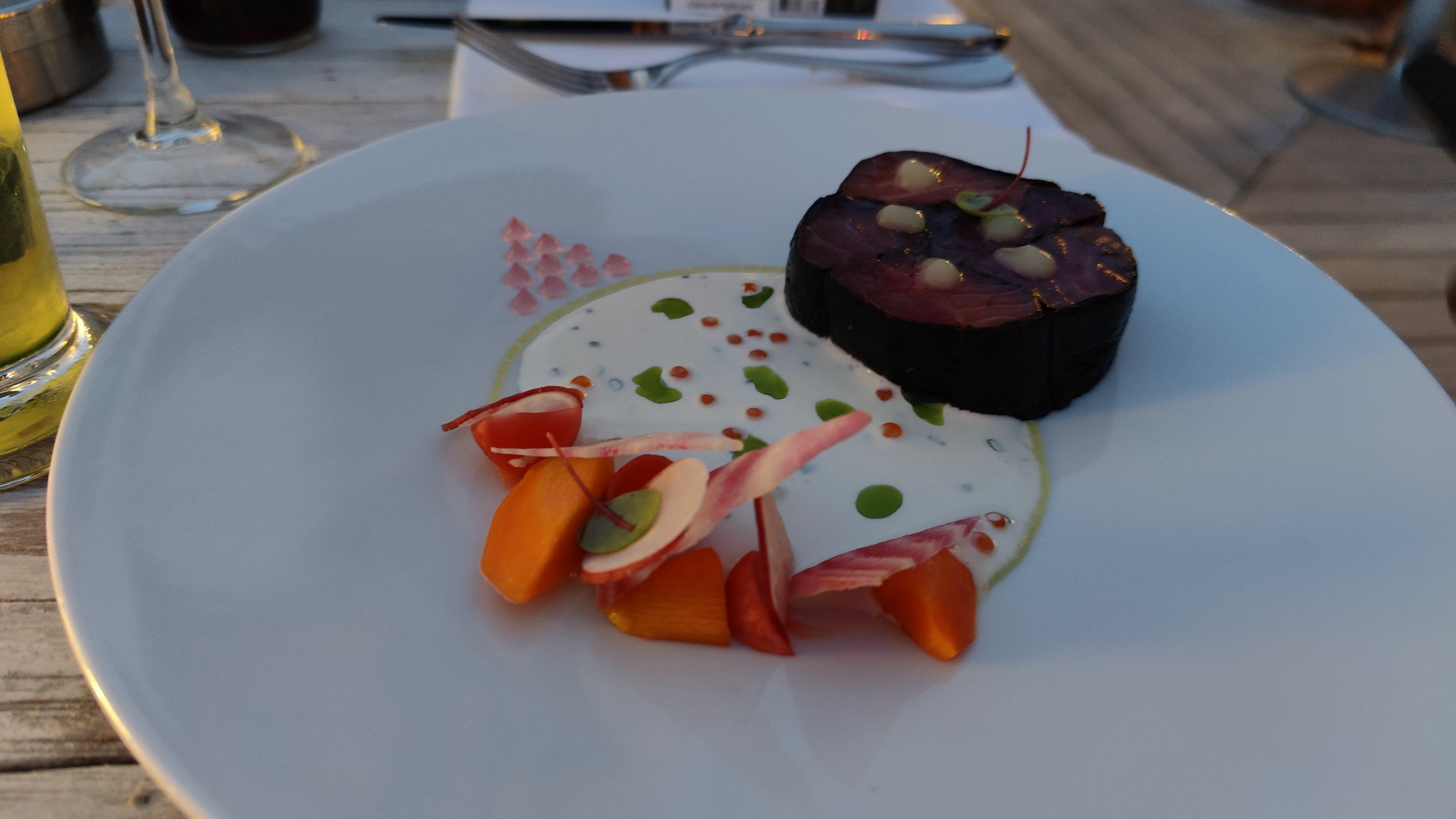 L'assiette est bonne et jolie. Le personnel est très agréable. La vue est exceptionnelle. Mais par rapport au standing de l'endroit, je n'ai pas aimé la table en bois tachée et avec un mégot coincé dedans, et les toiles de parasol très sales qui mériteraient d'être changées.
