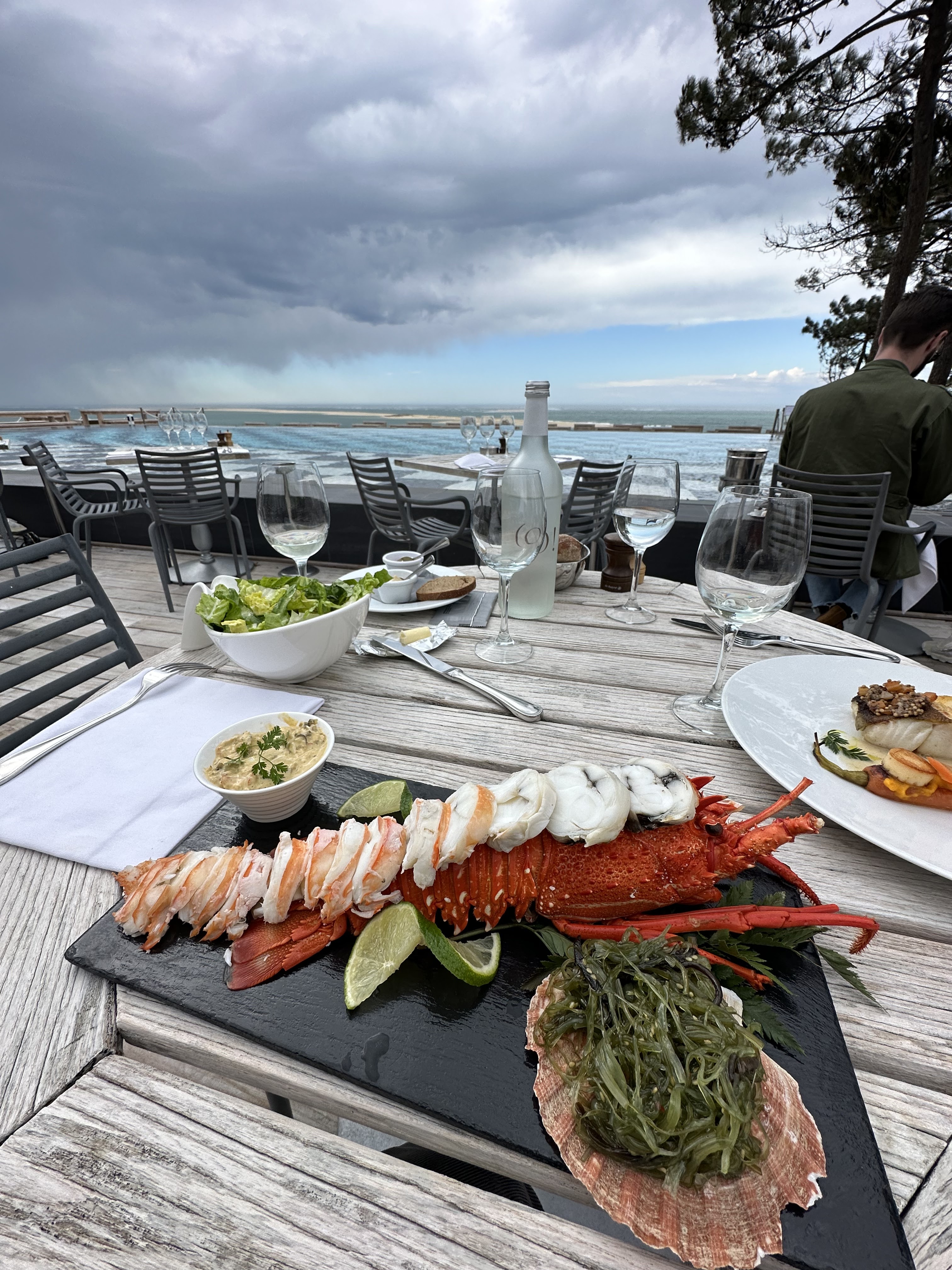 Déjeuner au restaurant. Pas de service hôtel. L’expérience commence par le placement: les jours de mauvais temps peu de tables ont accès à la vue sur l’océan. Du coup nous étions en contrebas avec une vue vegetation… Les produits de la mer sont d’excellente qualité mais pas bien préparés (morceaux d’écailles dans les huîtres, pinces de crabes non pré-cassées). Les plats avec préparation laissent grandement à désirer. Cuissons non maîtrisées (deux plats de viande renvoyés), préparations fades et associations sans intérêt (c’est la première fois que l’on me sert un tartare à température ambiante avec comme seul goût la tuile de parmesan). Ce qui a sauvé ce déjeuner est la serveuse très agréable et impliquée qui s’est occupé de nous et qui nous a conseillé le dessert À la cerise qui a relevé l’expérience. En résumé, beaucoup de prétentions mais ça ne se retrouve pas dans l’assiette.