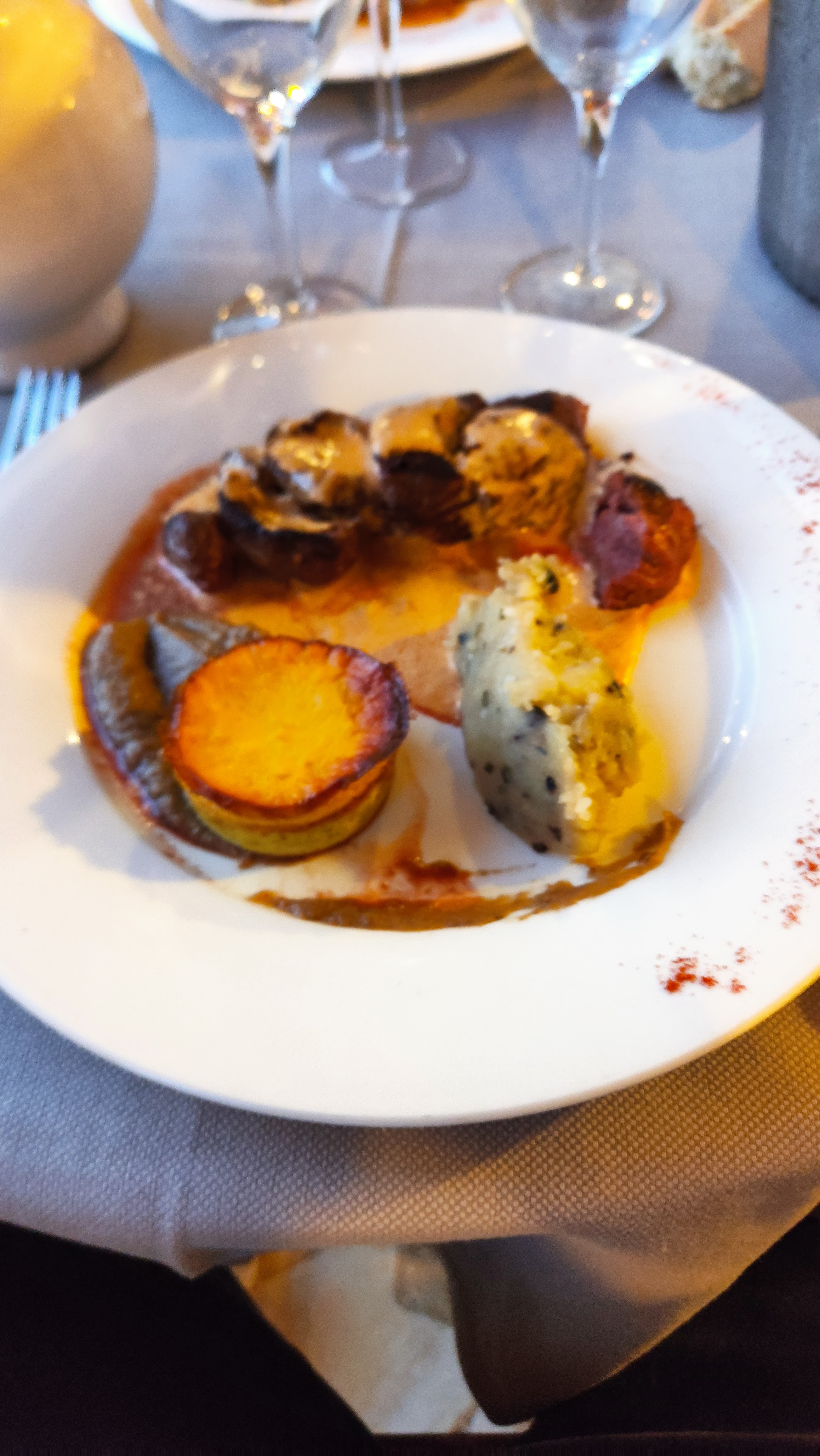 Nous avons juste mangé au restaurant un soir. Sans plus. Il n'y avait rien d'exceptionnel. Je trouve qu'ils se donnent un genre gastronomique mais avec une carte pas très moderne et des plats pas mauvais mais sans plus. Les desserts par contre ont déçus pas mal de monde. On n'a pas passé une soirée désagréable mais nous n'avons pas forcément envie d'y retourner.