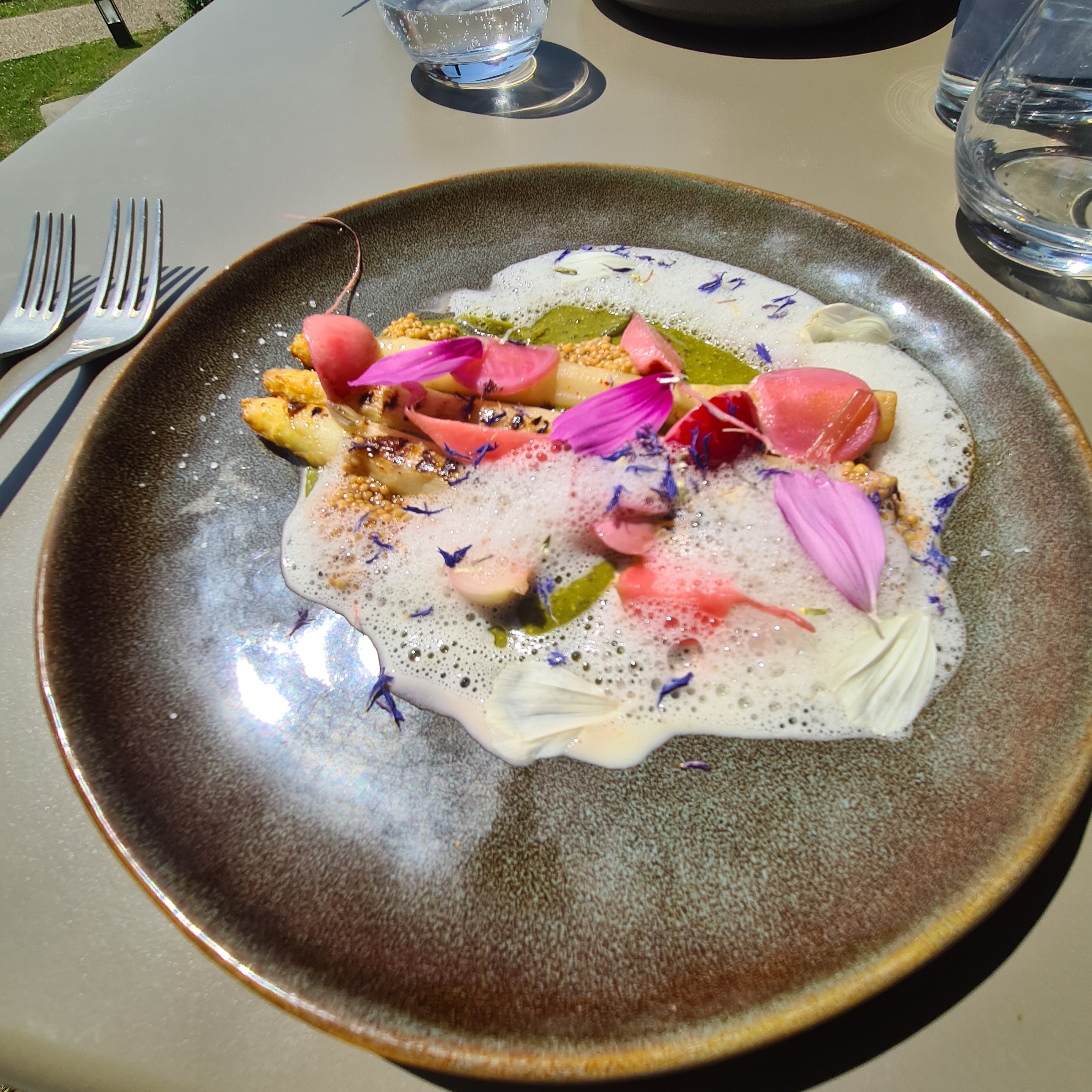 Les plats sont délicieux et très bien présentés ; que ce soient les asperges cuites juste ce qu'il faut, ou le ris de veau. La tarte tatin est re-visitée, elle est aussi vraiment réussie. Nous avons apprécié le cadre de la terrasse. Mise à part le service un peu long, tout est parfait avec des prix raisonnables.