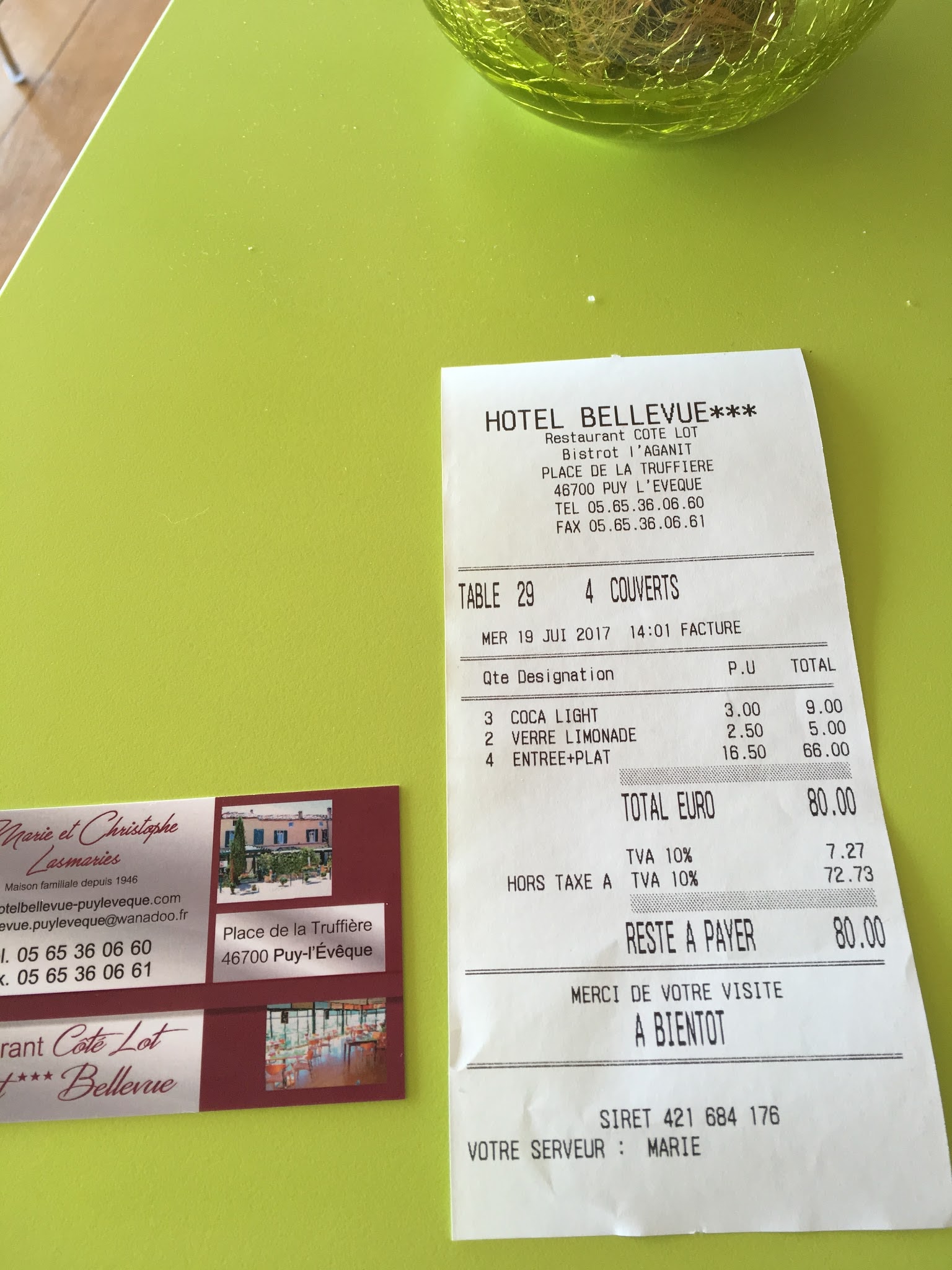 3 étoiles sur 5 Restaurant Côté Lot à l'Hôtel Bellevue. Ma famille a visité le restaurant le 19 juillet 2017 vers 13. Nous avons tous commandé l'entrée et le plat principal suggérés par le serveur. La nourriture était délicieuse, en particulier la purée de pommes de terre qui accompagnait le plat principal. Un peu plus de légumes pour le plat principal et une version pour enfants avec des portions plus petites du menu proposé auraient déclenché une étoile supplémentaire. La situation de l'hôtel et son entrée exclusive peuvent donner l'impression de l'extérieur que le restaurant n'est pas décontracté et familial. Le service est accueillant mais caractérisé par l'affluence. Il y avait une atmosphère détendue dans le restaurant. À notre arrivée, nos enfants ont reçu des crayons et une serviette sur laquelle dessiner. Notre fille l'a particulièrement apprécié. L'entrée et le plat coûtent 16,50 €. Le prix total de la visite familiale était de 80,00 €. Le restaurant est situé au point culminant de la vieille ville de Puy l'Évêque, là où il flotte presque au-dessus de la rivière Lot. La vue est fantastique. L'intérieur du restaurant ne correspond pas tout à fait à la vue.