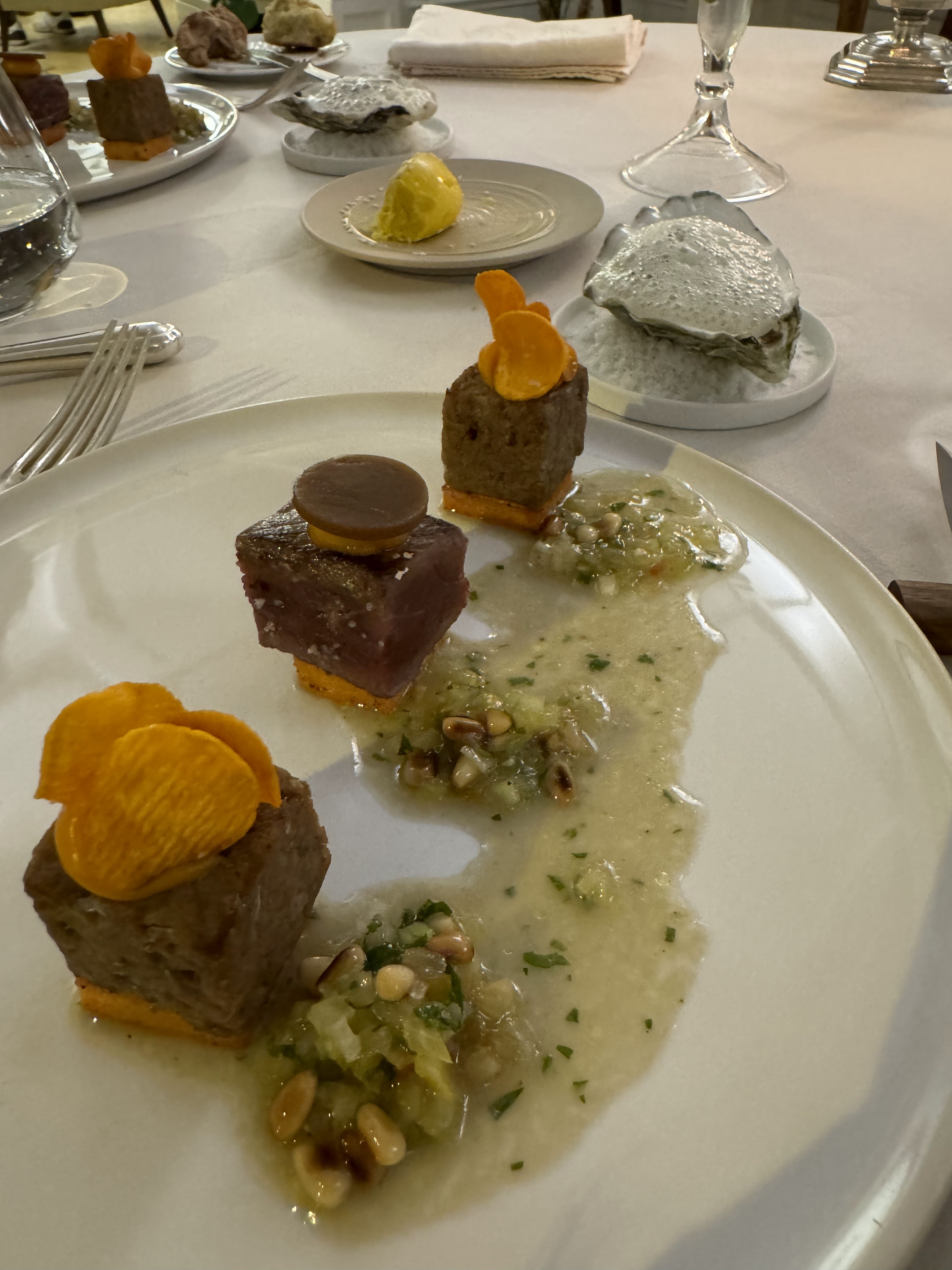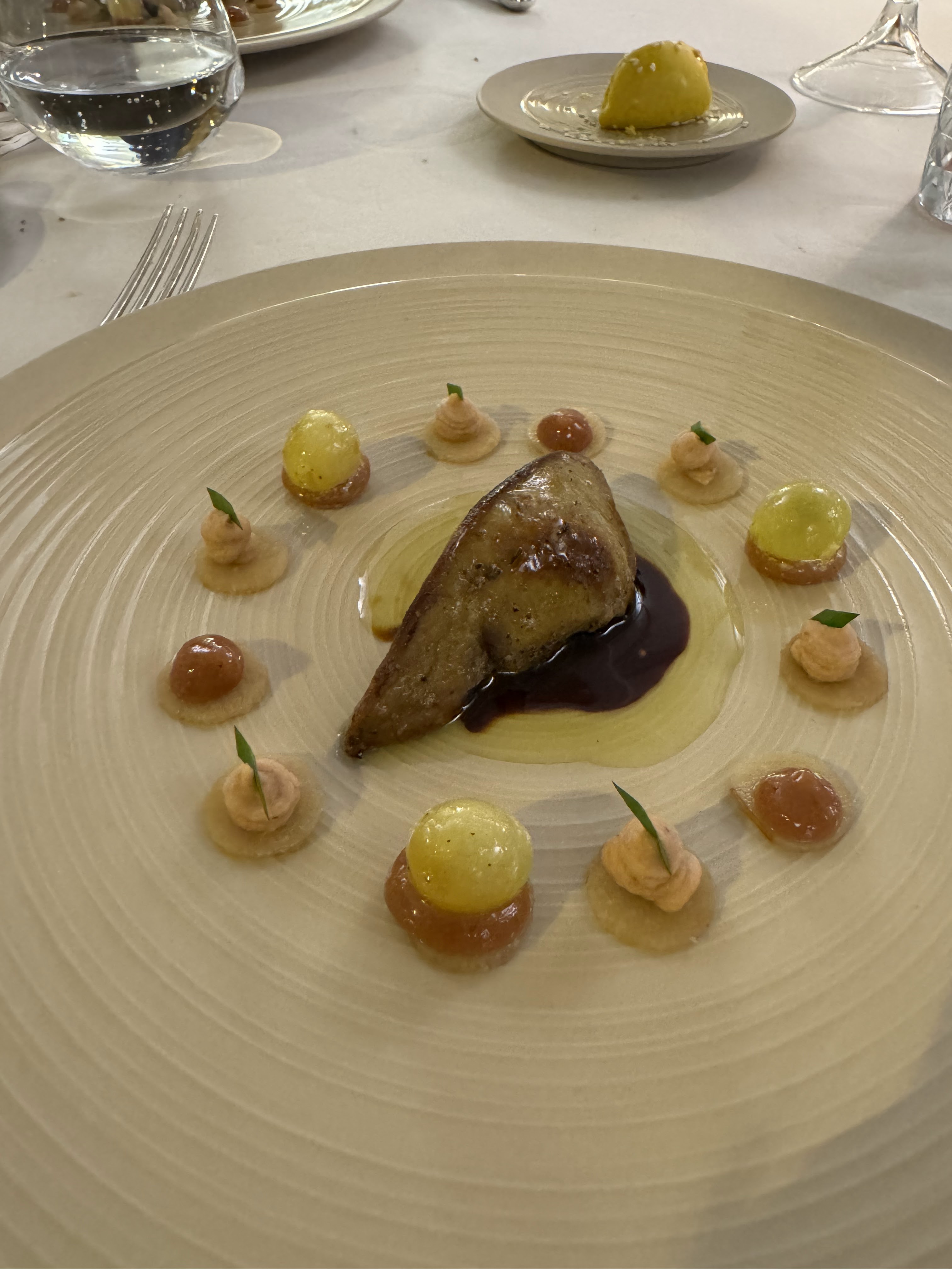 Restaurant à côté de la réception de l'hôtel. Endroit spacieux avec une très bonne décoration, à la périphérie il y a quelques tables et chaises devant une fontaine qui en été doit être très agréable. Attention amicale et attentive. Il y a à la fois une carte et 3 menus, tous très intéressants. Nous avons pris le 3ème menu, ce qui s'est avéré être pour moi une belle découverte. Le 1er plat est composé de 3 choses : du foie gras, du foie gras de poulet (sur des pommes cuites et une feuille de pâte feuilletée) et un autre dont je ne me souviens plus (vous le verrez sur les photos). 2ème plat sublime de foie gra rossini 😍😍😍😍 .... Ici ce fut le coup de foudre. Vin local délicieux. Ensuite le dessert était sans intérêt et les digestifs étaient très chers pour le montant qu'ils donnent. Conclusion : Recommandé uniquement pour la nourriture, ce n'est pas un restaurant de desserts ou d'alcool.