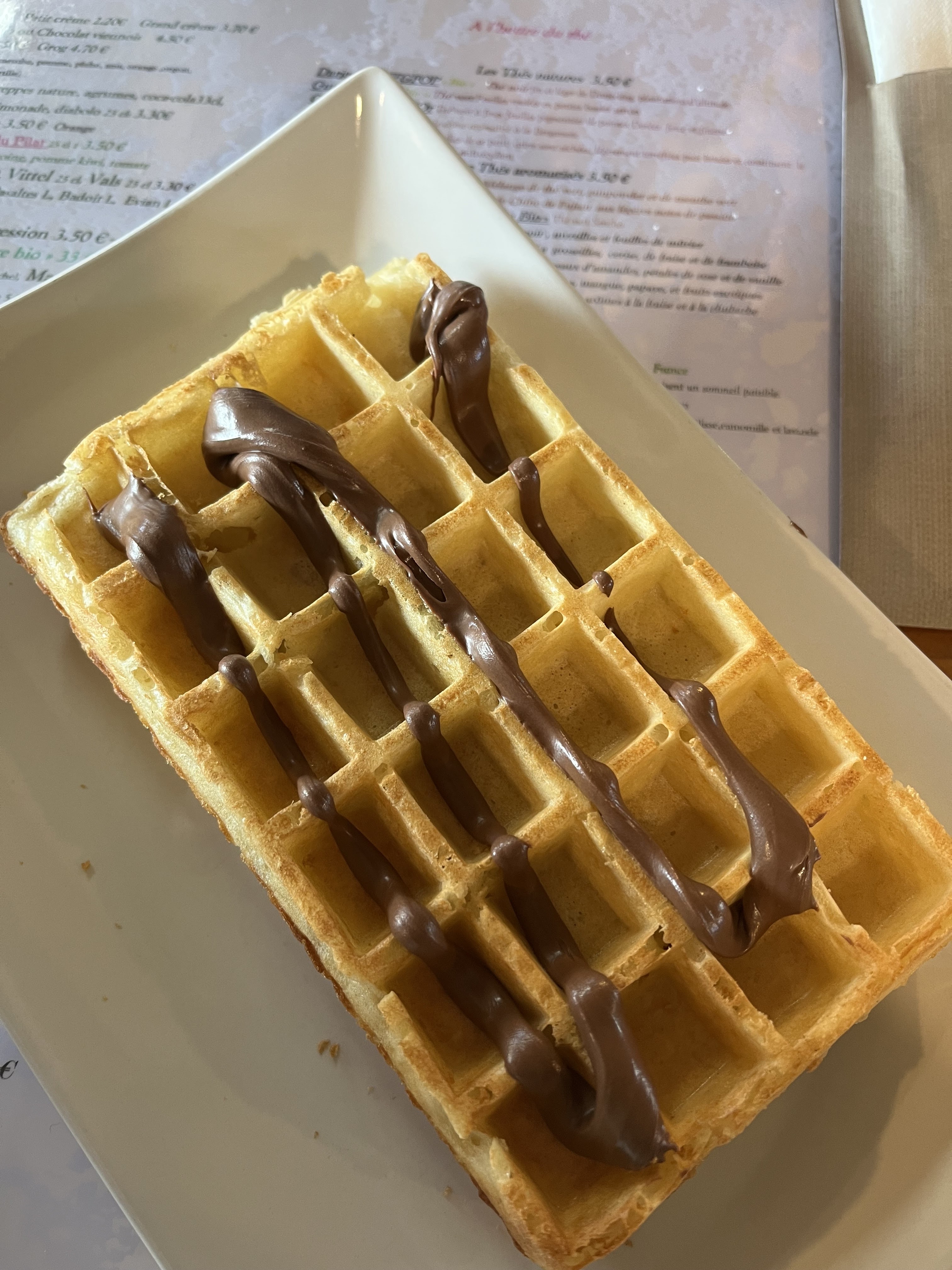 4€ pour la gaufre au nutella. On risque pas de s’étouffer vu la quantité de chocolat versé sur cette gaufre froide. L’image parle d’elle-même. Le service est froid comme ma gaufre. PS : j’avais pas encore goûté le café mdr… il est infect !