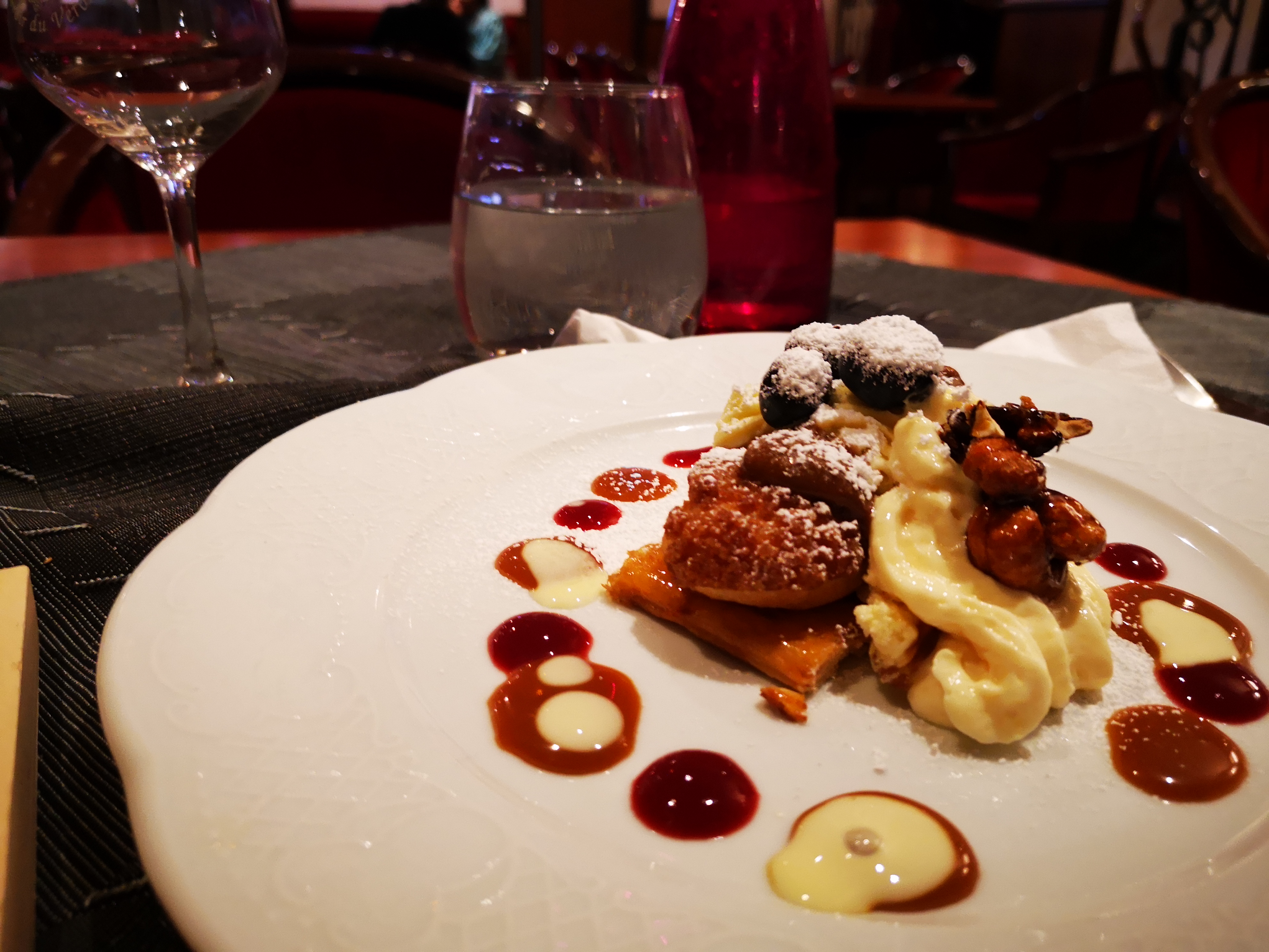 Services correcte, mais le sandre avais un arrière goût pourtant une autre personne à table avais aussi du sandre mais il était excellent mais la restoratrice n'a pas cherché à comprendre ni à goûter pour vérifier et nous a bien fait comprendre que l'on avais tort alors qu'elle n'a pas vérifié et ensuite arrivé au dessert un des serveurs nous a fait une remarque : Ne vous inquiétez pas les desserts ont le même goût . Est ce de l'humour ou une remarque dans les deux cas c'est déplacer, mais le deuxième serveurs et venu nous voir pour chercher à comprendre et je le remercie pour cela mais le mal etait fait mais nous aurions apprécié que le serveur aillant lancer la remarque viennent s'excuser. Ce serait bien de marquer sur la carte quand le produit et bio car quand l'on a commander le vin il n'était marqué nul par que le produit était bio et quand on a eu le vin sous les yeux on c'est aperçu qu'il était bio