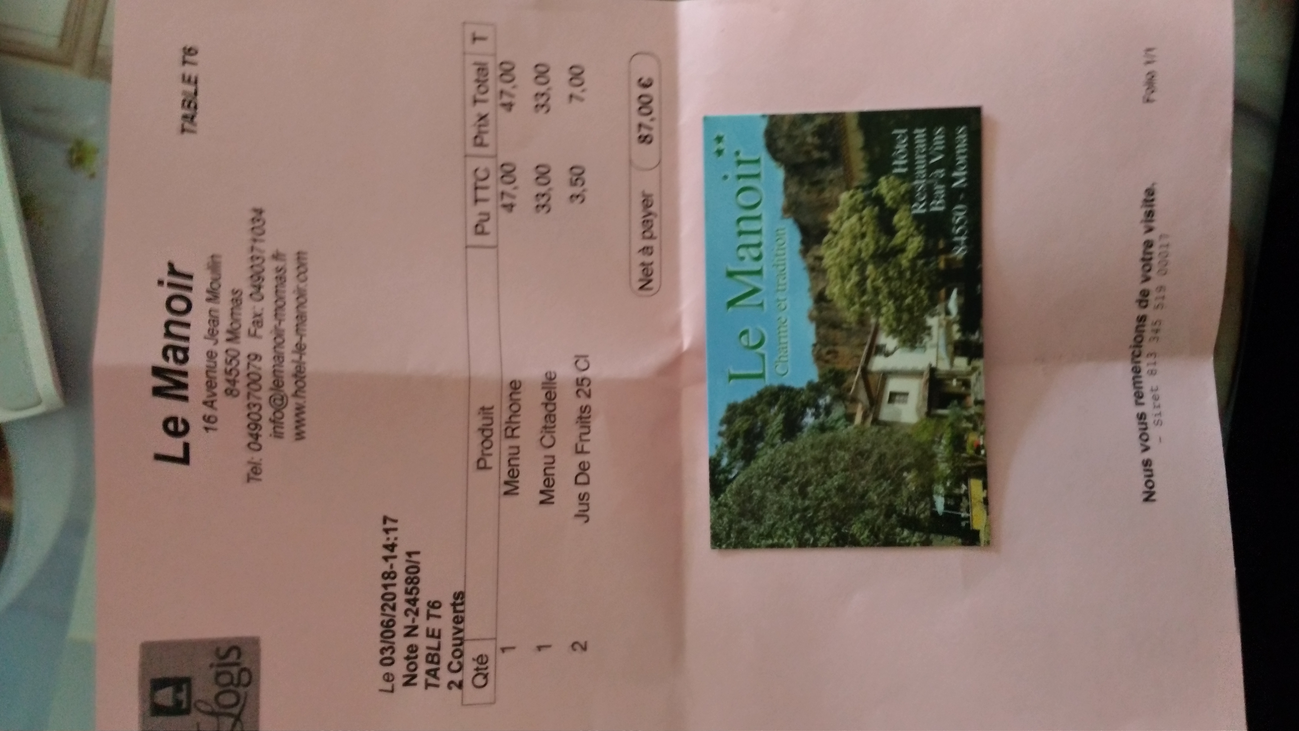 C'est par accident que je me suis arrêté au Manoir, avec ma petite famille, en ralliant Lyon-Saint Raphaël. La voiture s'était fait percuter juste avant Mornas par une auto qui avait perdu le contrôle. Nous étions on ne peut plus crasseux, pas présentables du tout. On nous a accueilli là avec des égards extrêmes, une gentillesse inouïe. Nous avons fait un repas gastronomique inattendu et dormi dans une chambre tendue de mauve, et on nous a servi un excellent petit-déjeuner pour 4 personnes alors que nous descendions en retard! Je m'attendais à un prix à casser les reins. Pas du tout. A quelque chose, malheur est bon puisqu'il m'a fait découvrir cet endroit. Nous y repasserons, délibérément, cette fois, et pour le plaisir (et visiter la citadelle)!