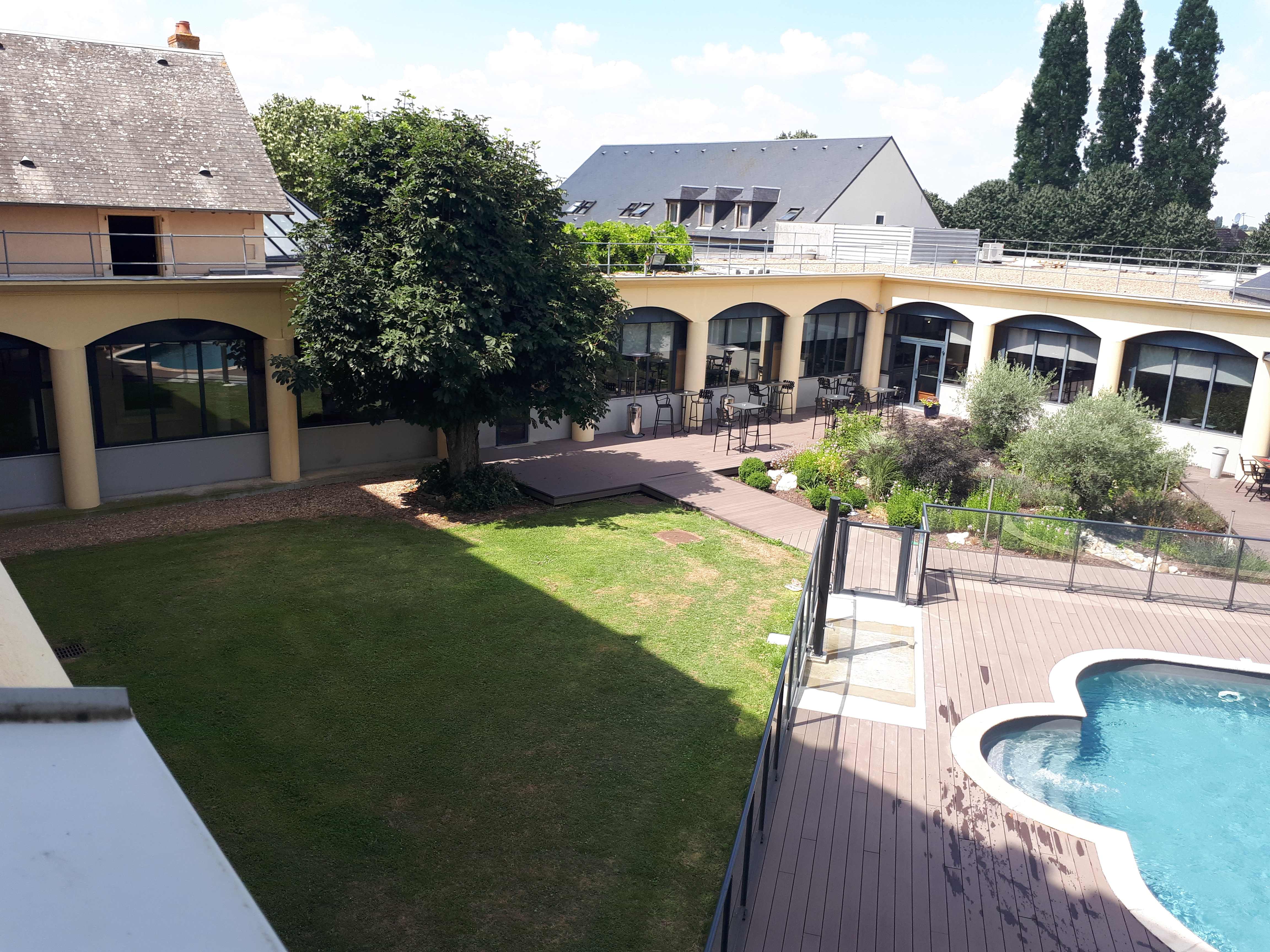 Les + : Piscine, vrais sauna et hammam, salles de jeux (billard, flipper, jeux videos 3D...), salle de sport, tennis, pétanque inclus dans le prix des chambres. Situation entre circuit, karting, golf et campagne. Suite en duplex avec grande terrasse vue sur campagne. Les - : propreté limite dans la suite. Carte non proposée au restaurant, seulement un menu avec choix restreint. Service froid. Ce n'est pas un hôtel restaurant de luxe mais cela reste une très bonne étape. On reviendra.