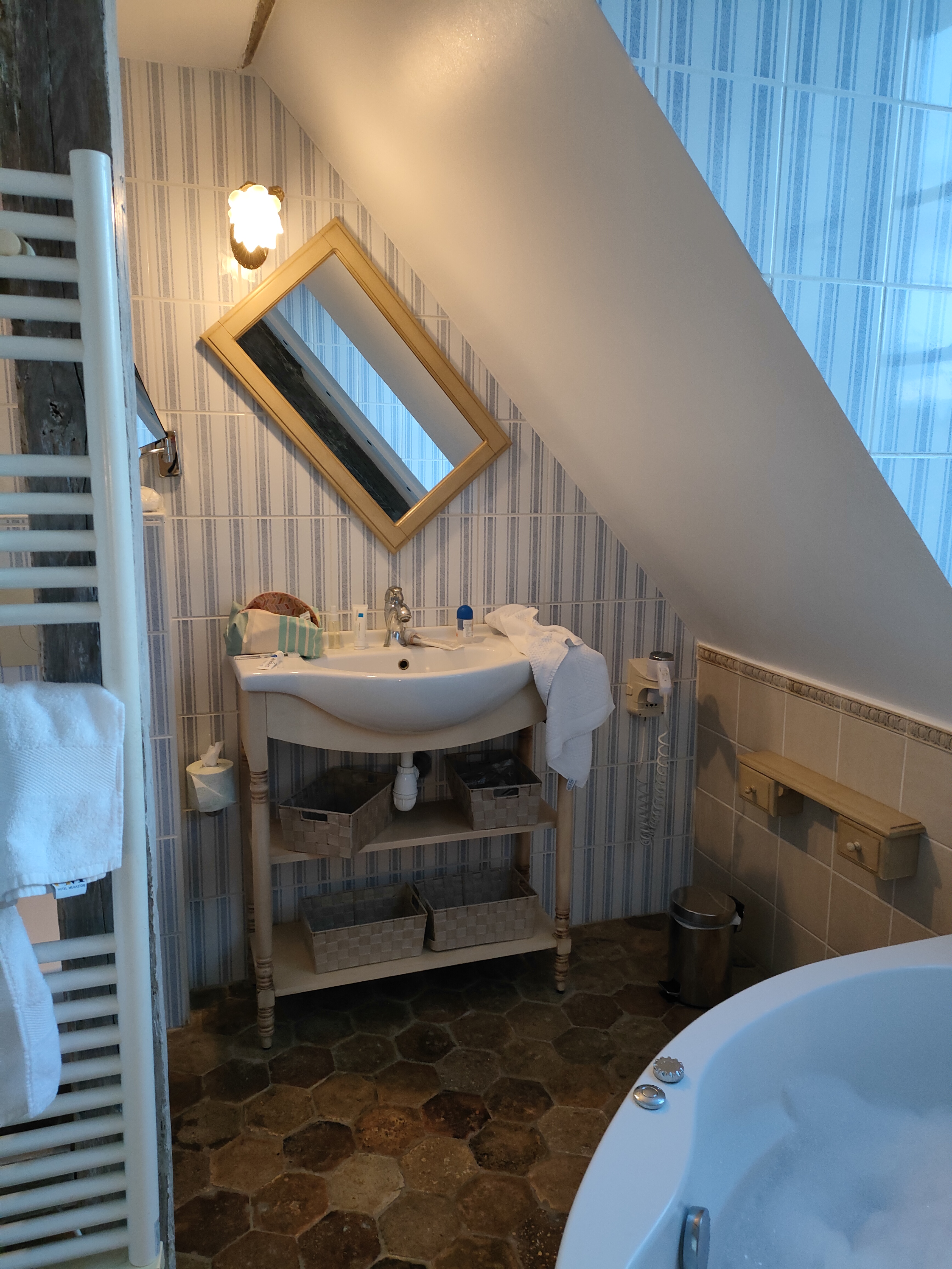 Nous étions dans la chambre des anges. Nous l'avons adorée avec son petit salon cosy. Petit déjeuner copieux. Nous avons aussi mangé au restaurant de l'hôtel, très bon. Tout cela avec des personnes bienveillantes, à l'écoute et disponibles pour leurs clients.