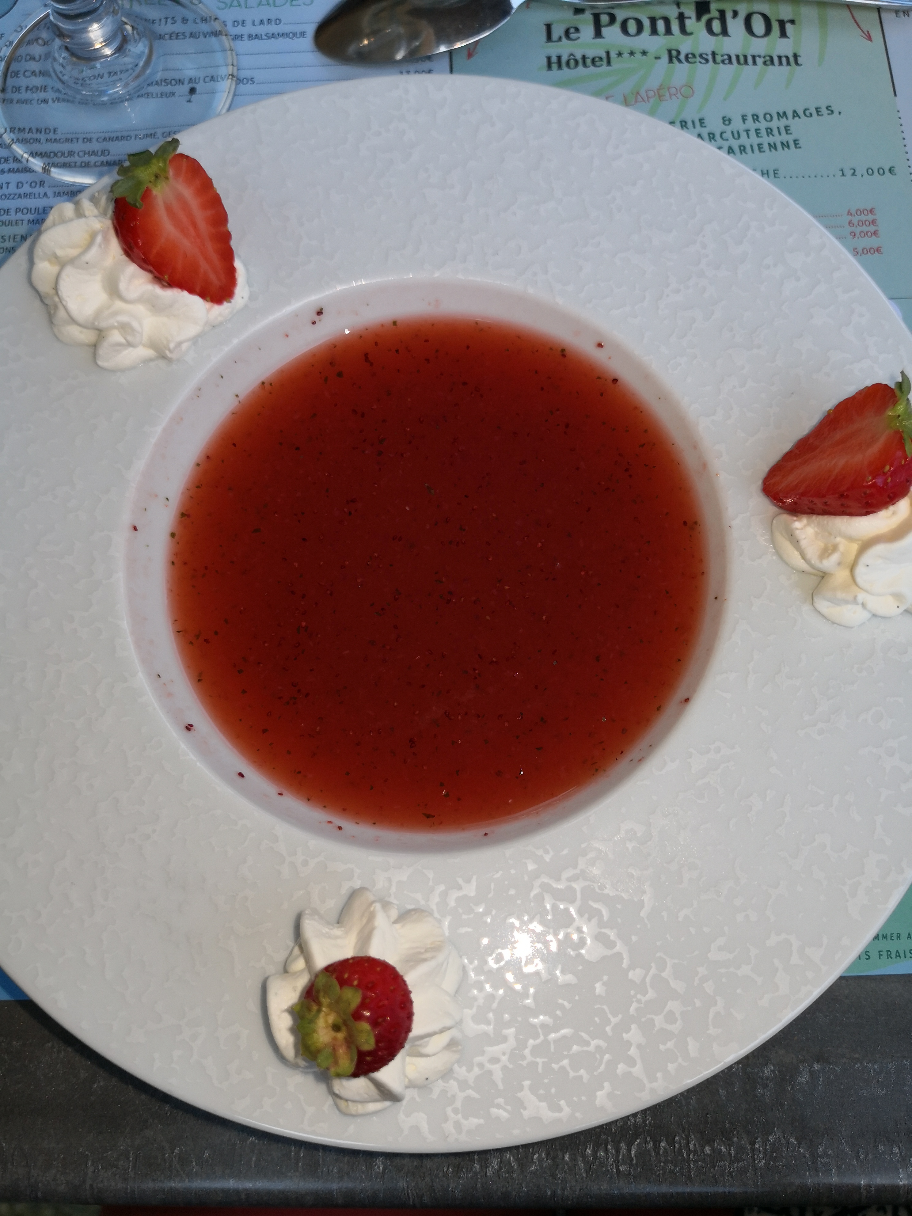 Le menu du jour est très appréciable. Le gaspacchio est excellent. Un peu moins satisfait de la viande tendre mais fort cuite. La salade de fruits est composée de fruits frais.