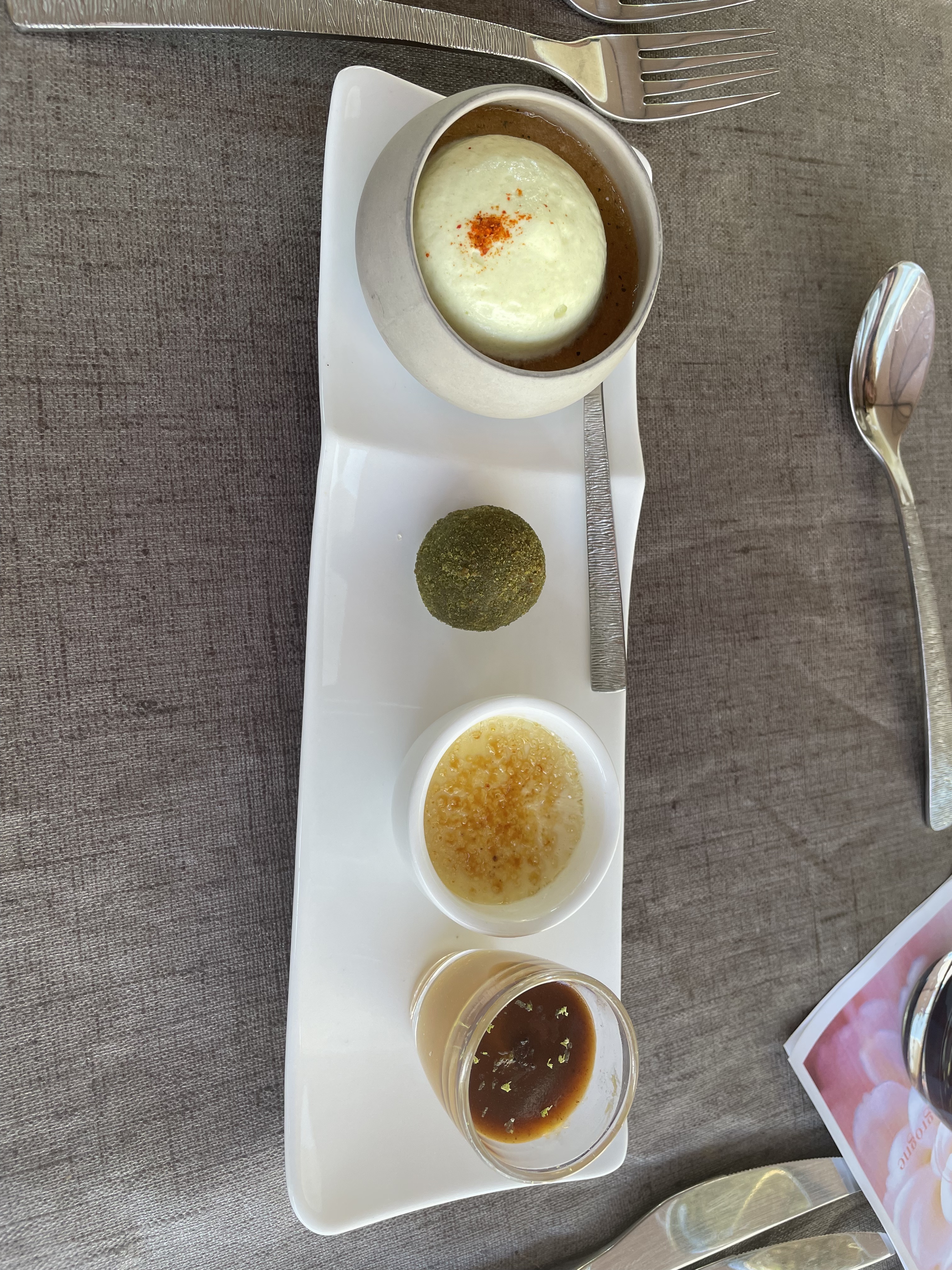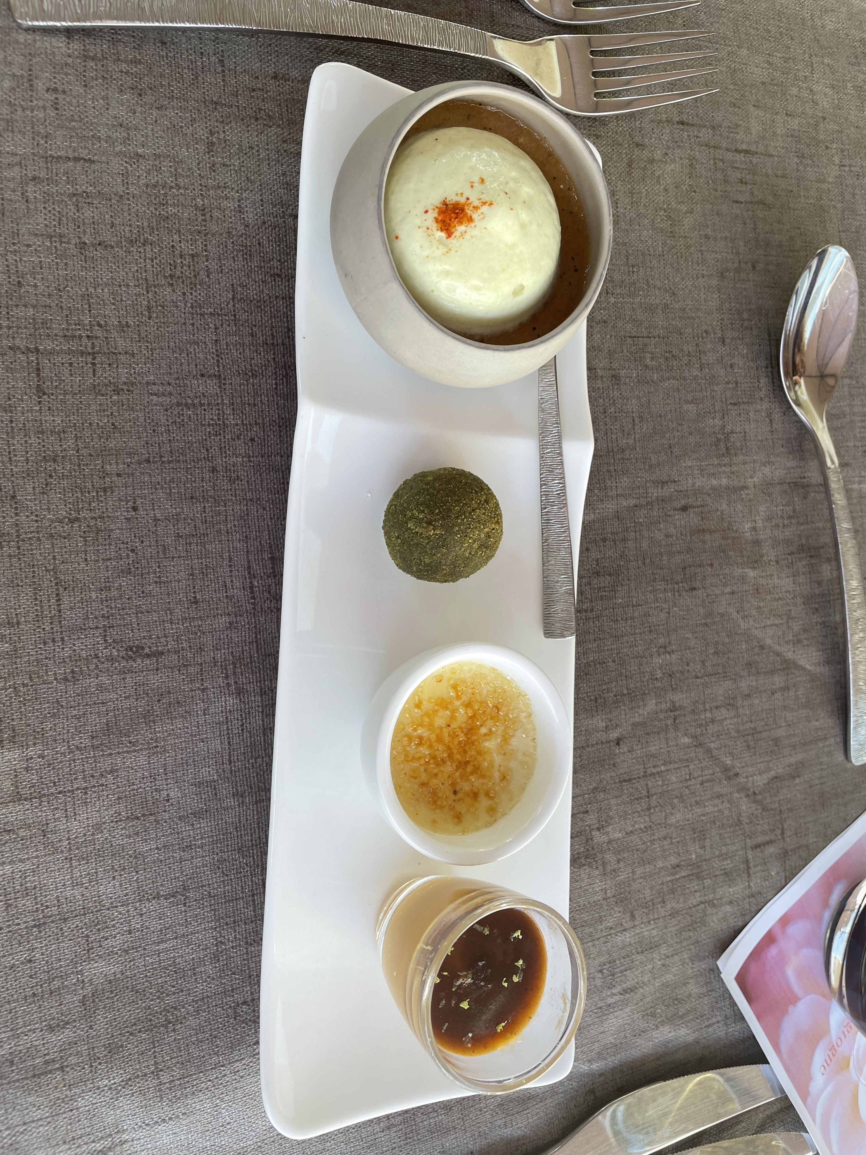 Excellent des premices au dessert. J'ai bcp apprécié les mélanges saveurs sucre dessert à la fraise et petits pois ou bien entre terre et mer (gambas et boudin noir) . L'entrée aussi. Service impeccable. On reviendra