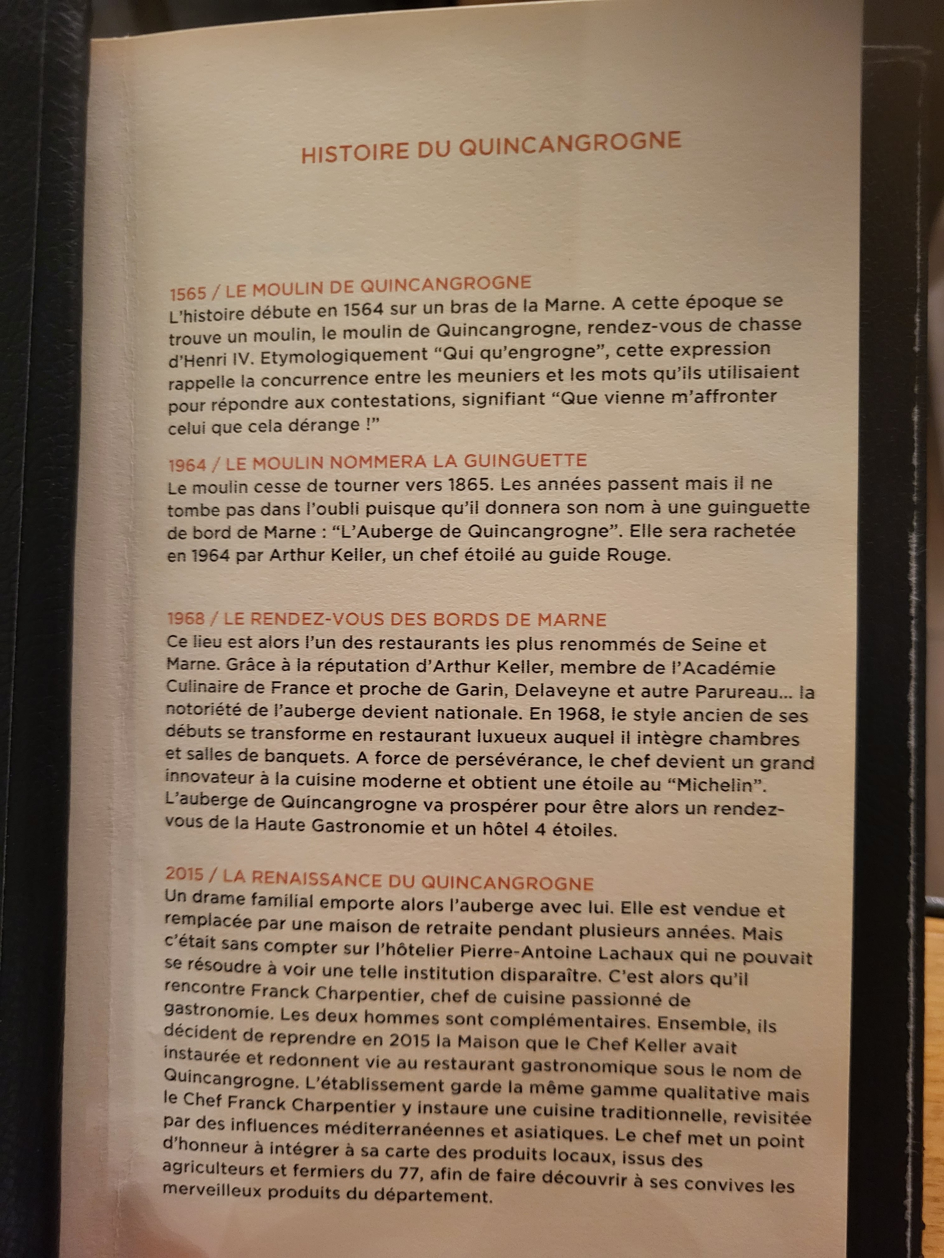 Bonjour Quel régal ! Nous sommes allés au Quincangrogne pour l'anniversaire de ma femme, le 23/9. Pas évident de trouver le restaurant en bord de marne mais au final ça valait le coup ! Nous étions 4 : 3 adultes + 1 ado Nous sommes partis sur la formule entrée + plat + dessert et nous avons été gâtés ! En entrée : le foie gras savoureux et l’œuf mollet de Dampmart avec son lard et ses girolles ont recueilli tous les suffrages... En plat, c'est le thon rouge qui pour moi que j'ai adoré, tellement bien cuit, juste ce qu'il faut pour savourer le poisson et le tartare de tomates anciennes pour voyager encore plus loin (vous croquez et les saveurs se répandent, magique ! ) Et nous avons fini (presque tous) sur le dessert au chocolat Caraïbes accompagné de myrtille et d'une crème glacée à la cardamome, tut cela accompagné d'un vin divin. Vraiment, c'est une belle découverte. Dommage qu'à 20h30 la nuit soit déjà tombée, car devant la Marne ça aurait été encore plus magique. Je voulais remercier le chef Franck Charpentier et son équipe dont l'équipe en salle pro et sympathique. Autre belle idée, voir depuis la salle les cuisines et la réalisation des plats se faire...