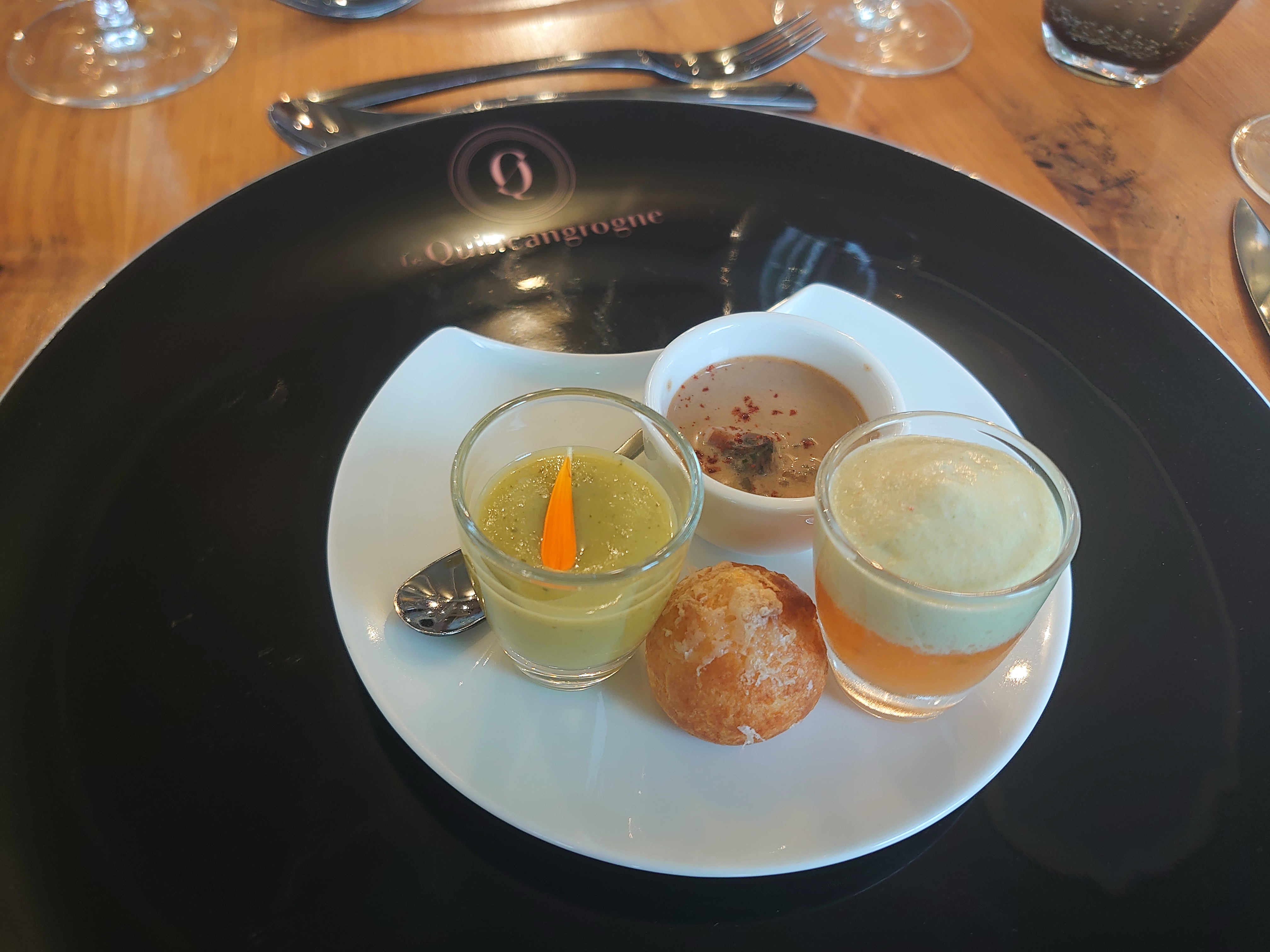 Passé le hall d entrée, un cadre idyllique nous attend: une terrasse en bord de Marne qui jouxte un jardin bien herboré et une belle lumière de début de soirée. Dîner en extérieur avec un menu épicure accompagné d un délicieux jurançon blanc . Toujours de très beaux visuels pour ces assiettes aux multiples saveurs , avec des cuissons justes . Des produits souvent du terroir , associations originales et réussies . Un service bien rythmé, agréable et souriant à la hauteur de ce restaurant étoilé. Merci à toute l équipe du Quincangrogne !