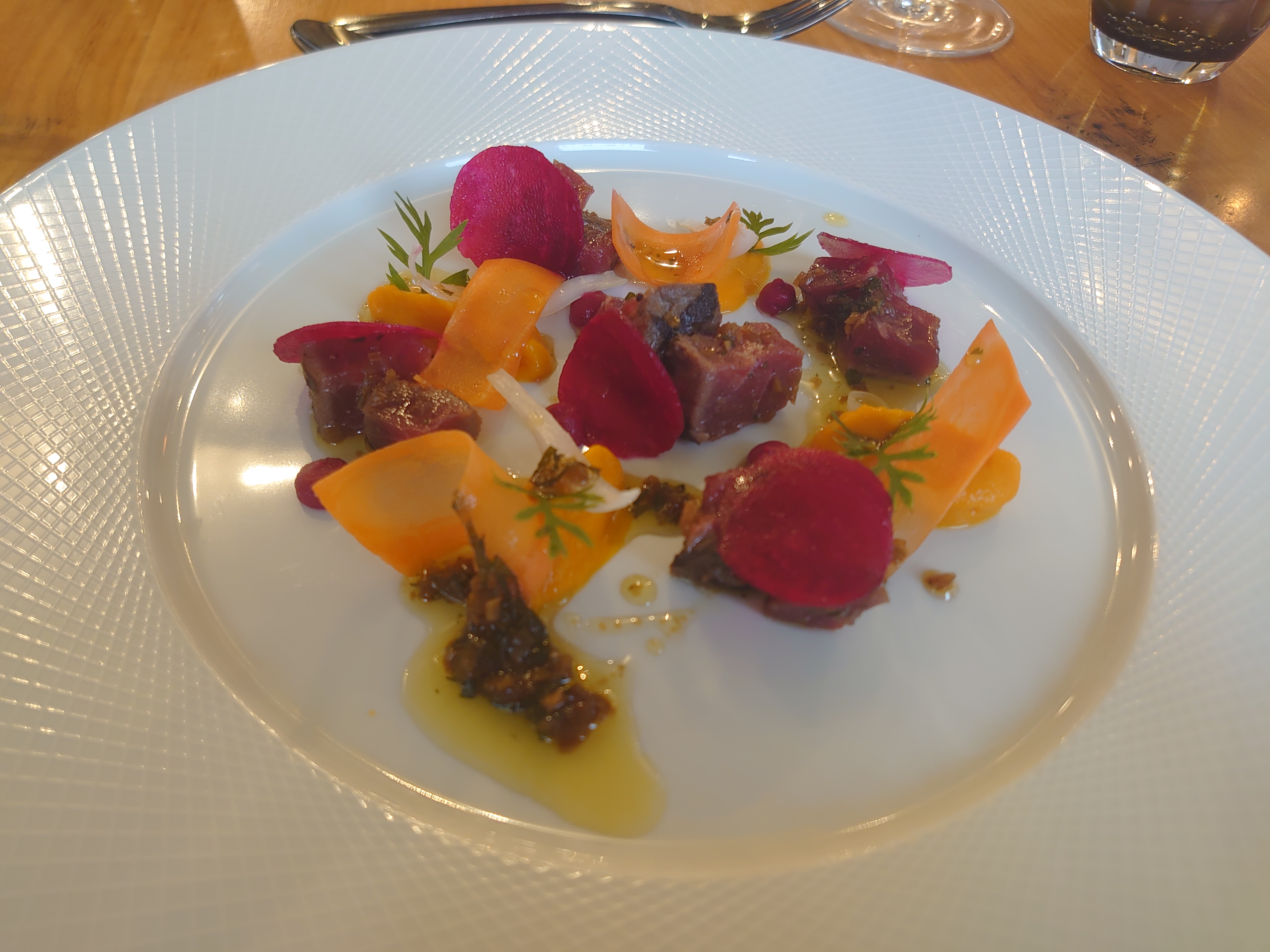La ballade culinaire est plutôt sympathique et le personnel très efficace. J'ai pris un menu dans lequel on me servait un verre de vin associé au plat. Le même vin a été servi à mon épouse qui avait un plat très différent du mien. Pourquoi pas me direz vous. Mais le vin était très froid. Trop froid. En fait toutes les bouteilles pour la salle sont placées dans un immense bac à glaçons. Ce n'est pas sérieux. Pour le reste il y aurait beaucoup à dire mais je reconnais le professionnalisme de la cuisine, même si je n'ai pas eu d'effet waouh.