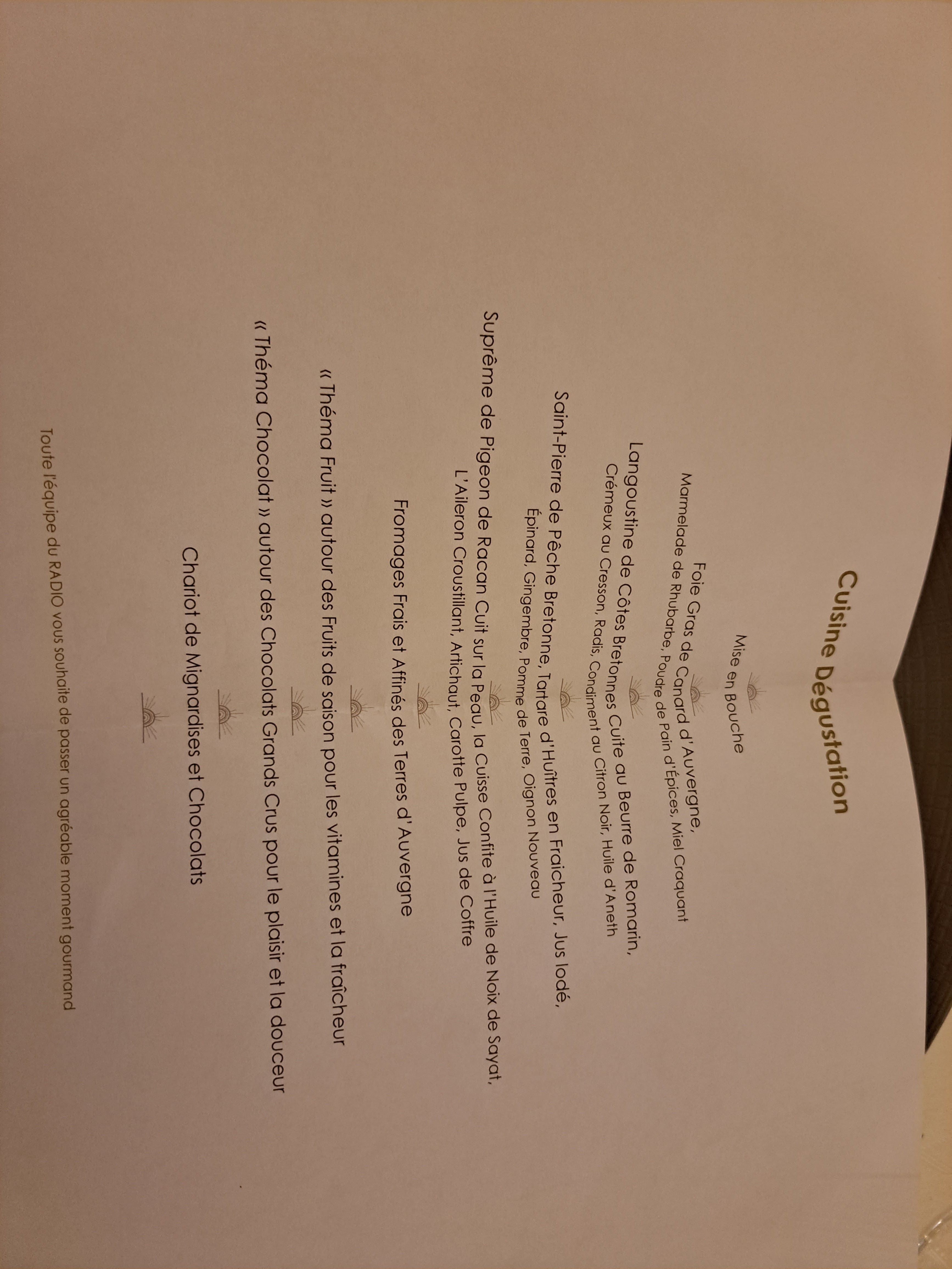 Excusez-mon retard… et oui, ce n’est pas tous les jours la fête !! Restaurant de l’hôtel Radio… Magnifique où nous avons passé en famille un délicieux moment de plaisir pour un anniversaire. L'accueil y est chaleureux et le service est agréable et irréprochable. Nous avons savouré cette soirée. Nous félicitons le chef Wilfrid Chaplain et sa brigade, Caroline Mioche, pour son accueil chaleureux et sa gentillesse, et son équipe qui nous a servi une cuisine raffinée, tout simplement délicieuse des amuse-bouches, de l'entrée jusqu’aux desserts puis aux mignardises : nous avons choisi le Menu Cuisine Dégustation et nous avons été comblés. Au plaisir de revenir pour fêter un autre anniversaire !