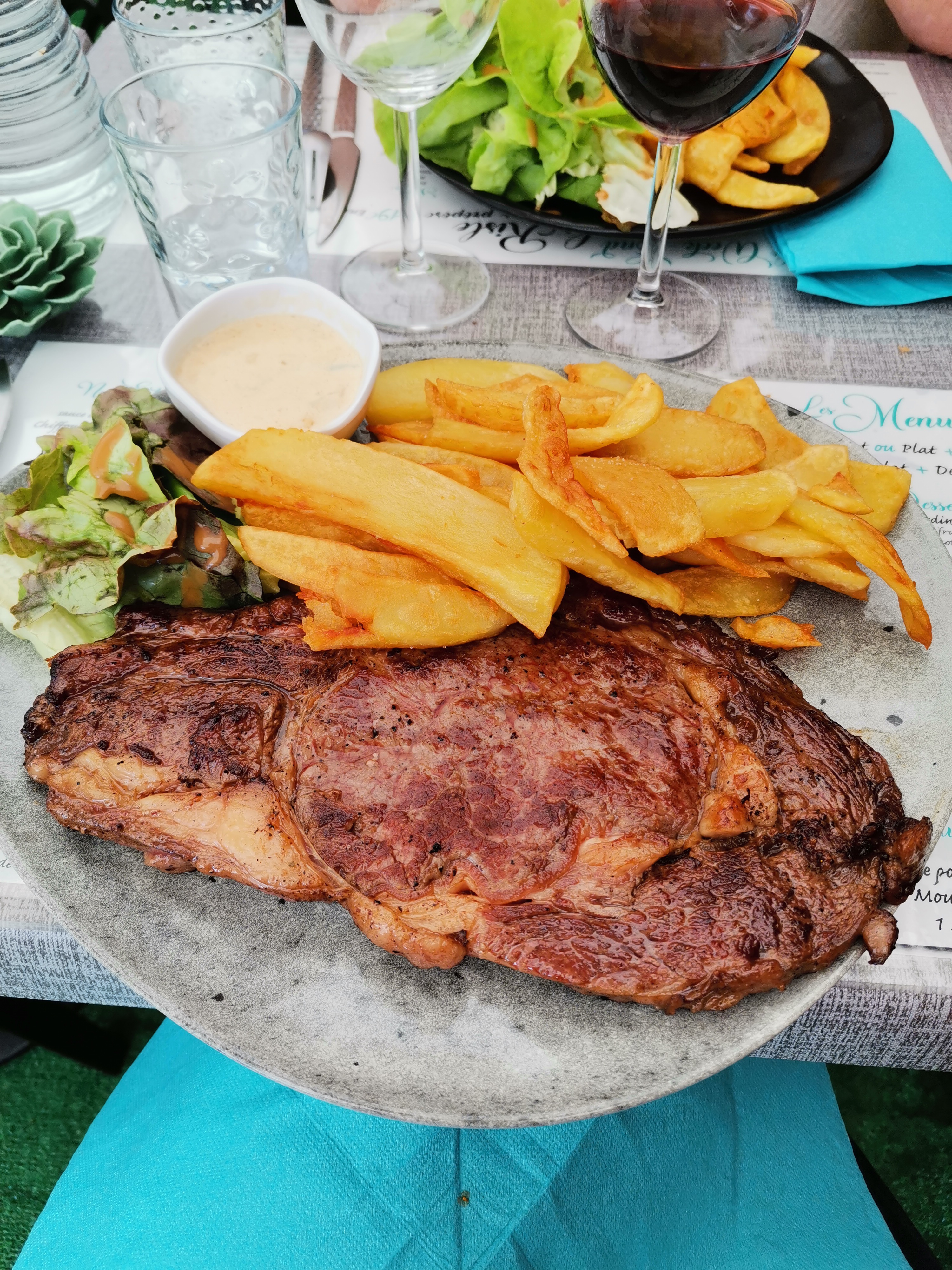 Une Entrecôte!!!!!!! Pouah...une tuerie! Et des frites comme j'en ai rarement mangé. Merci du plaisir que vous prenez à nous servir!