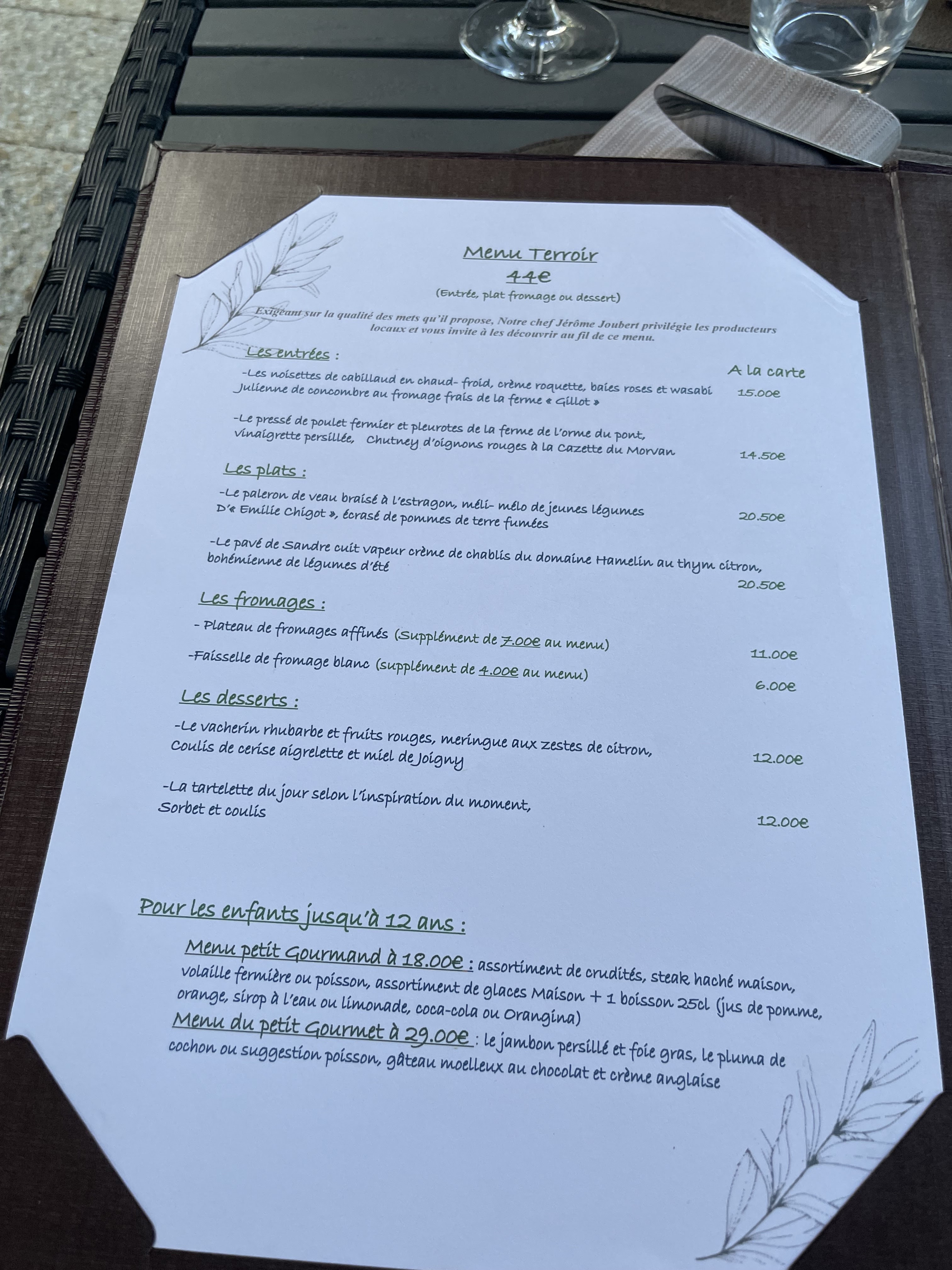 Bon restaurant ! Le cadre est très sympa et calme. La terrasse est reposante avec sa vue sur l’Yonne. Beaucoup de choix sur la carte avec la possibilité de choisir plusieurs entrées, plats et desserts. La carte change selon les saisons ce qui vous permet de toujours découvrir de nouvelles saveurs. Seul petit problème de mon point de vue se situe au niveau du parking qui ne possède pas de borne de recharge pour les clients que ce soit du restaurant ou de l’hôtel. Au delà de ça rien a redire !