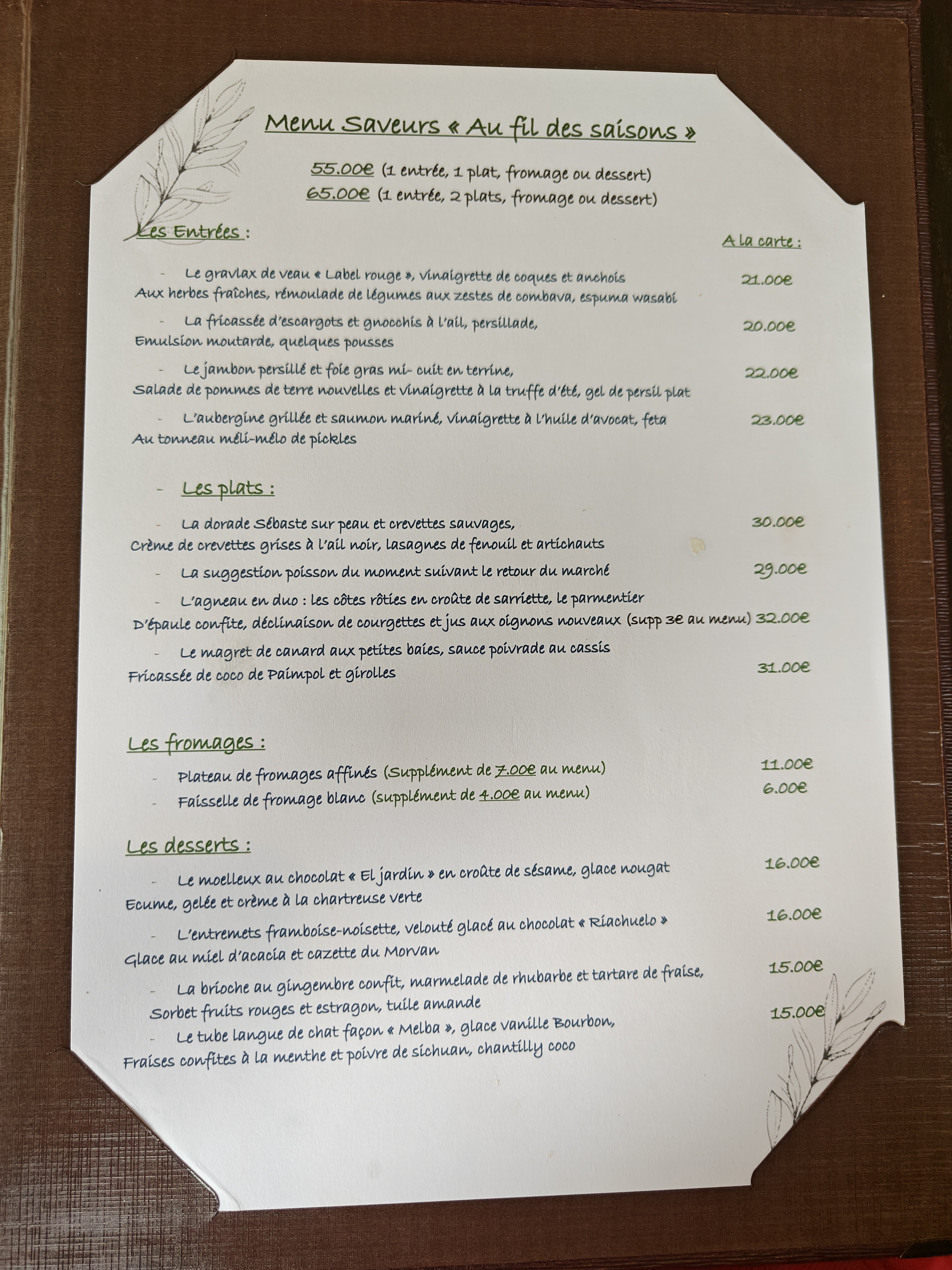 Formule plat dessert un verre de vin café à 31 euros très correcte. Excellent café. Service parfois débutant mais empreint de gentillesse Cuisine plutôt savoureuse Mais que c'est long ! Seule la patronne prend les commandes et pas toujours dans l'ordre d'arrivée des tables. 35 minutes d'attente entre l'offre de la carte et la prise de commande. Résultat: nous avons revu nos choix en supprimant l'entrée pour rattraper le temps perdu. Dommage !