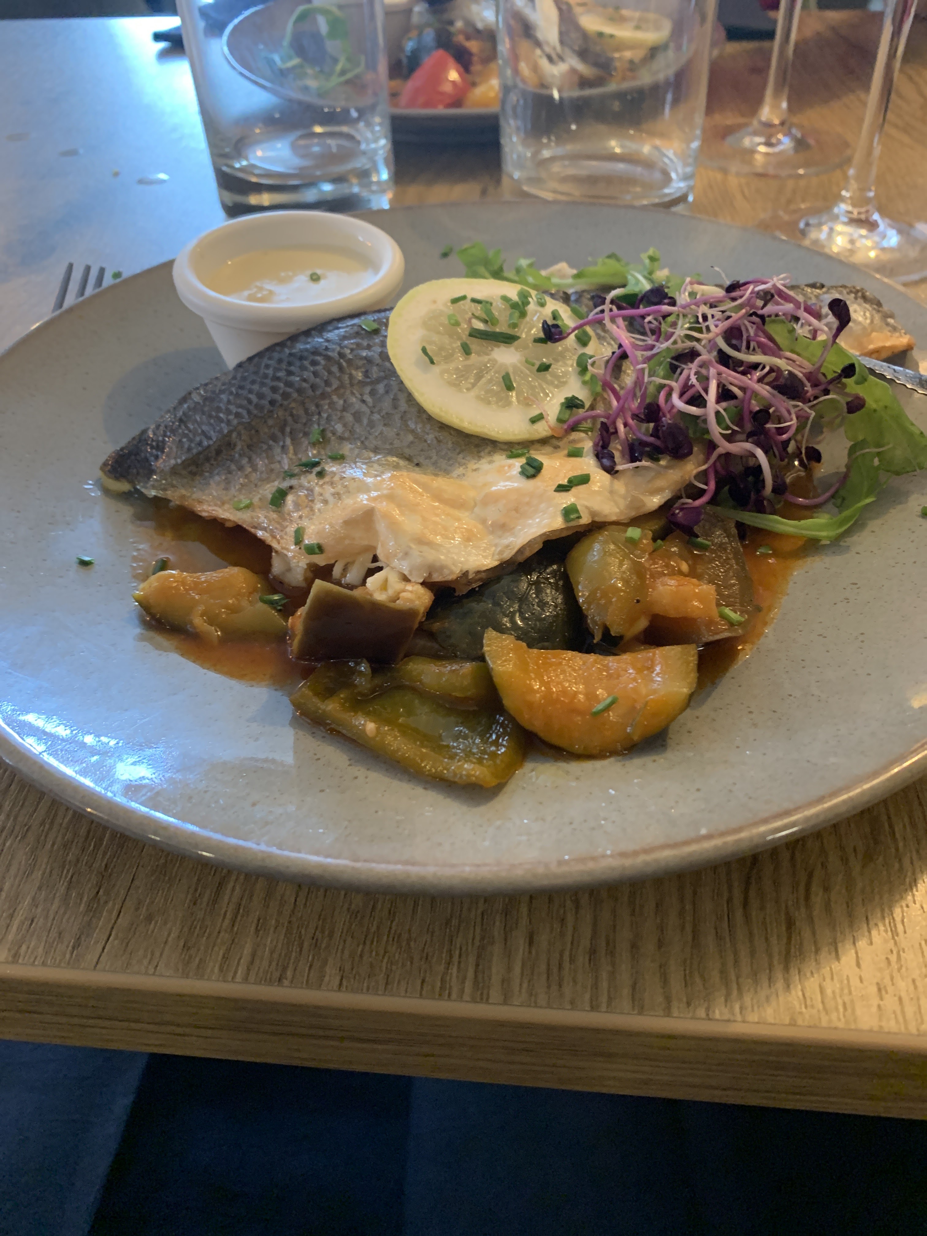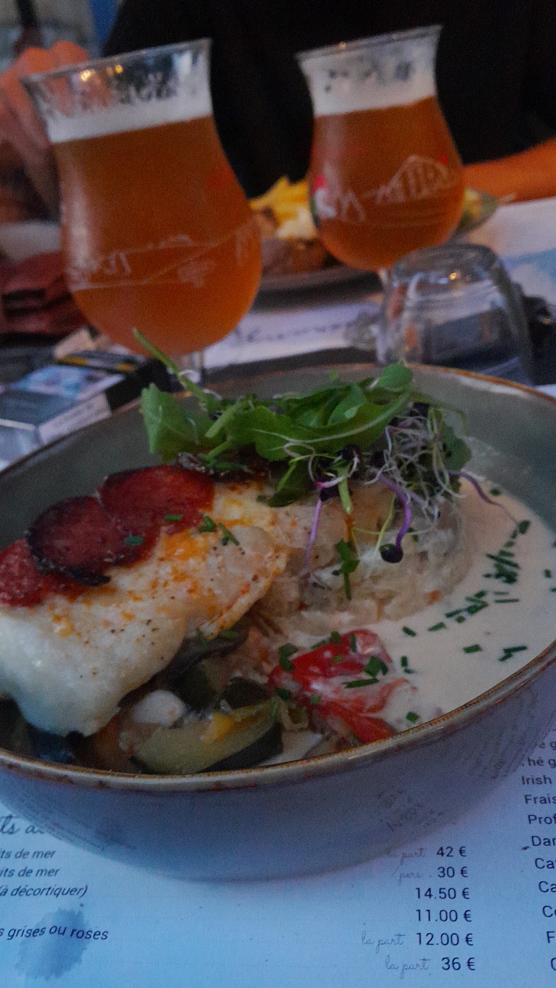 Restaurant superbe et très bon personnel ! Une belle carte proposée avec du choix sans trop non plus ! C'est ça qu'on aime ! Nous avions pris le cabillaud en croûte chorizo parmesan et la brochette de lotte au lard. Très jolie présentation et quantité parfaite Un petit bémol pour mon plat (lotte) la sauce qui l'accompagne était vraiment très salée, avec le lard cela faisait beaucoup...dommage. Le reste excellent. Je recommande ! En ces moments pensez à réserver par contre.