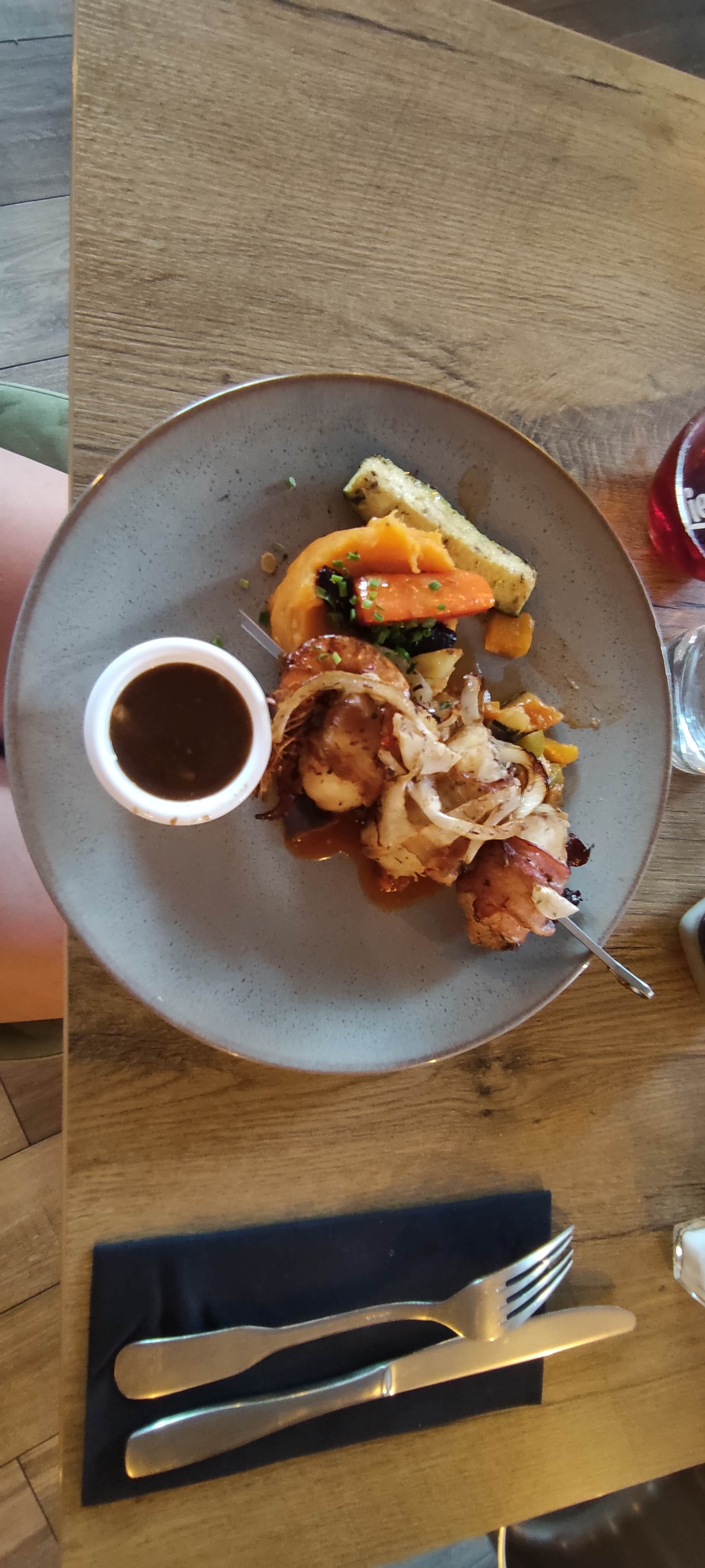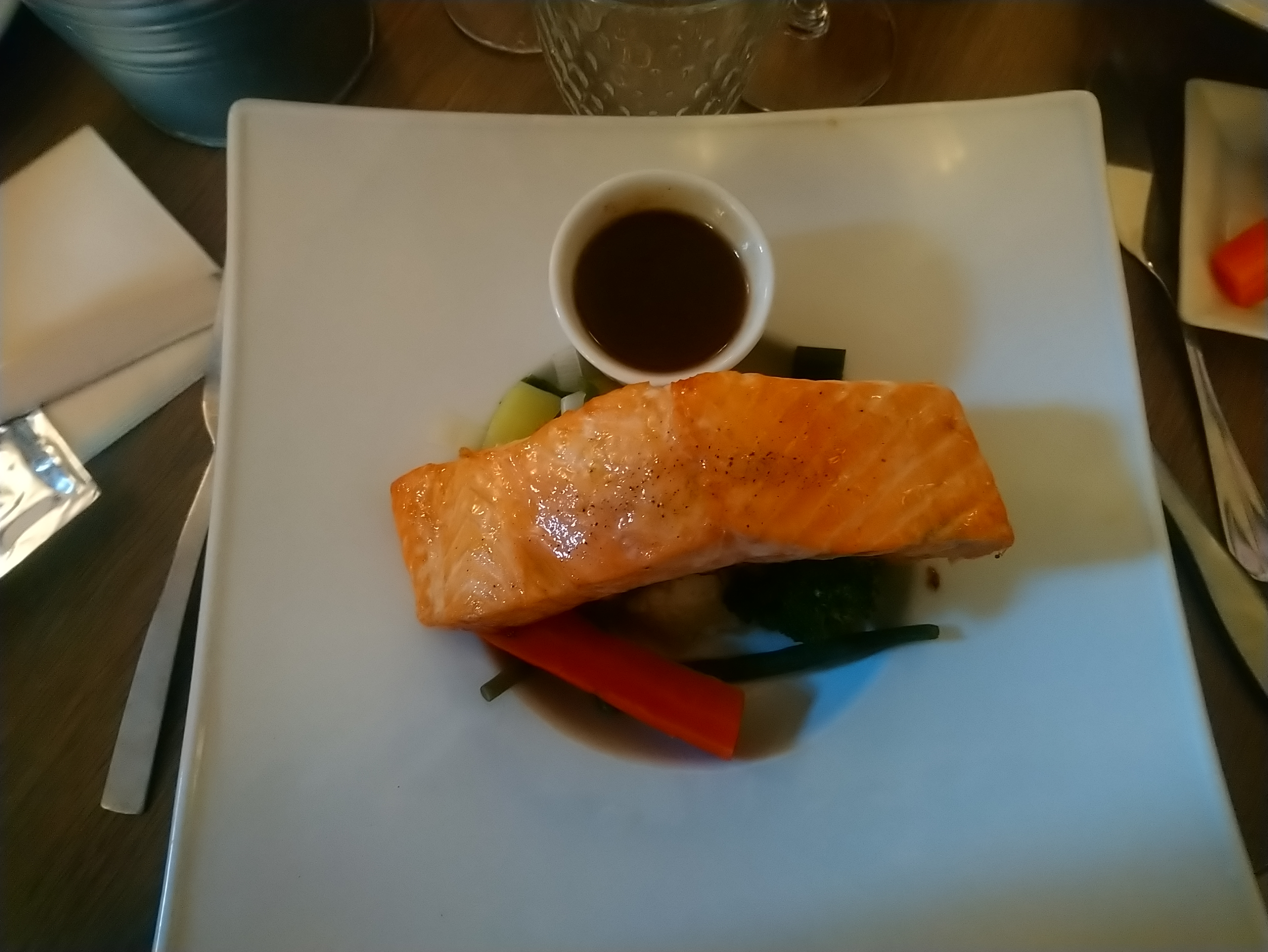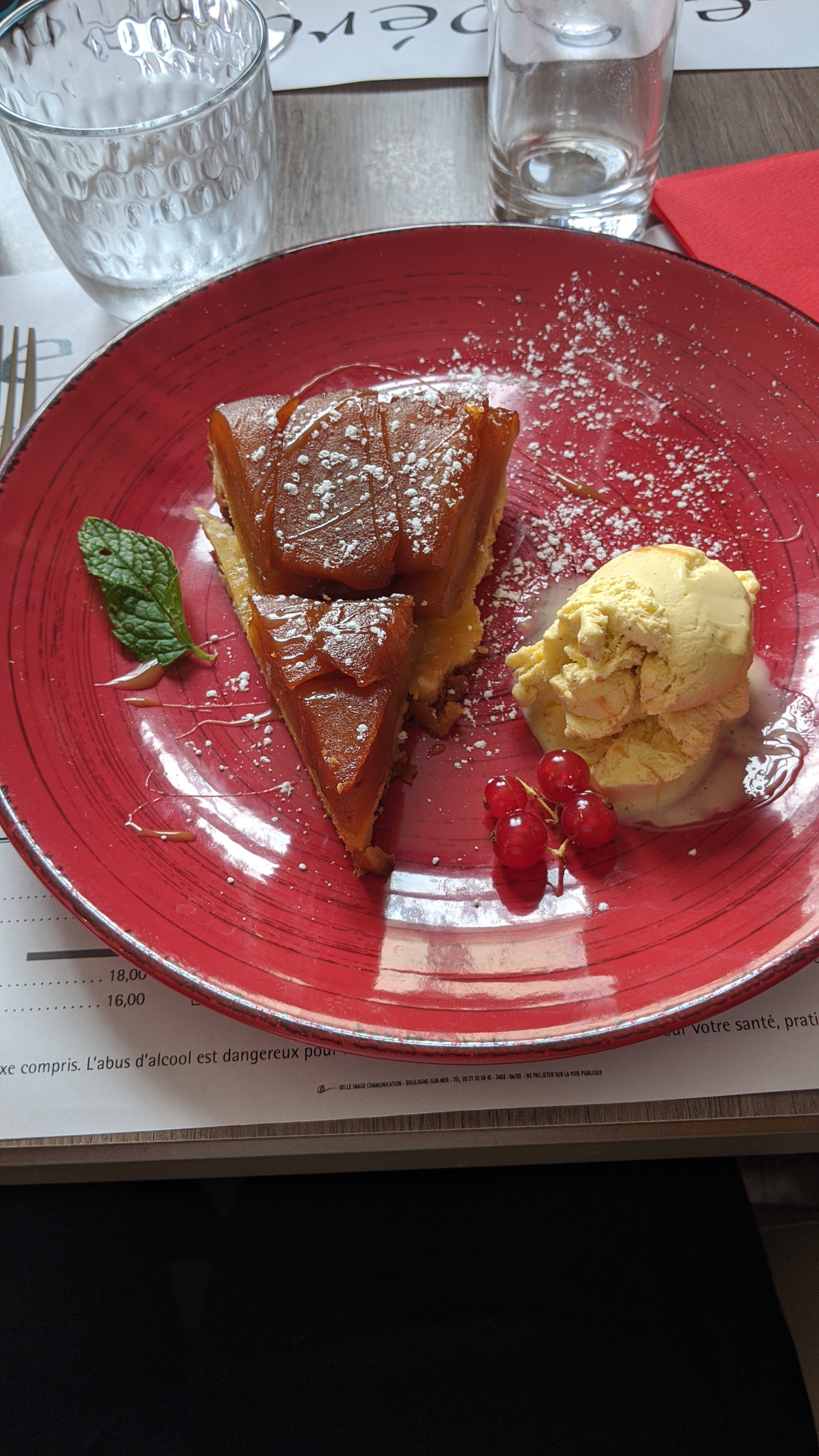 Le saumon était un peu trop cuit, les légumes ratatouille froid mais dans l'ensemble le goût était bon. Accompagnement trop léger pour moi (1 cuillère de ce qui semble être de la purée de pommes de terre) sinon tarte tatin très bonne.