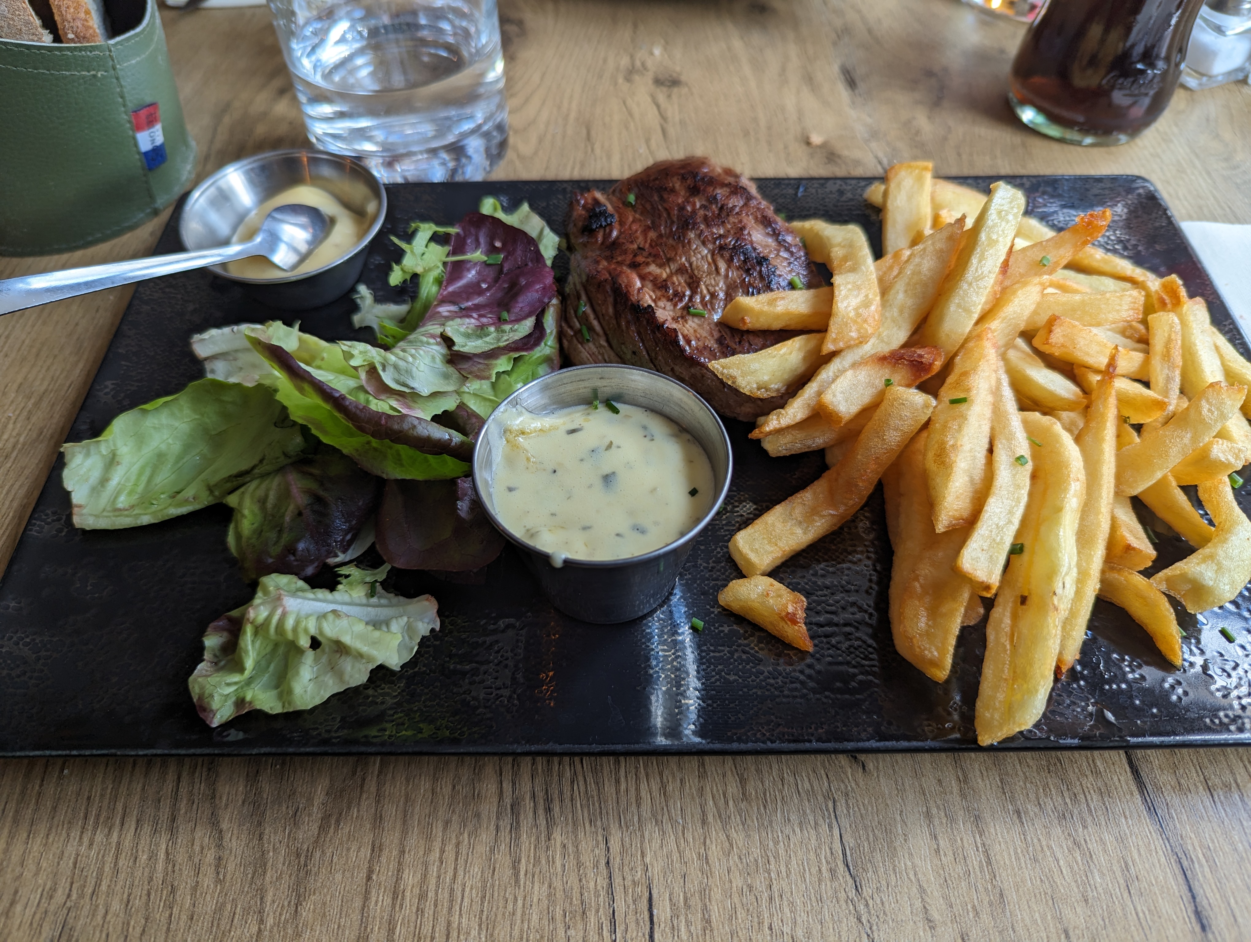 Nous sommes arrives 5 minutes avant la fin du service de midi. Nous avons malgré cela été très bien accueillis. Les moules étaient délicieuses et servies copieusement pour un prix très abordable (12-13 euros). Tartare bon, mayonnaise, pièce de viande et frites très bonnes. Service parfait. Nous recommandons.