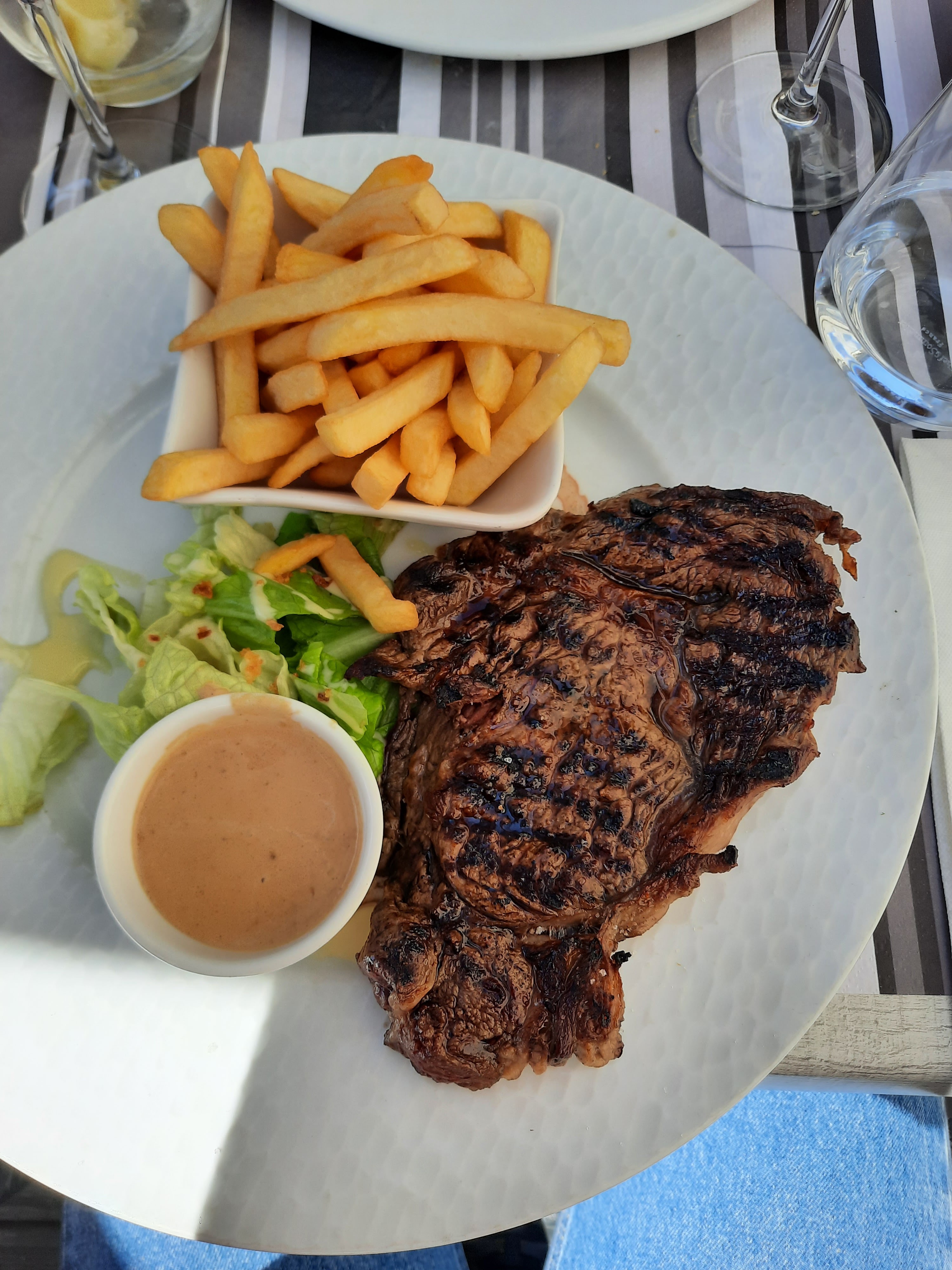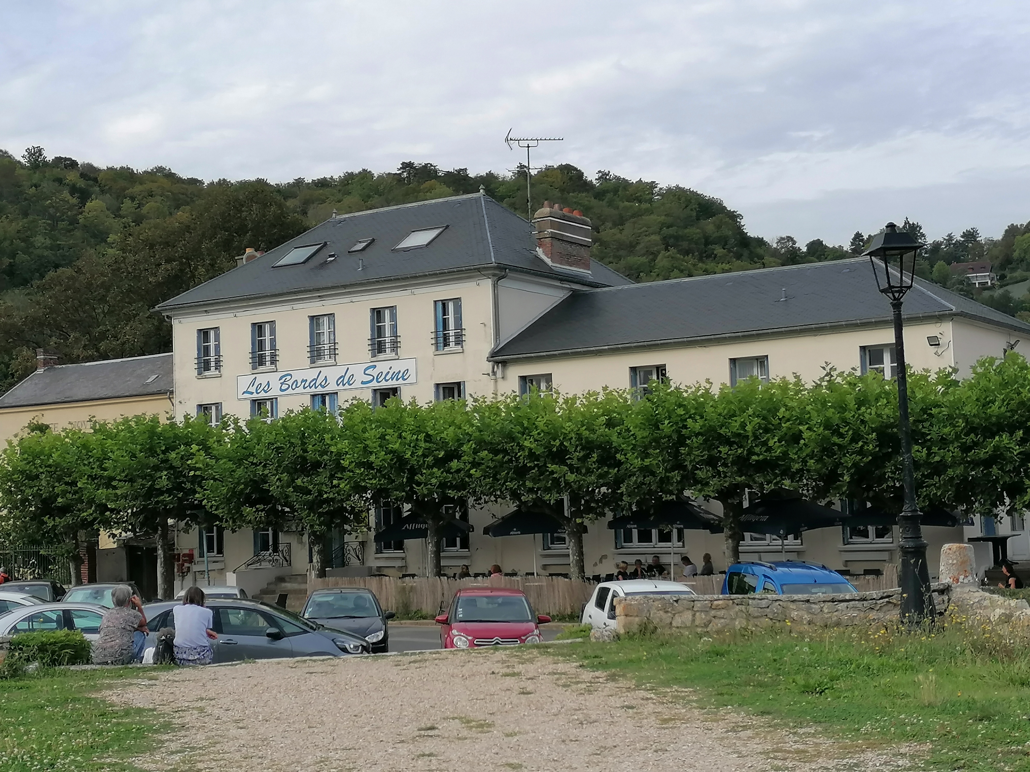 La ville est très sympa, en bord de Seine à environ 10 minutes de la maison de Monet Nous avons mangé dehors En entrée, deux poissons de rivière frits sauce tartare En plat, ma femme a pris un tartare, j'ai eu un rognon de veau sauce moutarde Tout est très bon et bien servi Je le recommande vivement, tant pour le pays que pour la nourriture