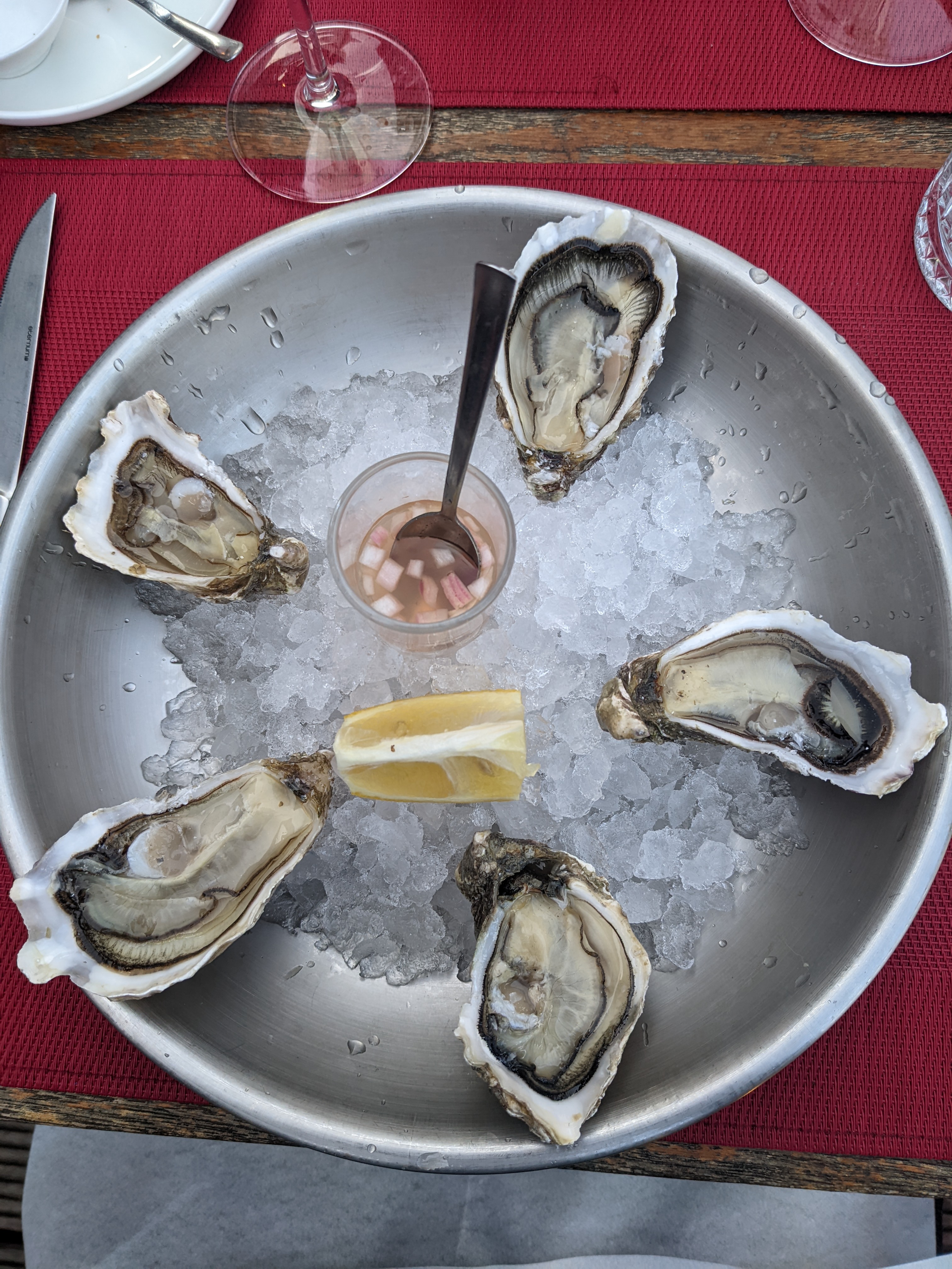 26 septembre 2021 nous sortons de ce restaurant spécialisé en fruits de mer: en entree On nous explique qu il n ya plus d huîtres car ils partent en vacances, nous choisissons des œufs mimosa . Viennent plusieurs clients après nous qui commandent le même menu on leur trouve des huîtres à eux. Il n y avait plus d œufs mimosa certainement. Pas de possibilité d arrangement avec le patron Il est certainement fatigué par sa saison.