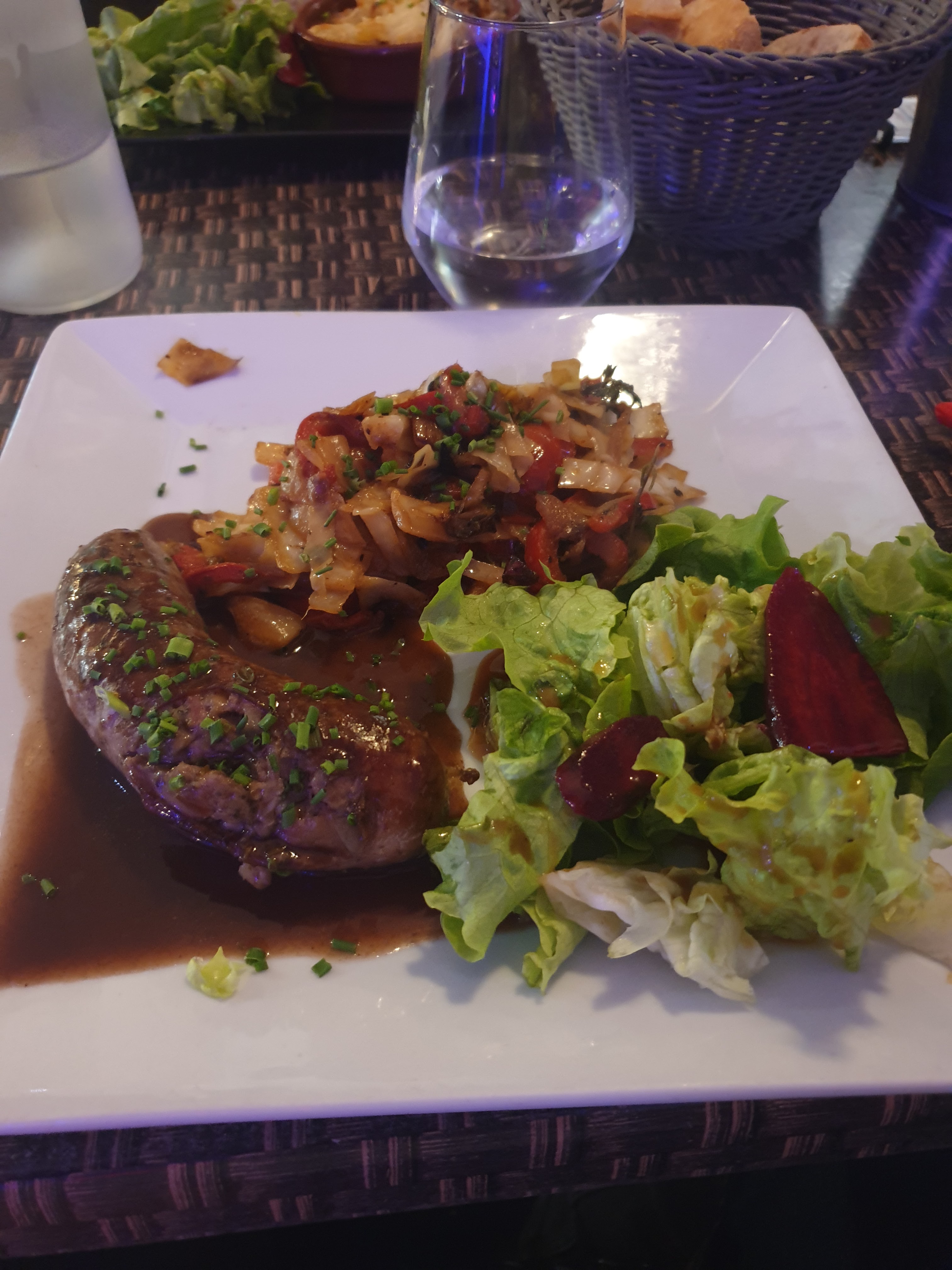 Nous appelons pour réserver à l'extérieur, uniquement c'est la seule possibilité pour nous de manger au restaurant, bilan ok pas de souci et on nous préviens qu'il fait frais le soir. On arrive et on est très mal reçu car ils ne veulent pas que nous soyons dehors.. bref finalement on y arrive. On nous installe au choix 2 tables, les pires sans lumière, on ne nettoie pas la table avant, mais passons. Une serveuse fini par nous proposer une formule pas trop mal, mais le capraccio est en fait juste du saumon mais pas en mode carpaccio. Nous prenons des viandes 3 différentes nous sommes 4, toutes filandreuses et nerveuses. On le fait gentiment remarquer et aucune réaction. Les assiettes sont posées de manière brutal et nous sentons que nous derangeons. Rien de bien terrible au vu du prix. Dommage le cadre est joli mais nous avons juste profité de la route et d'un mur. Nous sommes commerçants dans les environs et recherchons de bonnes adresses pour nos clients. Celle-ci ne fera pas partie de nos recommandations. Déçu 😞 cher et qualité moyenne.