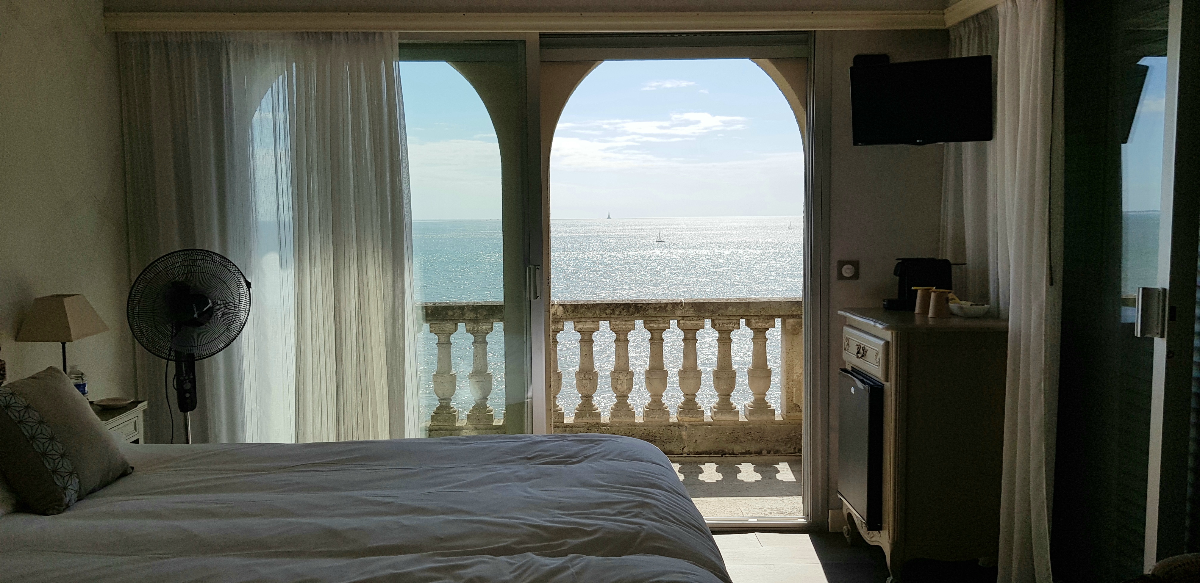 Très très belle vue sur le phare de cordouan et sur les carrelets de saint palais sur mer. L accueil est chaleureux, la chambre très confortable (il faut aimer le style 1900, rococo) et le petit déjeuner aussi copieux qu excellent ! Ne pas oublier la piscine !