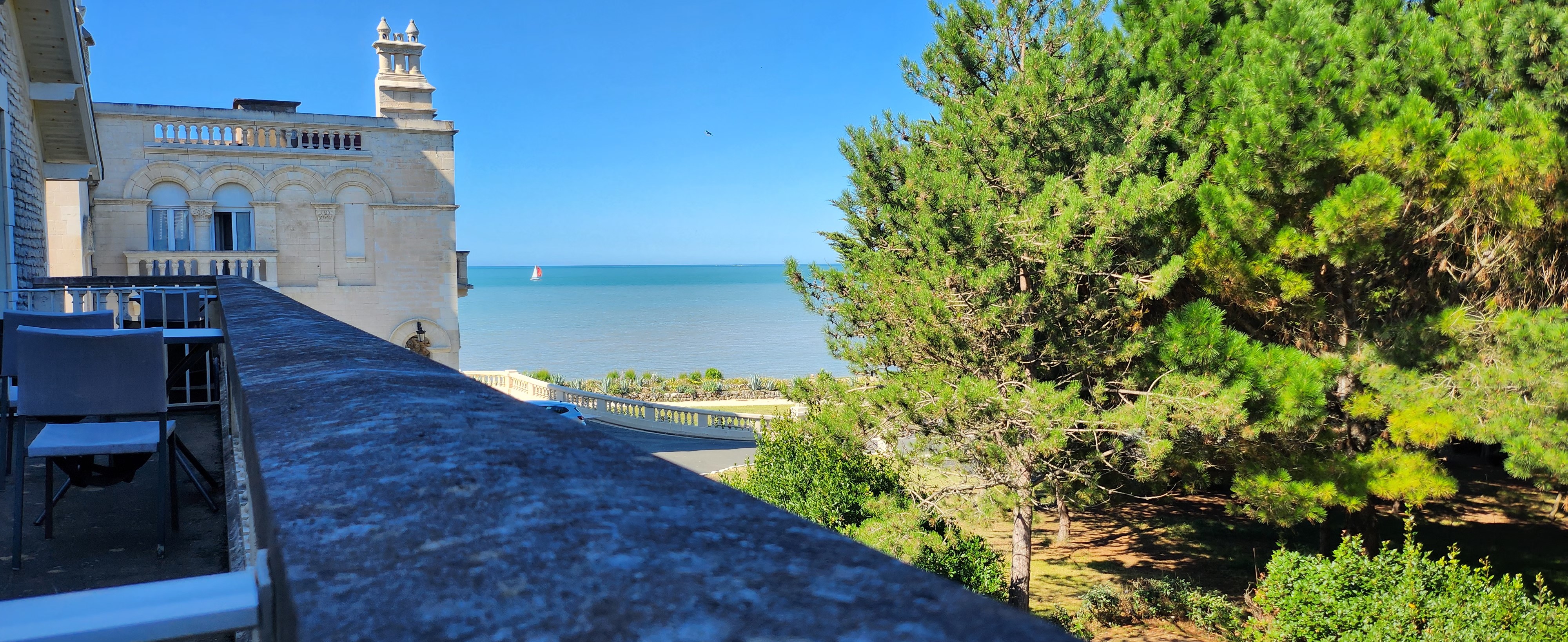 Tout était merveilleux ! L'emplacement, le cadre magnifique, le personnel , les services , le petit déjeuner très copieux et de qualité ( face à la mer un 31 octobre le pied !). Chambre très bien située (dans la dépendance mais vue mer. Literie au top. Vous sortez de ''votre château '' et vous voilà sur un chemin le long de l'océan .... à gauche st Palais à droite la Palmyre ( balade du château jusqu'à la Palmyre les pieds dans l'eau environ 2 h ) . St Palais environ 15 minutes. Hâte d'y retourner 🤗