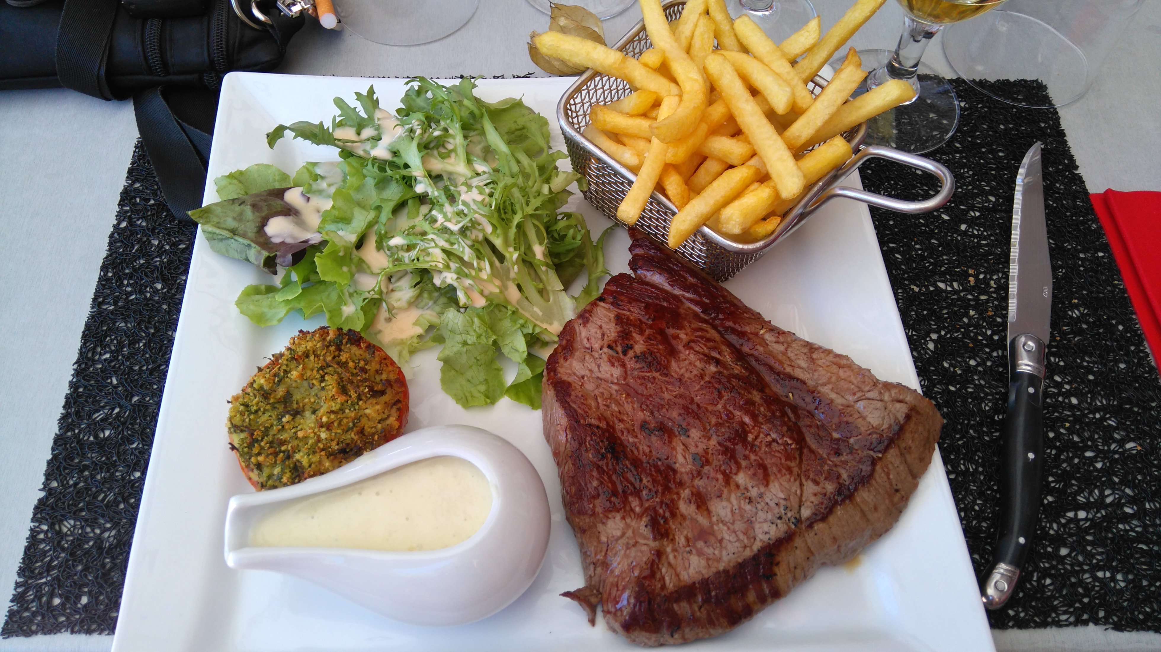 Repas pris le midi, terrasse ombragée. Restaurant familial depuis 1964, produits frais et très bien cuisinés. La pièce de boeuf était un régal, fondante et très bien cuire ; quant à la salade on s'aperçoit tout de suite qu'elle ne sort pas d'un sachet ! Mérite que l'on s'arrête pour se restaurer