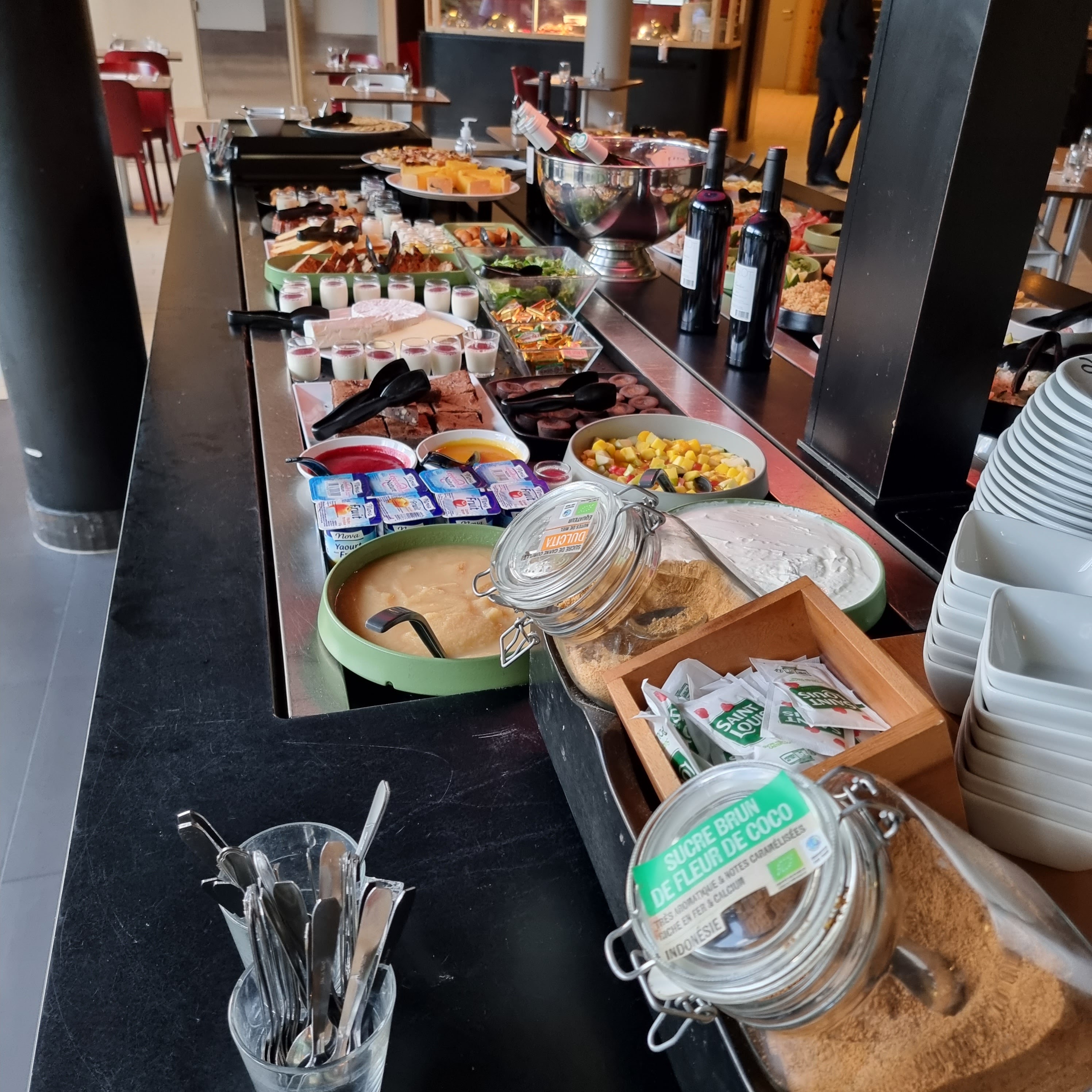 La partie hôtel est cool mais au restaurant la formule buffet chaud a 13.90 est a fuir de toute urgence ça ne vaut même pas un flunch c'est pour dire (pates restant du midi,poisson en mode bloc de ciment et morceaux de pizza jetés sur un plats dommage que cela dégrade la qualité de l'hôtel.