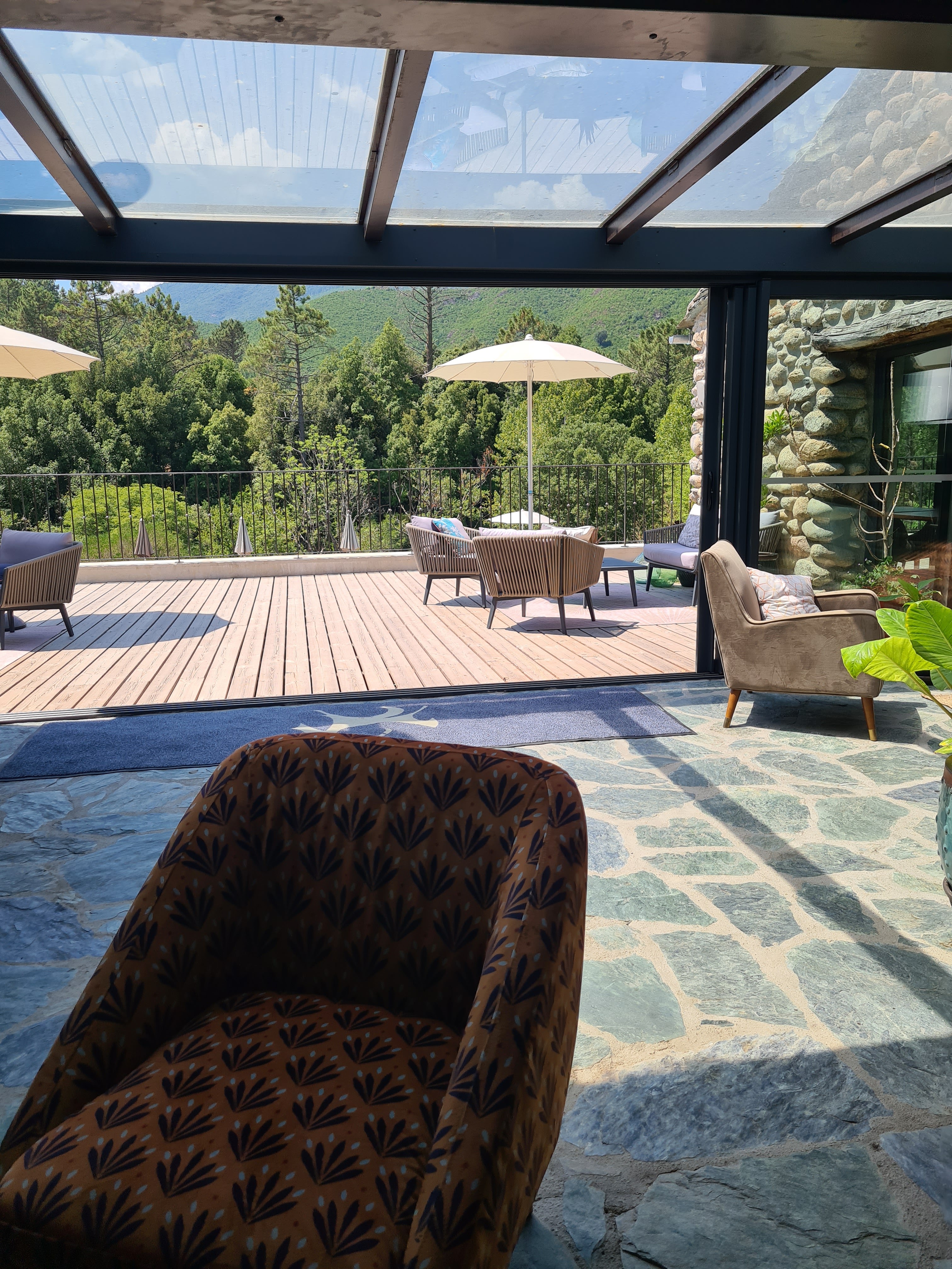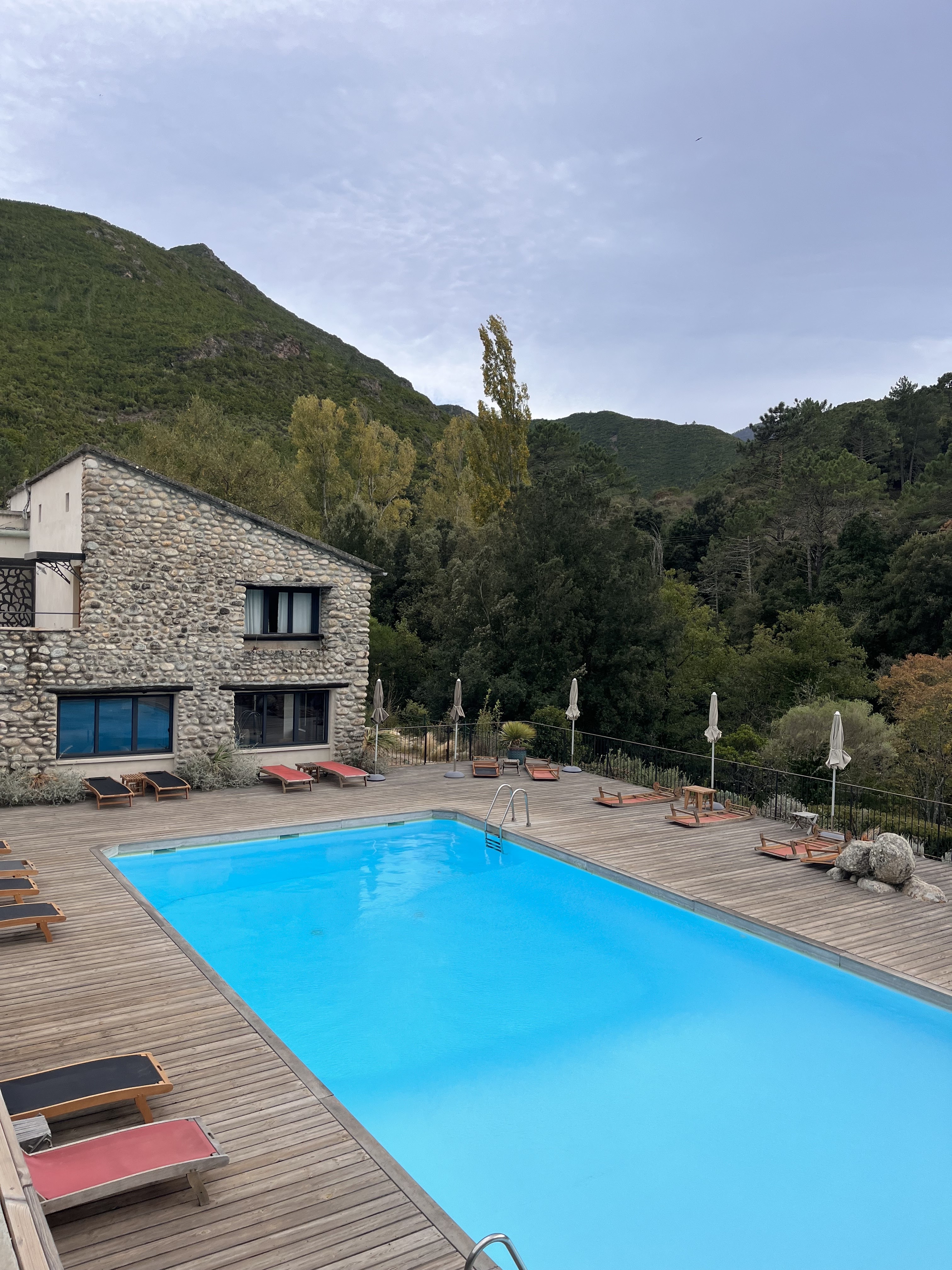 Magnifique hôtel en pierres, situé dans un écrin de verdure. La piscine est grande et la température très agréable, la rivière en contre bas est un vrai plus. La décoration intérieure est de très bon goût, avec une cheminée allumée au moment du service du soir. La partie bar vaut aussi la peine que l'on y prenne un verre. Les cocktails sont très bons et le barman est de bon conseils. Les chambres sont correctes et bénéficient de tout l'équipement nécessaire (serviettes, sèches cheveux, savon, machine à café...). Le petit déjeuner est excellent et très diversifié. Nous déplorons cependant la qualité du service au restaurant. Même si la qualité des repas est là, le professionnalisme de certaines personnes membres de l'équipe reste à revoir. Malheureusement, alors que nous souhaitions prendre le temps de dîner, le repas nous a été servit beaucoup trop vite pendant l'apéritif (15 minutes après nous être assises). La personne qui s'est chargée de nous servir à insisté pour faire goûter le vin alors que nous buvions encore nos apéritifs. Tout est allé beaucoup trop vite. Suite à cela, nous avons préféré nous rediriger vers un restaurant de Venaco pour le dîner suivant. Je pense que le service n'est pas digne d'un hôtel de ce standing et je regrette de ne pas avoir pu laisser 5 étoiles à cet hôtel pour cette raison là.