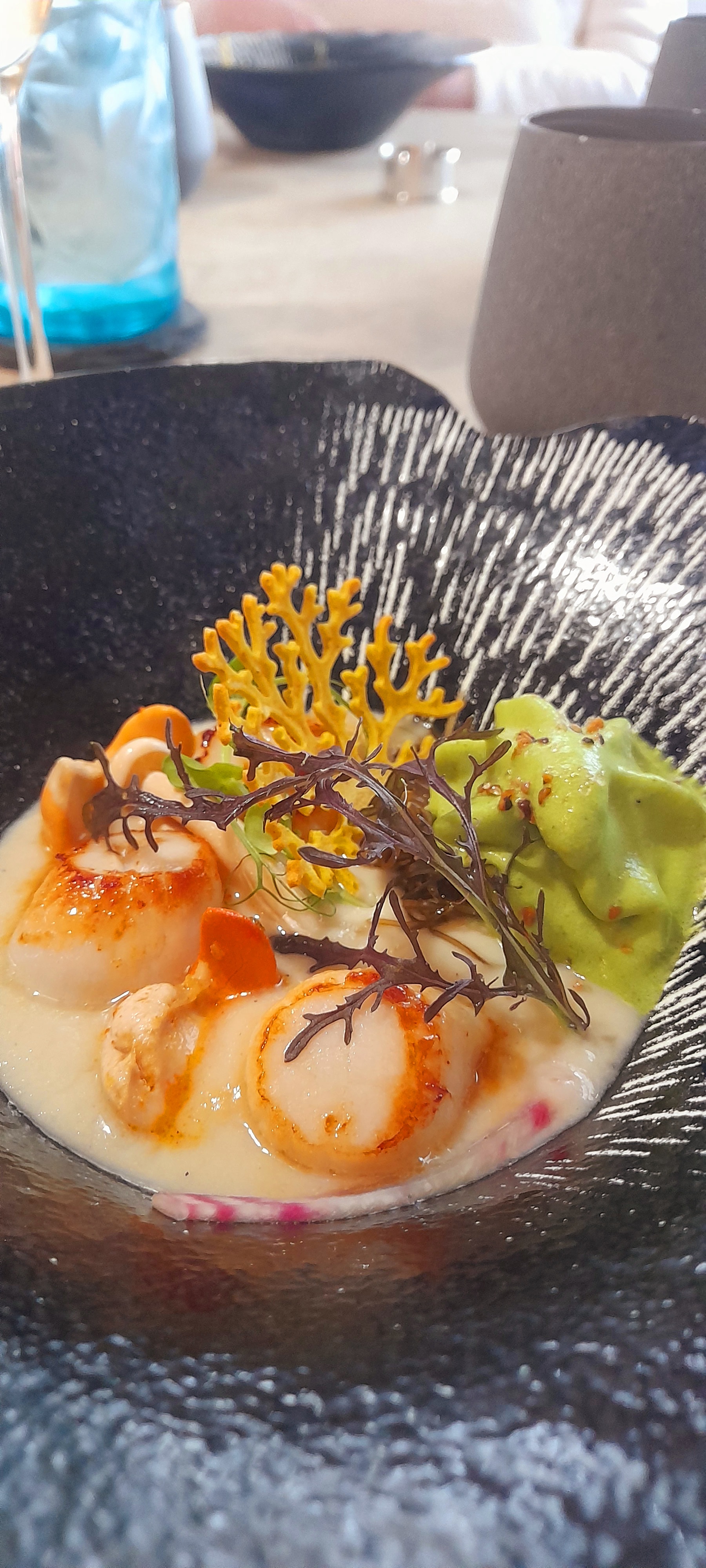 Cuisine très originale, avec beaucoup de goût et de saveurs. Un plaisir des sens et du palais ! Ça peut ne pas plaire à tt le monde car c'est forcément très marqué. On regrette l'absence de menu : seul le menu Gourmet était présenté sur une ardoise, le reste de la carte débité oralement, du coup on ne retient rien. Quant au menu du jour, il ne ns a pas été présenté et on ne l'a vu affiché dehors qu'en sortant... Par contre en période de COVID le chef de salle avec le masque sous le nez au début du repas puis sous la bouche, ce n'est pas top... Enfin ds un établissement de ce niveau, un service autrement qu'en Jean et converse serait apprécié