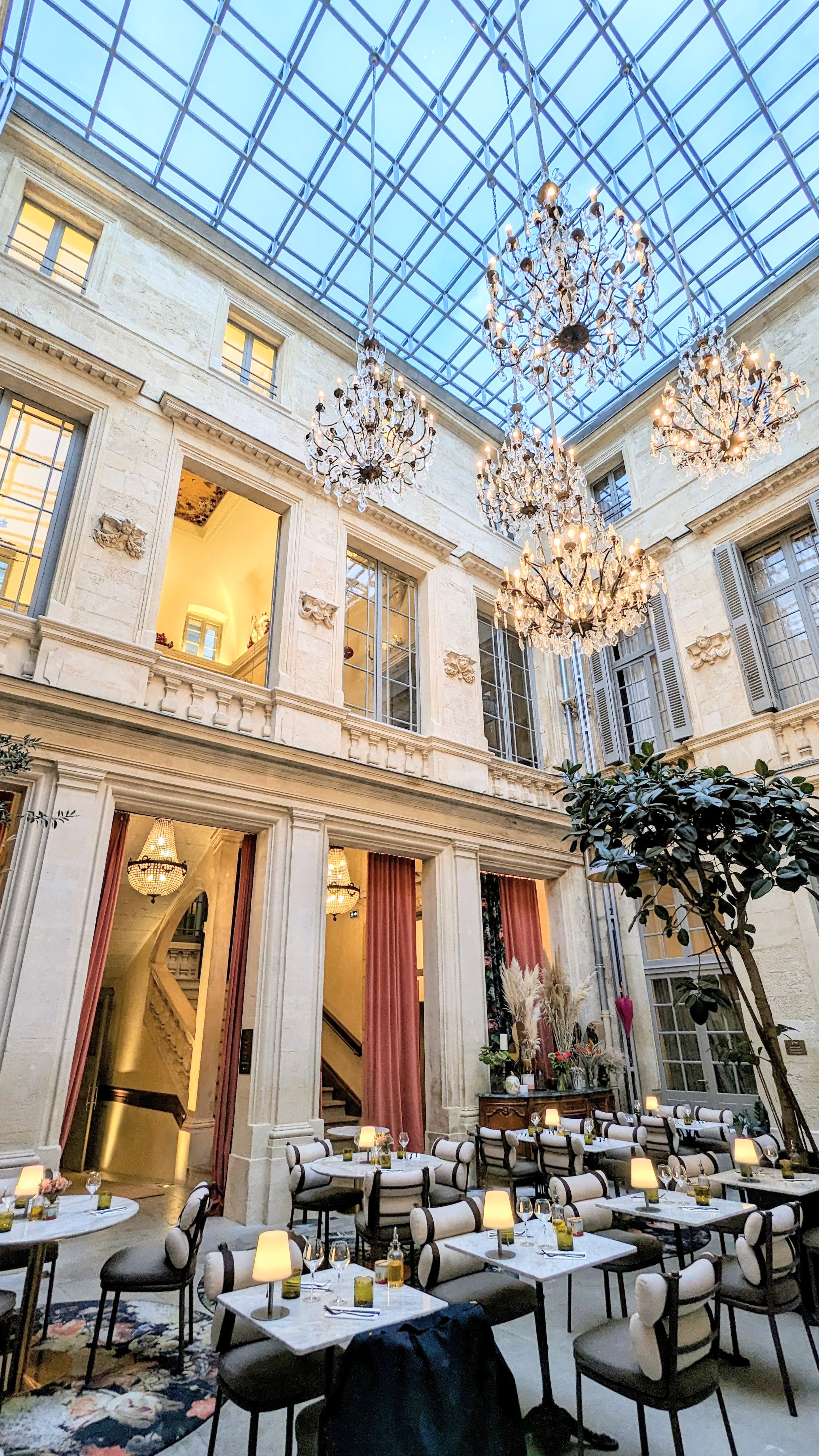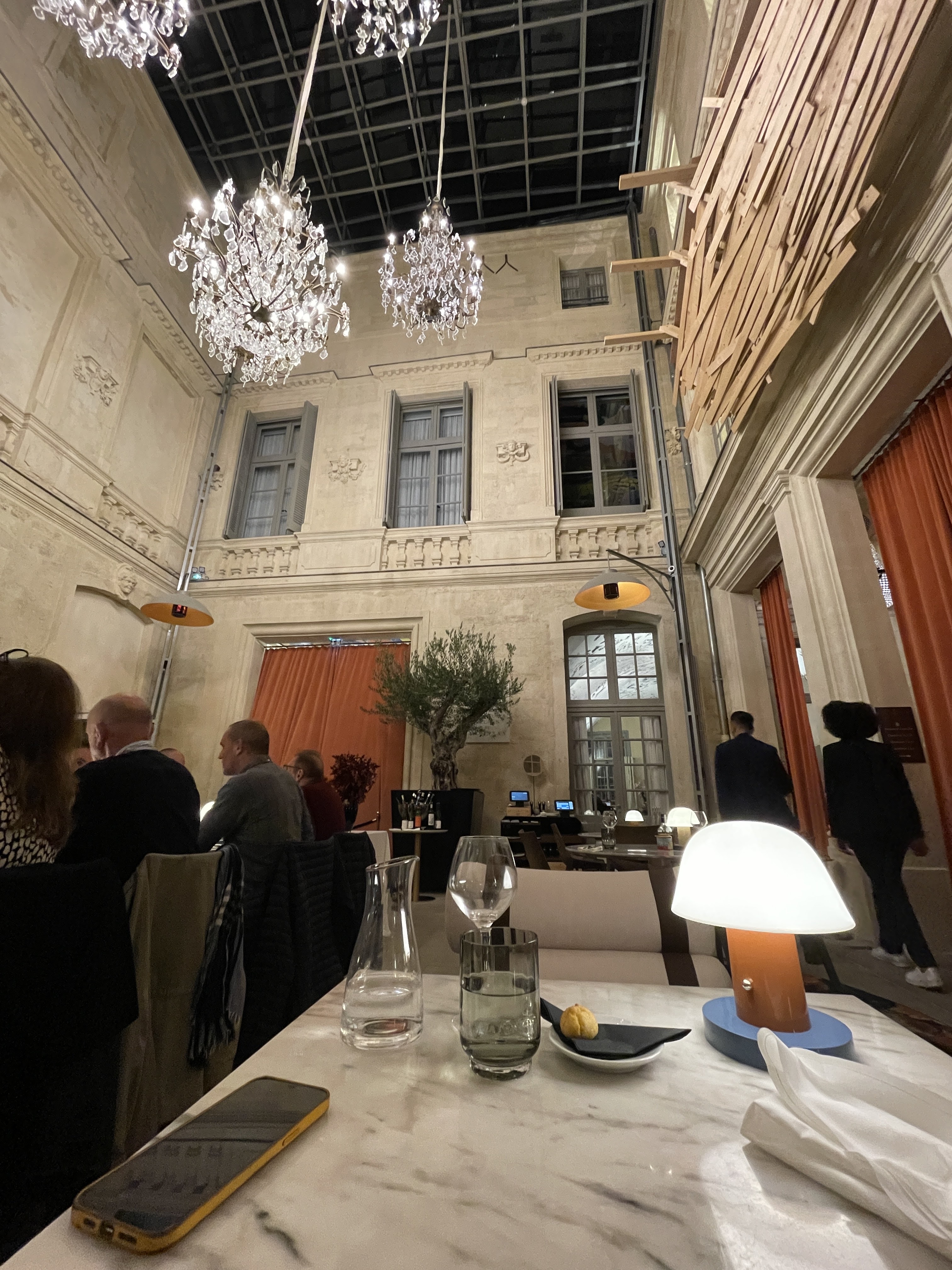 Hôtel du 17 eme réhabilité à l’occasion du retour des frères Pourcel avec au rendez vous un nouveau « jardin des sens » au rez-de-chaussée de ce merveilleux hôtel. L’endroit en effet est un magique patrimoine très bien restauré escalier immense 17ème en pierre et balustrades grande cour de réception de plus de 25m de haut murs avec sculptures en pierre personnages et motifs géométriques sculptés un sorte de toit moderniste en verrière en appui sur des montants indépendants de l’immeuble pour le préserver. A l’étage intermédiaire un magnifique Bar à la hauteur gigantesque; le plafond est illuminé d’une exceptionnelle œuvre réalisée avec des ailes de scarabées qui forme un sorte de couple d’oiseaux de paradis, fascinant et beau. J’ai pris une chambre au premier étage donnant sur la place de la Canourgue. Chambre pratique et esthétique fonctionnelle et belle de décoration douce et cosy. Je suis ici aussi pour enfin pouvoir retrouver la cuisine culte des frères Pourcel et leurs équipes en me réjouissant à l’avance d’un voyage gastronomique en tous sens, aventure des goûts et des saveurs. Attente totalement comblée avec un point important sur chacun des membres de cet orchestre de la réception au service, sommelier intelligent discret et de conseils éclairés,Mr Pourcel qui nous a servi quelques plats sur les 16 chacun unique nous a parlé de sa démarche des goûts des saveurs et des produits. Soirée lumineuse et enchantée bravo à tous pour votre sincérité endroit à préserver, restez aussi prévenant malgré le succès qui ne cesse de grandir et qui est largement mérité.