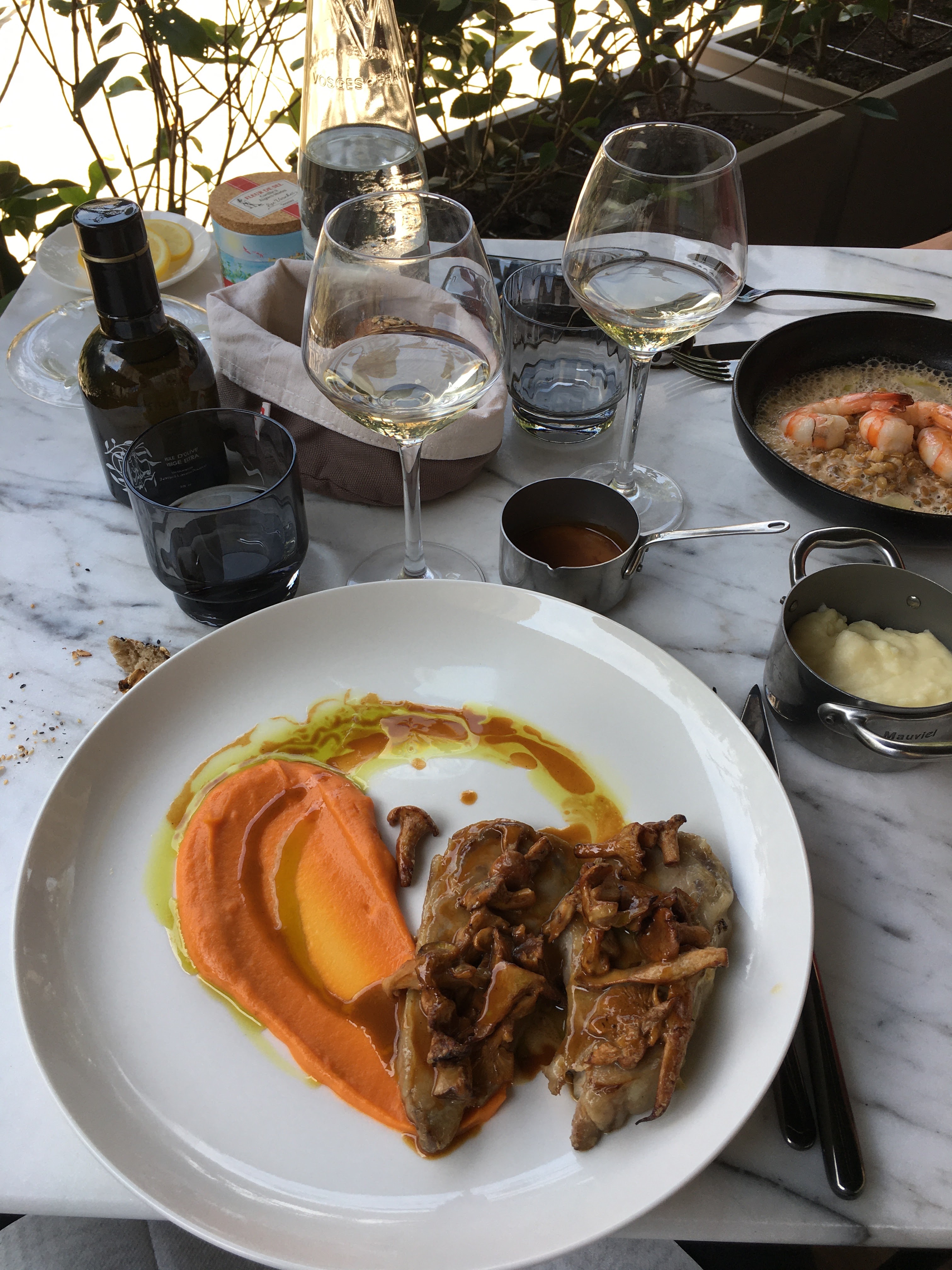 Dîner au Bistronomique-la-Canourgue. Le service quelquefois un peu gauche.. est vite pardonné grâce à l'attention et à la bienveillance du personnel .Pourquoi ai-je été déçue par le pâté en croûte ? je m'attendais à une présentation plus noble ; je l'ai un moment cru sorti de l'étal du charcutier ! un peu de foie gras honorable cependant au goût parfaitement équilibré. La pièce de veau était parfaite, rosée, savoureuse ; le nuage Panacotta simple sans trop de sucre ajouté. Merci à Stéphane de m'avoir fait découvrir l'Elytre où je reviendrai pour un cocktail et pour son décor sublime. Il reste à découvrir le jardin des Sens où là je m'attends à de la gastronomie de Grands Chefs. A suivre ....