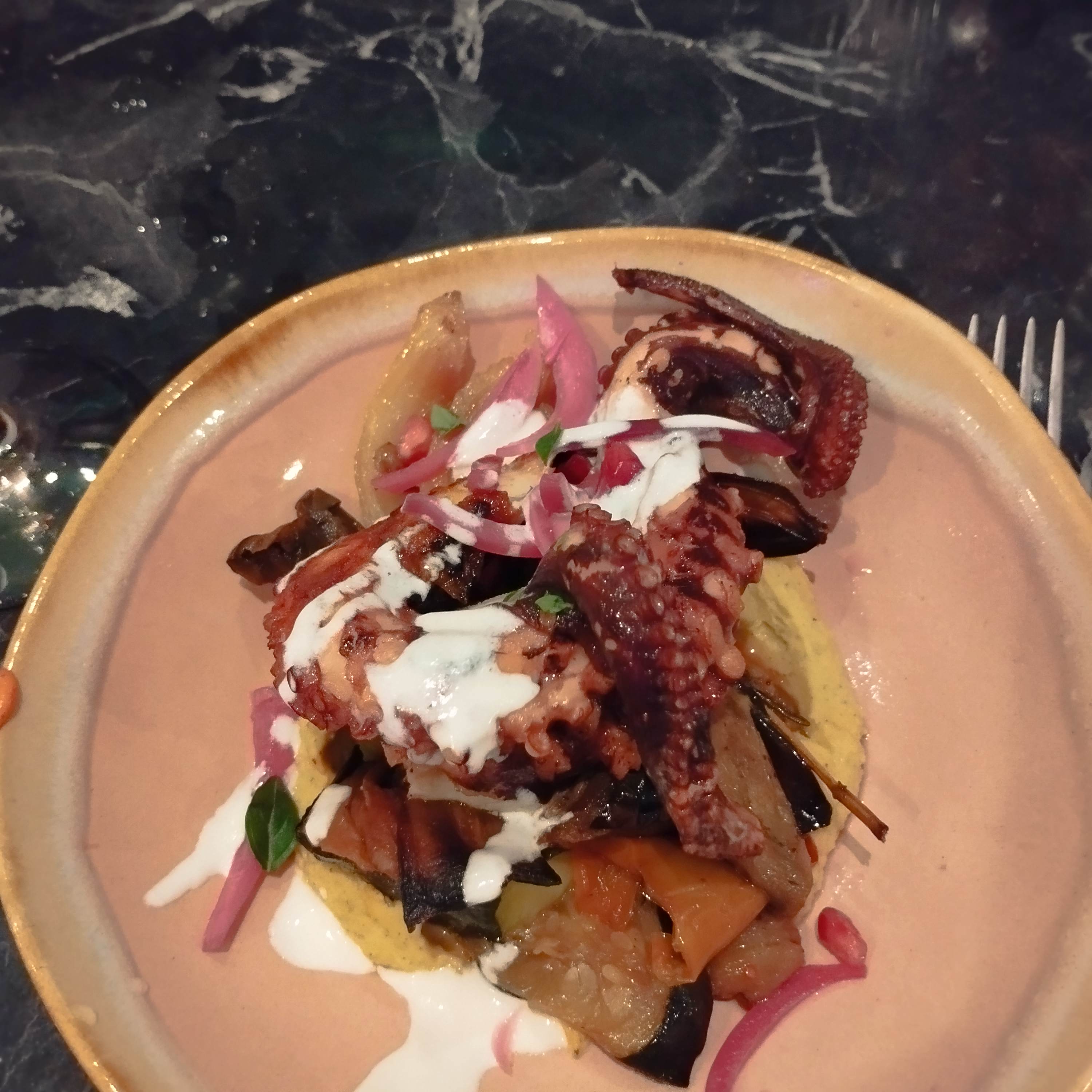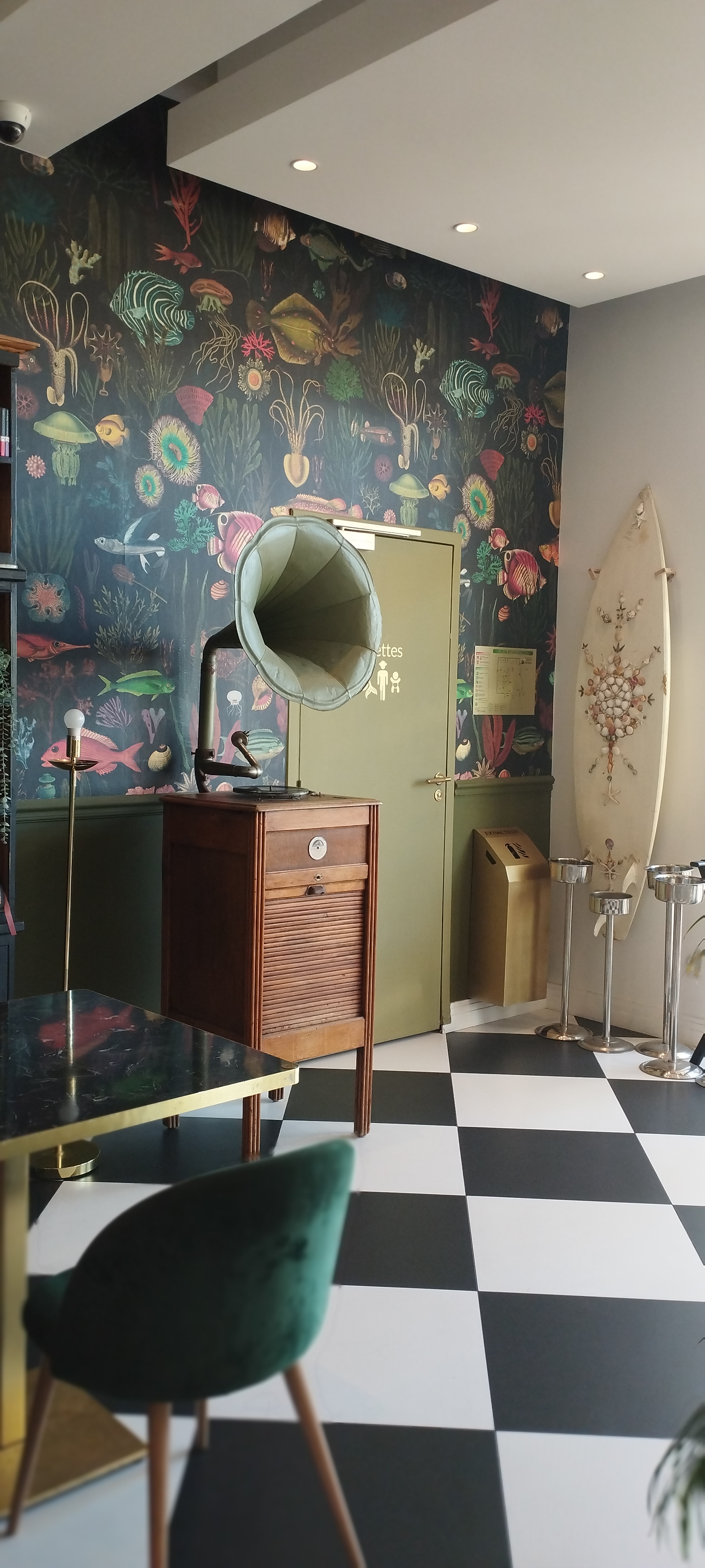 Le décor original est de très bon goût, j'ai adoré la table flamant rose, et la mosaïque du comptoir, et beaucoup d'autres détails, que je ne peux citer ici ce serait trop long. Le personnel à l'écoute est efficace et attentionné. Nous y avons consommé un verre accompagné de tapas très bien présenté et goûteux poisson cru magnifiée de pêches et fraises, délicieux ... Belle endroit à recommander