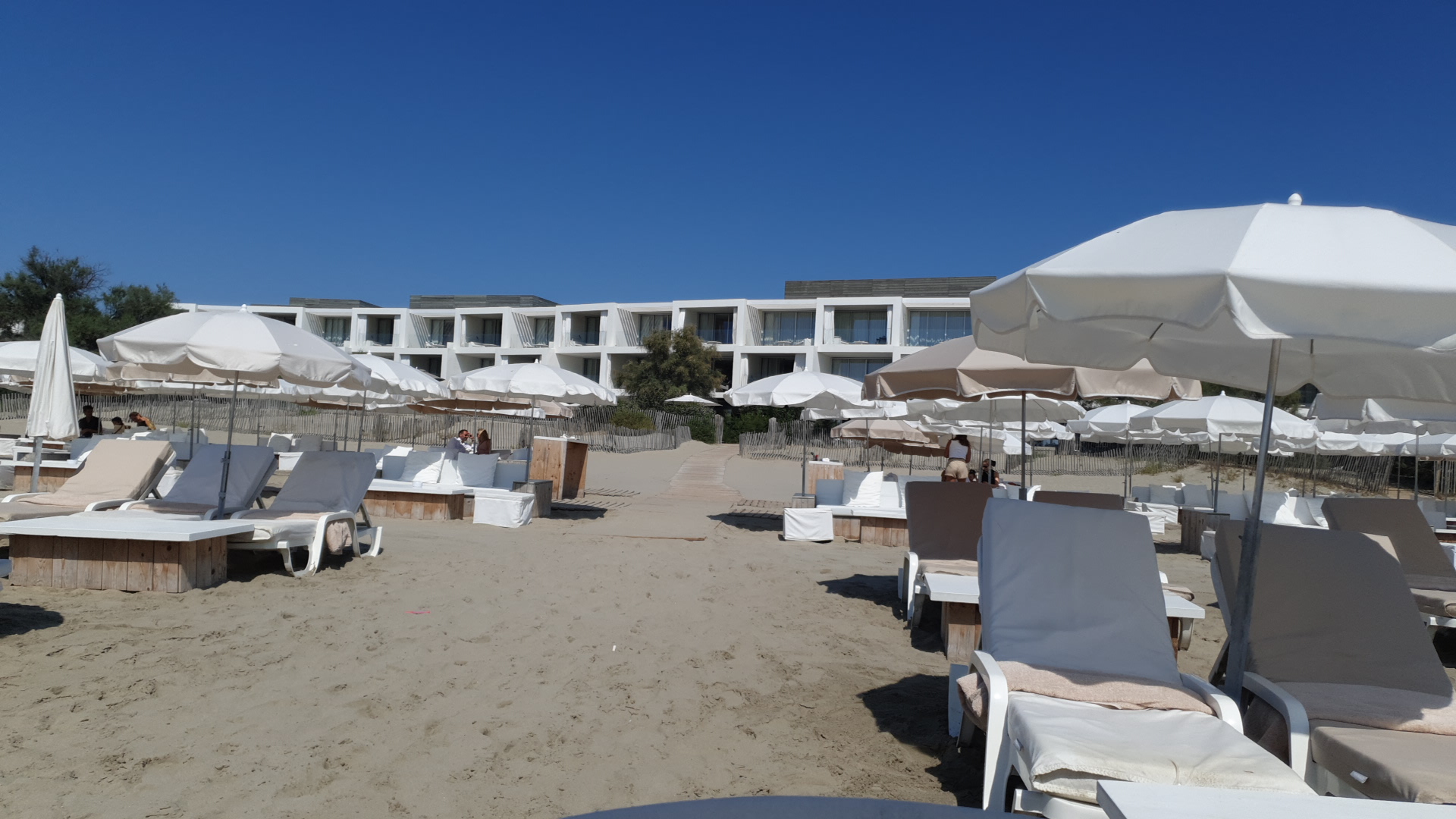 Plage très grande, pas très chaleureuse. Réservation oubliée et aucun service de la part des plagistes. Si on ne les appelle pas, ils ne viennent pas. 30 euros le transat, et même pas une bouteille d’eau. Il faudrait améliorer la prise en charge des clients qui ne sont pas de l’hôtel, sinon ne pas les accepter.