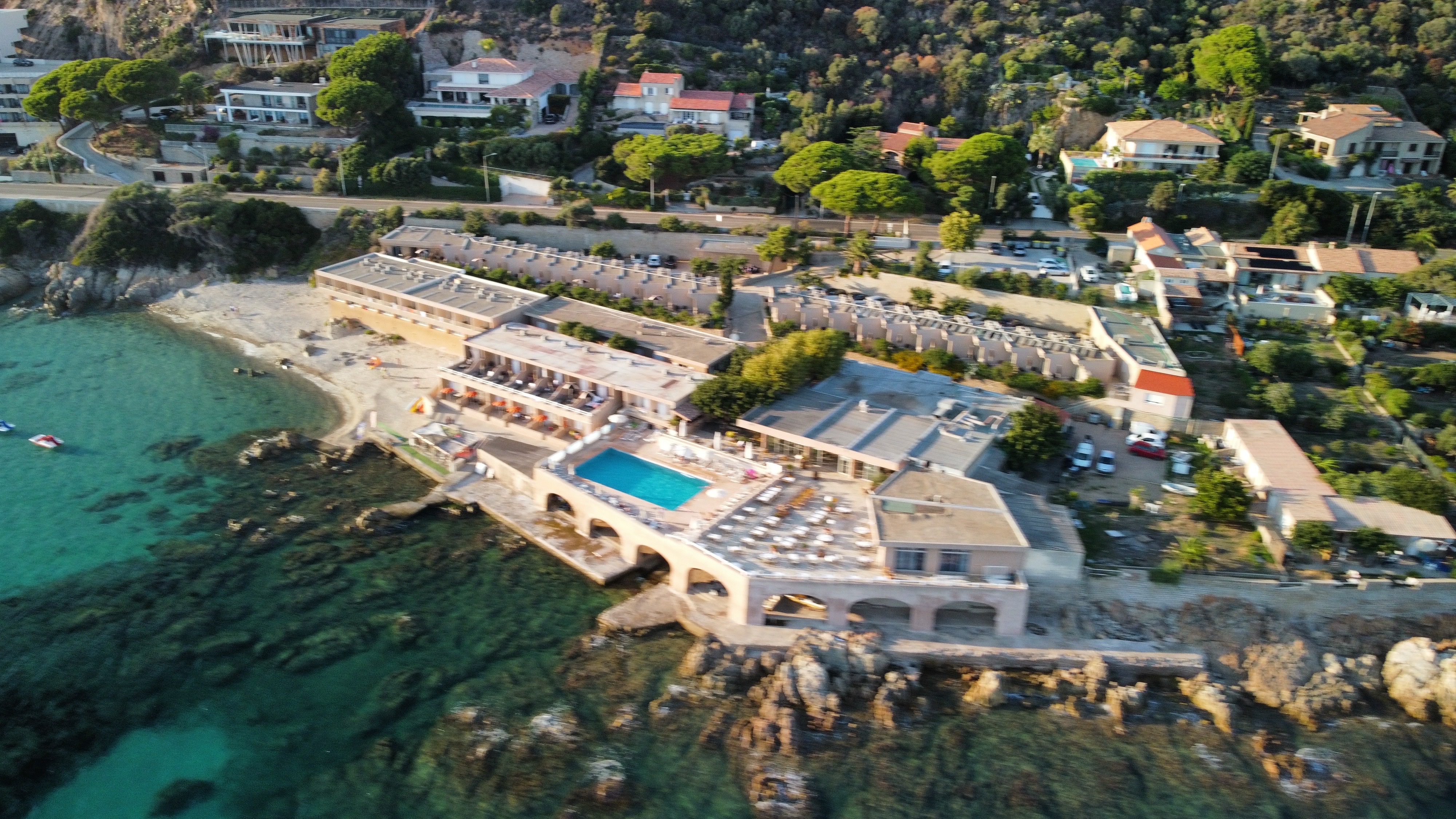 Établissement avec, vue imprenable sur les îles sanguinaires, piscine, bar, restaurant, petite plage et club de plongée. Certaines chambres vue mer, permettent d'accéder directement à la plage..., après quelques marches.