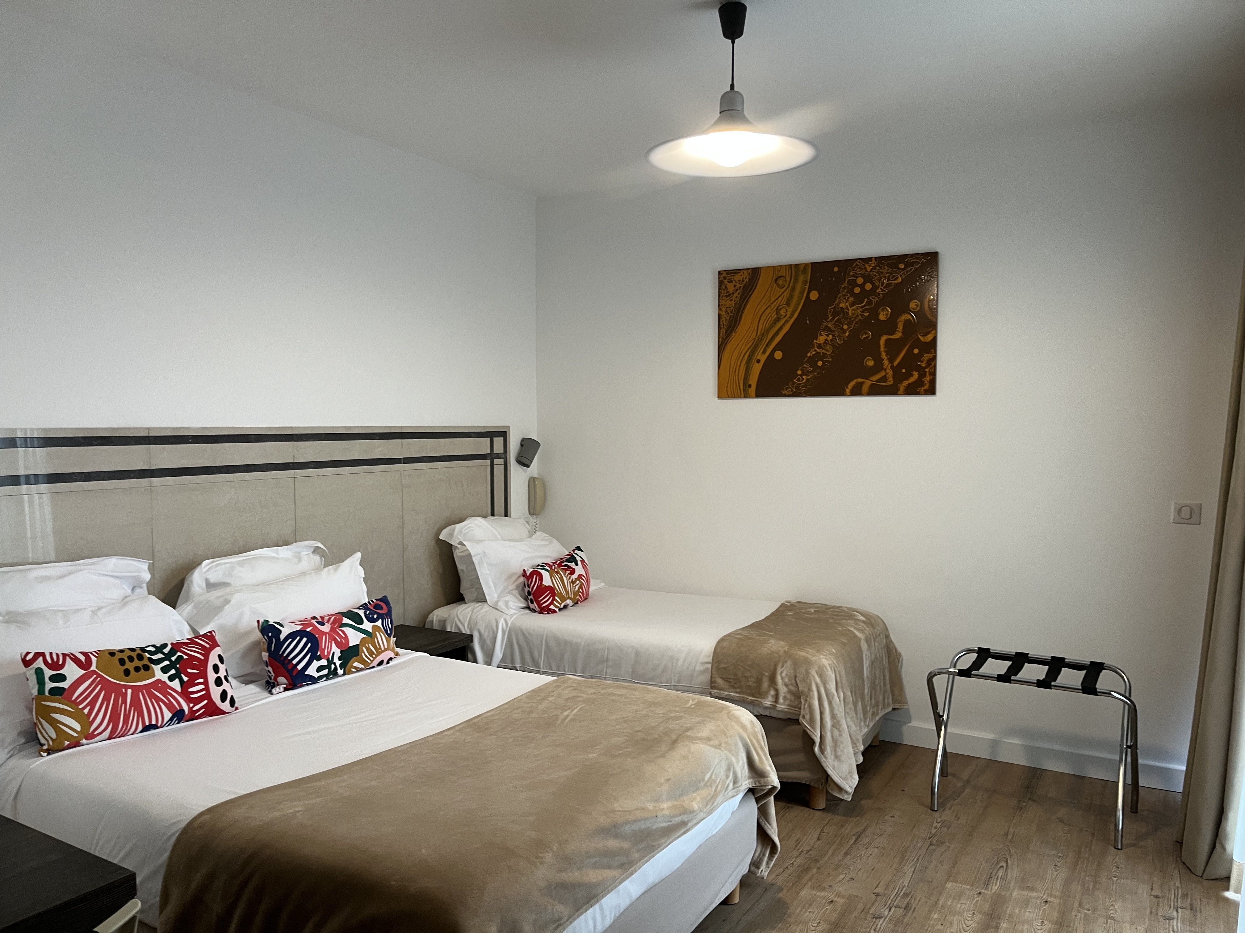 Hôtel vieillot, 3 étoiles usurpées, tarif injustifié :130 e la chambre pour 2 personnes, réservée 6 mois avant, qui au lieu d'offrir les 2 lits jumeaux demandés, vous refilent 1 lit en 140 et 1 canapé... A vous de faire votre implantation !! De plus, chambre difficile d'accès par escalier raide, étroit, et non éclairé le soir. L'isolation du couloir qui dessert les chambres est inexistante. Hôtel soit disant rénové, peut être au siècle dernier, qui présente des rafistolages un peu partout ! En un mot, nous n'y reviendrons pas et je nous nous efforcerons de leur faire la publicité adaptée. Dany B.