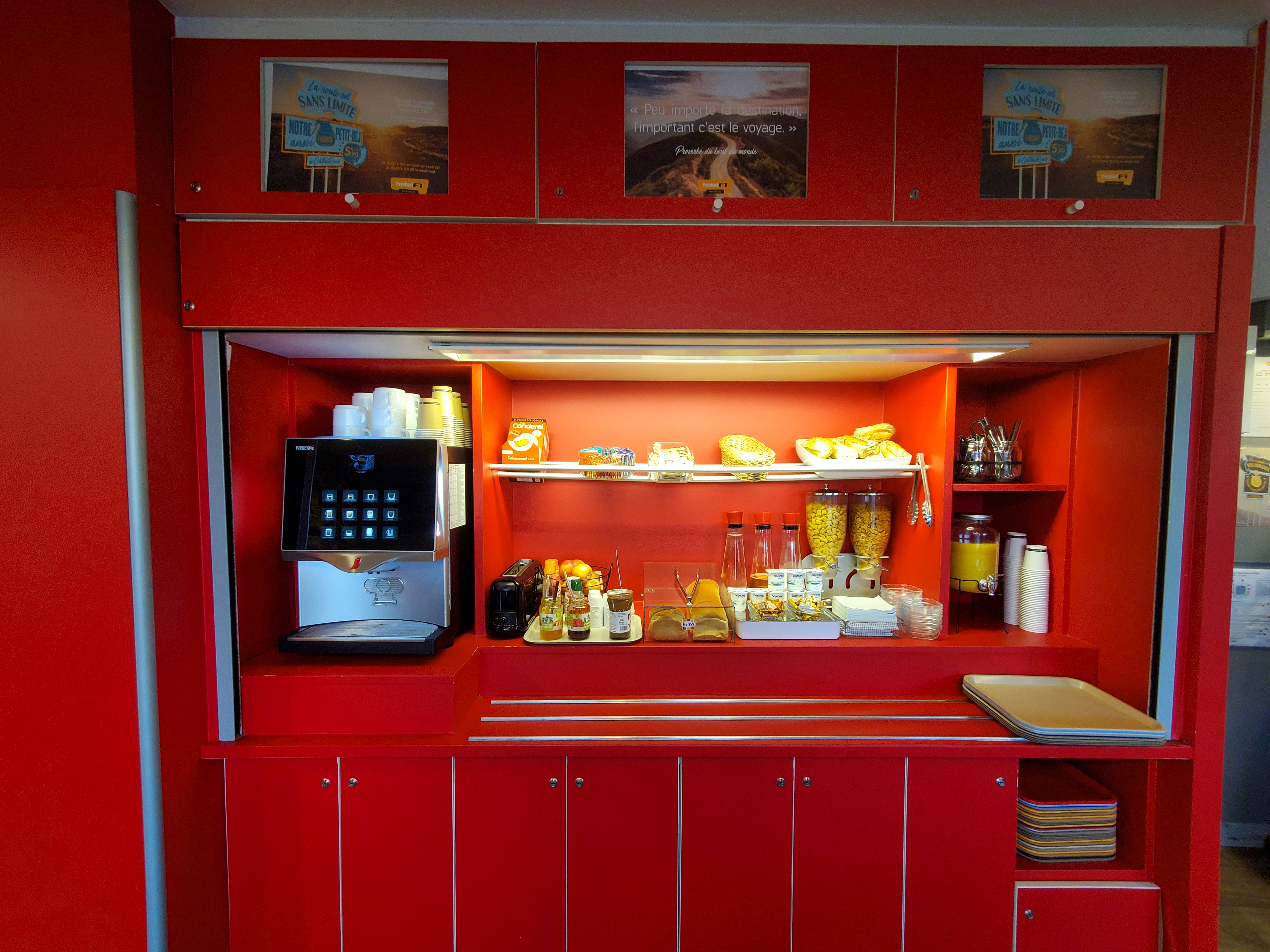 Arrivés le 3/07/22 en début de soirée, réception ouverte 24h/24. Extérieur avec tables à disposition afin de s'y restaurer! Cependant, cafétéria fermée le soir,donc prévoir son encas. Personnels accueillants et serviables. Petit déjeuner,pain frais,brioche , confitures, pâte à tartiner, miel, beurres,jus d'orange, thé, café,yaourt nature,compote... Un choix simple mais très correct. Nous avions réservé une chambre avec douche et toilettes,elle manquait un peu d'espace mais pour une étape ça passe.... Niveau propreté c'était correct. Je recommande cet hôtel.