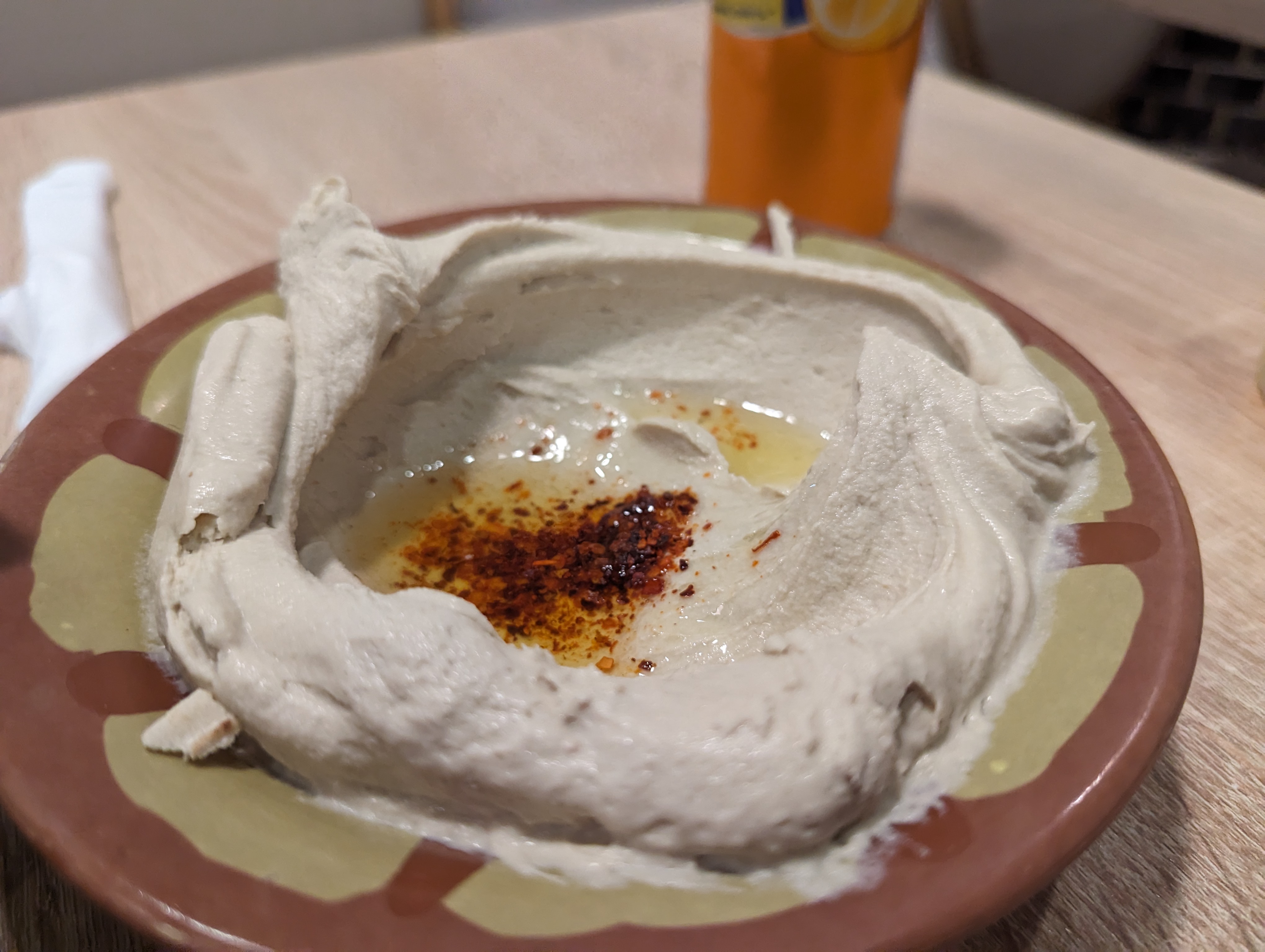 Assiette de houmous savoureuse. Service sympathique, ils m'ont même permis de recharger la batterie de mon smartphone.